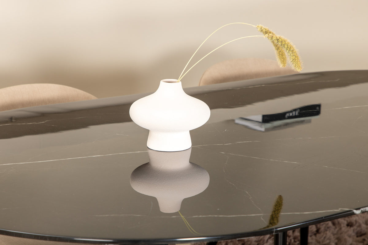Stilfuldt, luksuriøst og indbydende - spisebordet Pillan skaber et modebevidst indtryk og en behagelig atmosfære i dit hjem! Det ovale design og den overordnede udformning er velovervejet med en tynd topplade i sort marmor glas og to stabile bordben i sort metal. Borddimensioner: Længde: 180 cm, Bredde: 100 cm, Højde: 74 cm. Her sammen med 4 af vores fancy spisestole Velvet i beige polyesterlinned og smalle stoleben i jern. Stolens dimensioner: Højde: 76,5 cm, sædehøjde: 46,5 cm, bredde: 50 cm, dybde: 57 cm. Den høje siddekomfort i stolene inviterer til lange og vidunderlige stunder for socialisering!