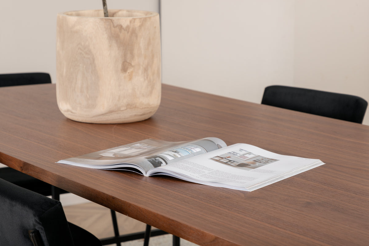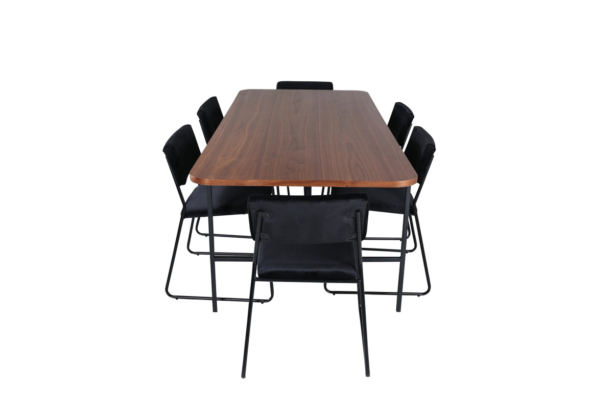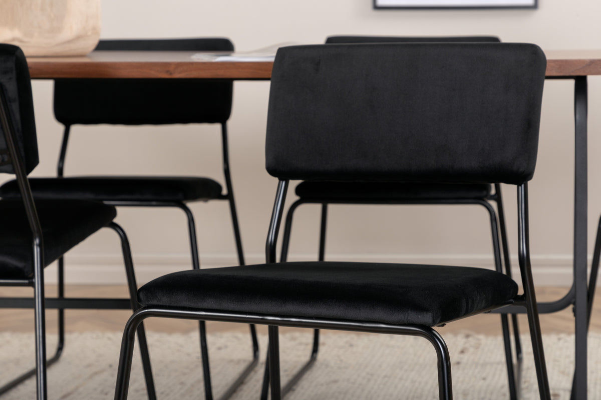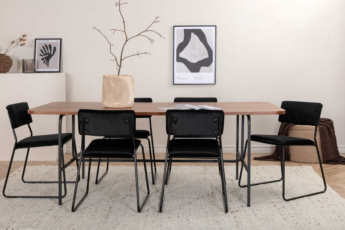 Stilfuld og luftig madgruppe til alle lejligheder - indret stuen smart og indbydende! Spisebordet Uno er rektangulært designet med let afrundede hjørner, en topplade i valnødfarvet MDF med finer og et stilfuldt understel i sort metal. Bordmål: Længde: 200cm, Bredde: 90cm, Højde: 74cm. Her i slank kombination med 6 Kenth spiseborde i minimalistisk design. Stolebenene er stilfuldt smalle i sort jern, og sæderne er i sort velourstof. Stolemål: Højde: 76cm, sædehøjde: 48,5cm, bredde: 40cm, dybde: 52cm. Nyd behagelige måltider fremover!