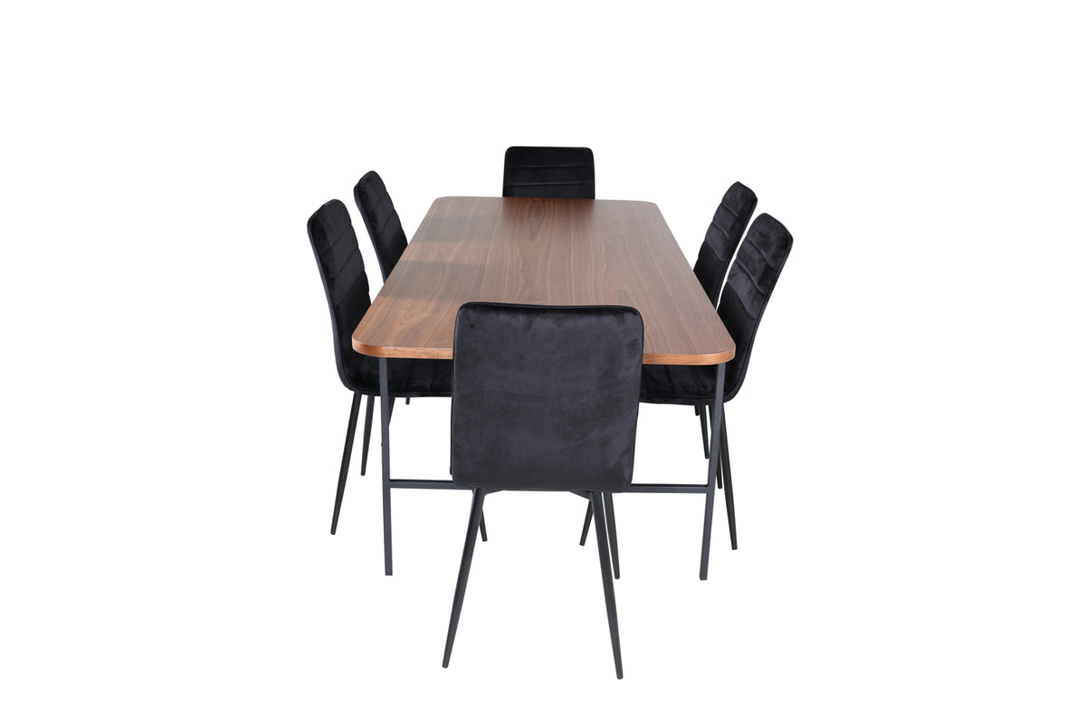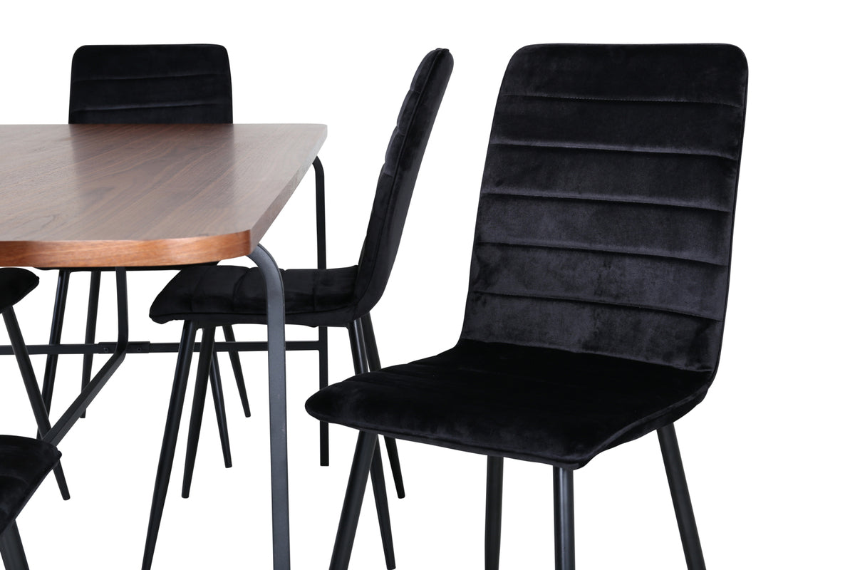Et iøjnefaldende spisegruppe med fokus på komfort og elegance! Spisebordet Uno er rektangulært designet med let afrundede hjørner, en topplade i valnødfarvet MDF med finer og et stilfuldt understel i sort metal. Bordmål: Længde: 200 cm, Bredde: 90 cm, Højde: 74 cm. Her er bordet perfekt matchet med 6 Windu luksus spiseborde i fræk sort velourstof og stoleben i jern. Stolemål: Højde: 94 cm, sædehøjde: 47 cm, bredde: 43 cm, dybde: 49 cm. Lad denne smukt matchede spisegruppe med en moderne følelse blive et naturligt samlingspunkt i dit hjem.