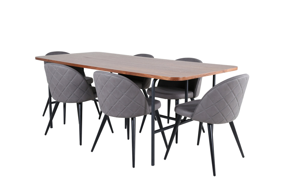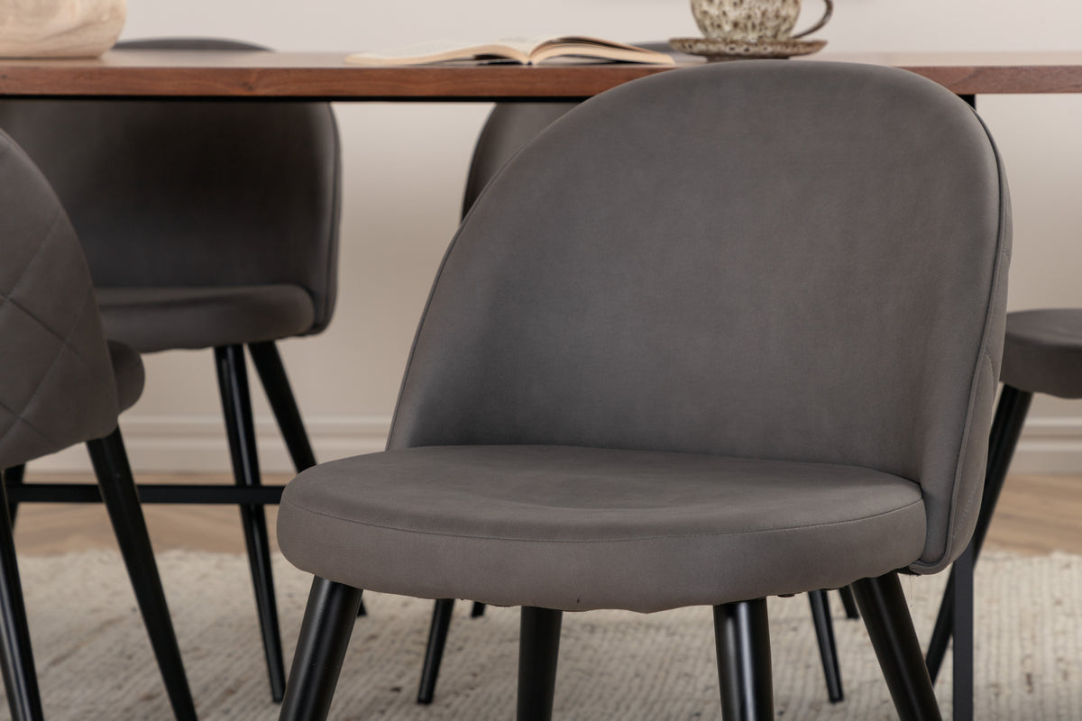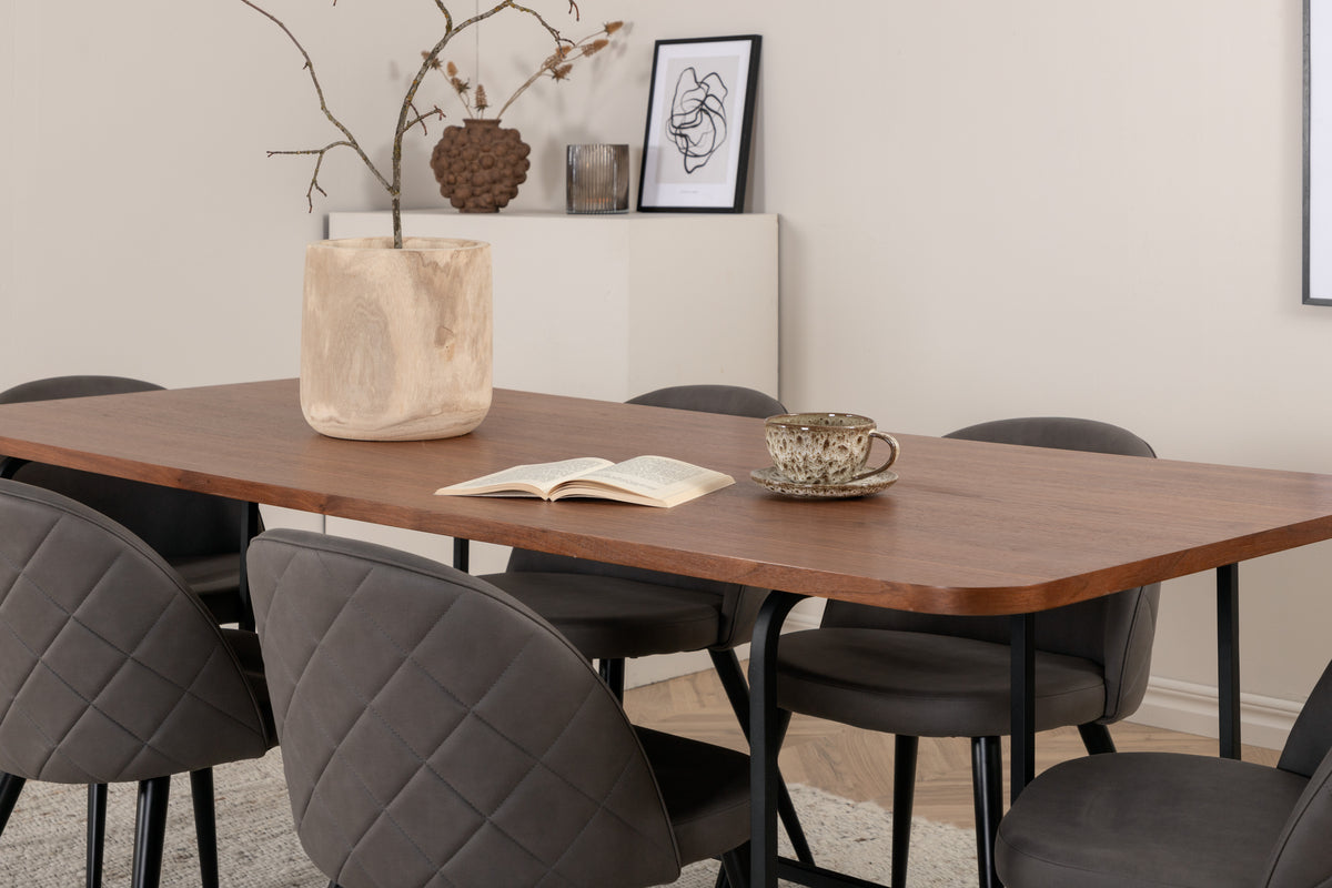 Med det klassiske og moderne spisebord Uno kan hele familien samles til middag og socialt samvær. Bordet er rektangulært designet med let afrundede hjørner, en topplade i valnødfarvet MDF med finer og et stilfuldt understel i sort metal. Bordmål: Længde: 200 cm, Bredde: 90 cm, Højde: 74 cm. Matchet her med 6 Velvet Stitches spiseborde med udvidede, sorte ben i metal og grå sæder i mikrofiber med dekorativ stikning. Stolemål: Højde: 76,5 cm, sædehøjde: 46,5 cm, bredde: 50 cm, dybde: 57 cm. Lad dig inspirere af en iøjnefaldende spisegruppe!