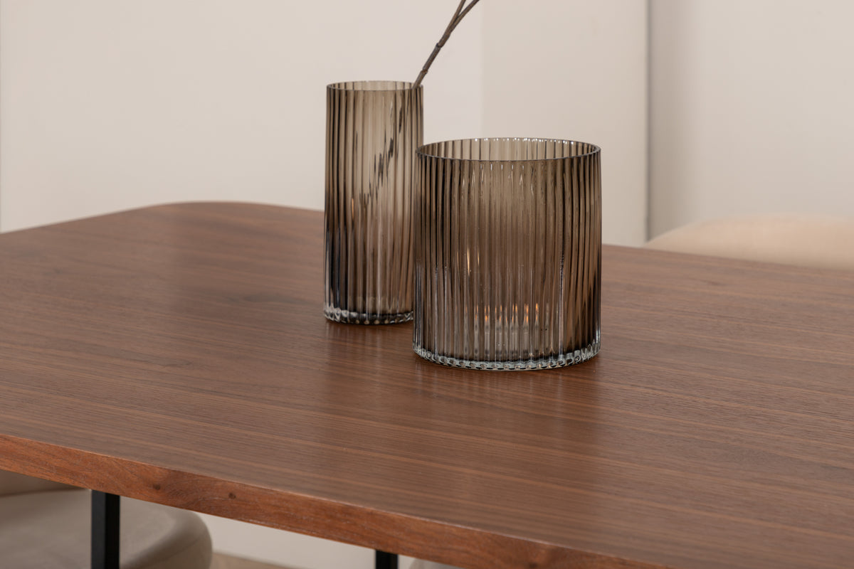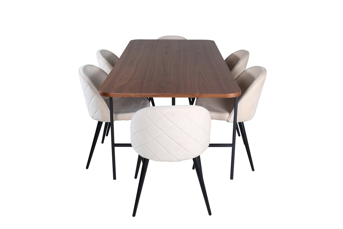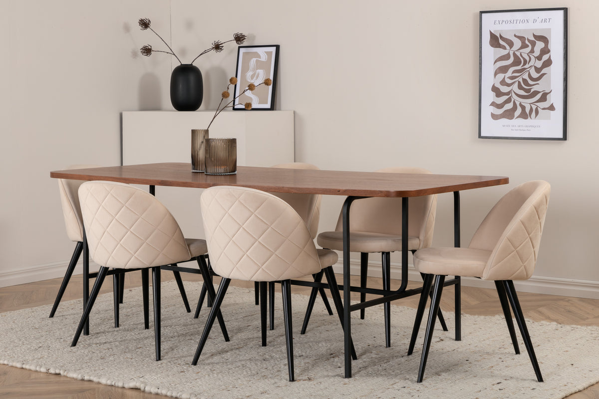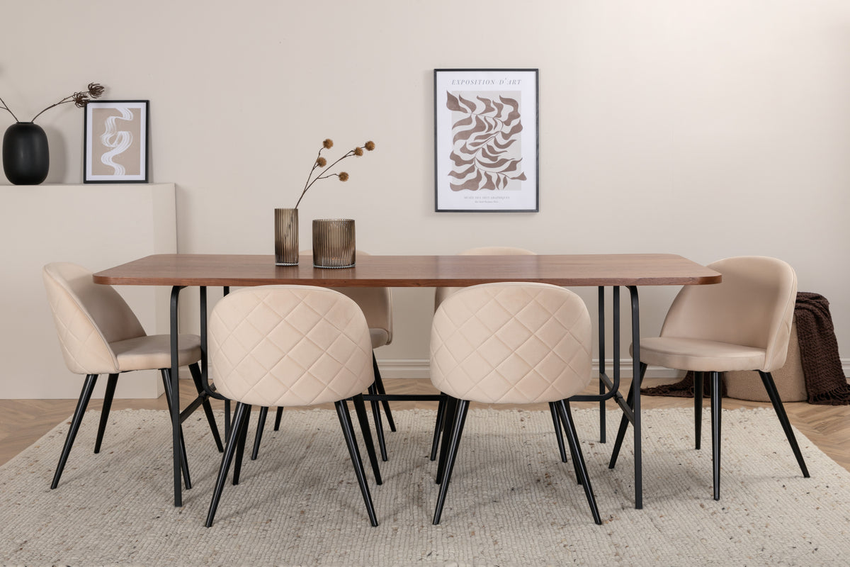 Med det klassiske og moderne spisebord Uno kan hele familien samles til middag og socialt samvær. Bordet er rektangulært designet med let afrundede hjørner, en topplade i valnødfarvet MDF med finer og et stilfuldt understel i sort metal. Bordmål: Længde: 200 cm, Bredde: 90 cm, Højde: 74 cm. Matchet her med 6 Velvet Stitches spiseborde med udvidede, sorte ben i metal og sæder i beige velour med dekorativ stikning. Stolemål: Højde: 76,5 cm, sædehøjde: 46,5 cm, bredde: 50 cm, dybde: 57 cm. Lad dig inspirere af en iøjnefaldende spisegruppe!