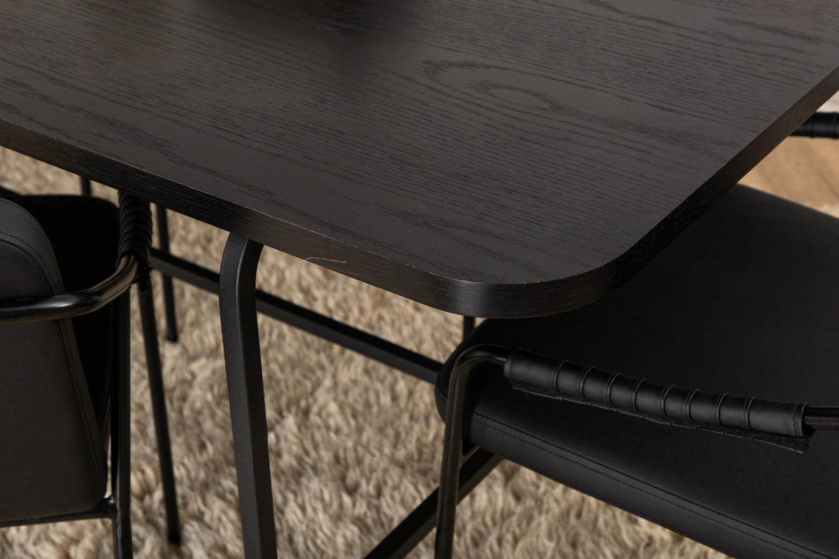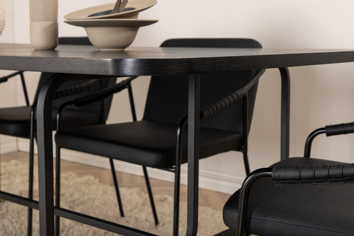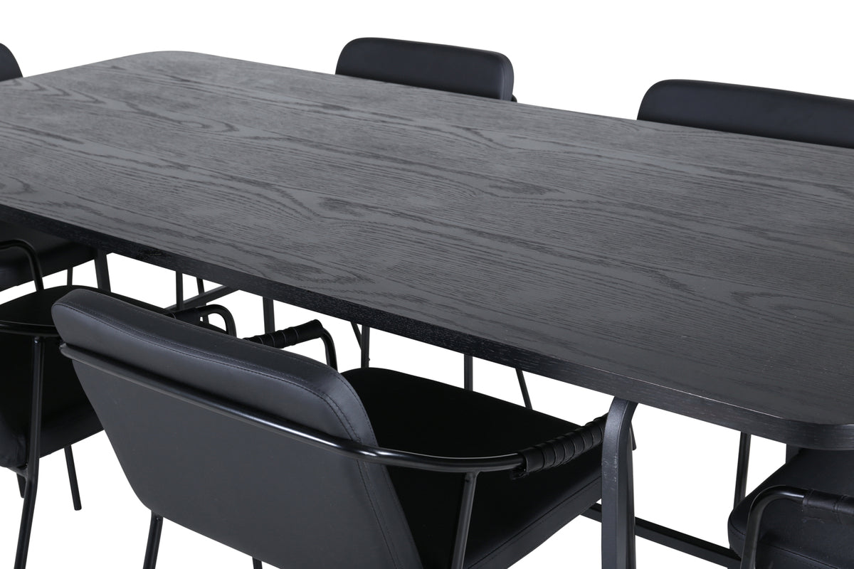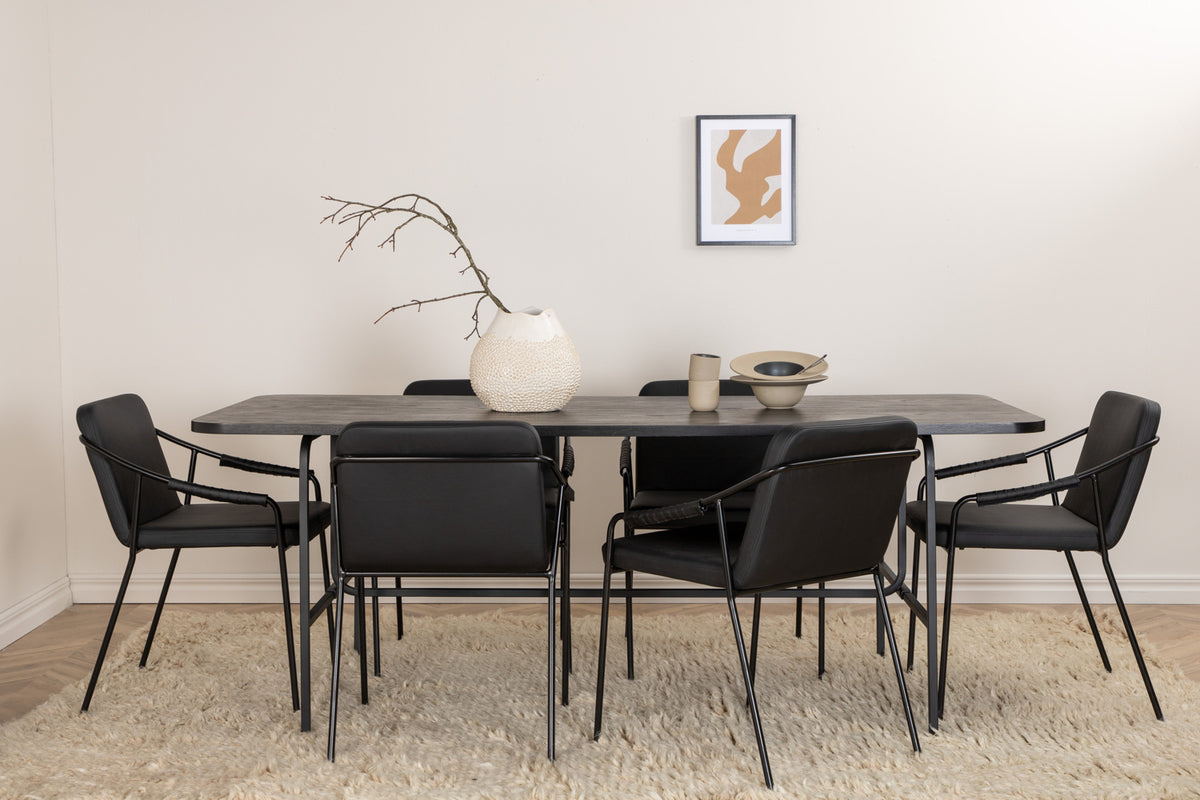 En spisegruppe, der udstråler moderne design og indbydende følelser! Spisebordet Uno er rektangulært designet med let afrundede hjørner, en topplade i sort MDF med finer og et stilfuldt understel i sort metal. Bordmål: Længde: 200 cm, Bredde: 90 cm, Højde: 74 cm. Matchet med 6 Tvist spisebordsstole i smuk design. Sæderne er i sort kunstlæder og har integrerede armlæn samt stoleben i sort jern. Stolemål: Højde: 77 cm, sædehøjde: 48 cm, bredde: 53 cm, dybde: 59 cm. En luksuriøs og stilfuld spisegruppe, der inviterer til lange middagsøjeblikke!