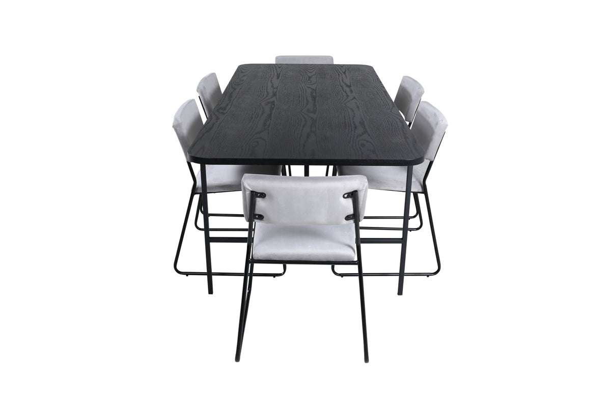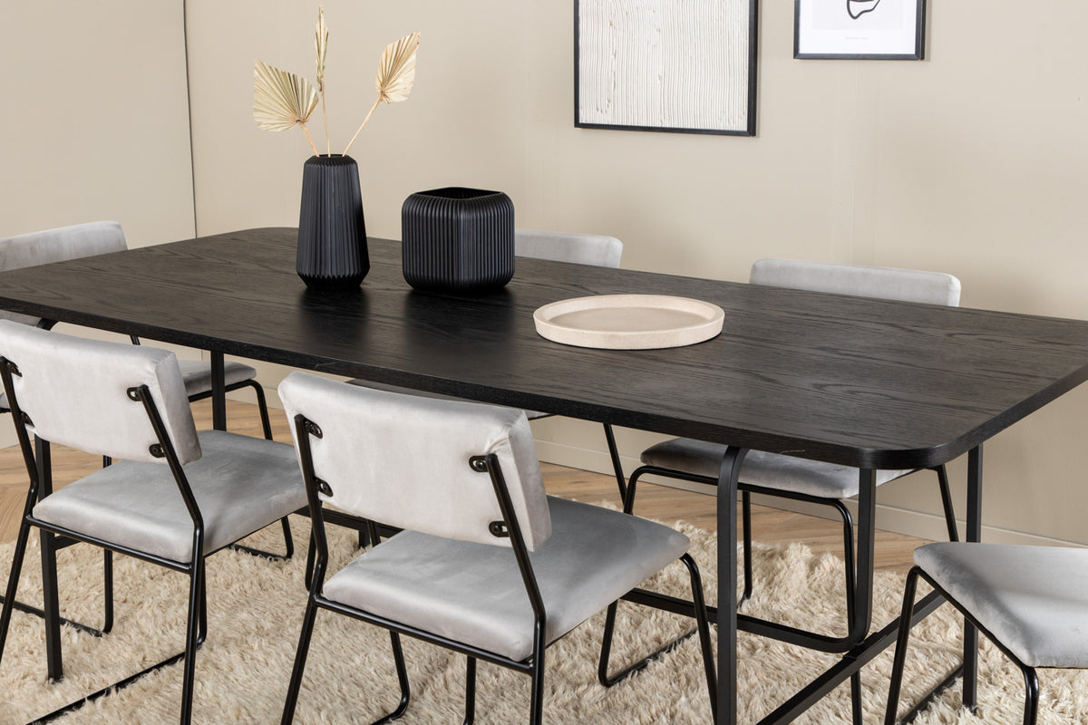 Stilfuld og luftig spisegruppe til alle lejligheder - indret stuen smart og indbydende! Spisebordet Uno er rektangulært designet med let afrundede hjørner, en topplade i sort MDF med finer og et stilfuldt understel i sort metal. Bordmål: Længde: 200 cm, Bredde: 90 cm, Højde: 74 cm. Her i slank kombination med 6 Kenth spisebordsstole i minimalistisk design. Stolebenene er stilfuldt smalle i sort jern, og sæderne er i grå velourstof. Stolemål: Højde: 76 cm, sædehøjde: 48,5 cm, bredde: 40 cm, dybde: 52 cm. Nyd behagelige måltider fremover!