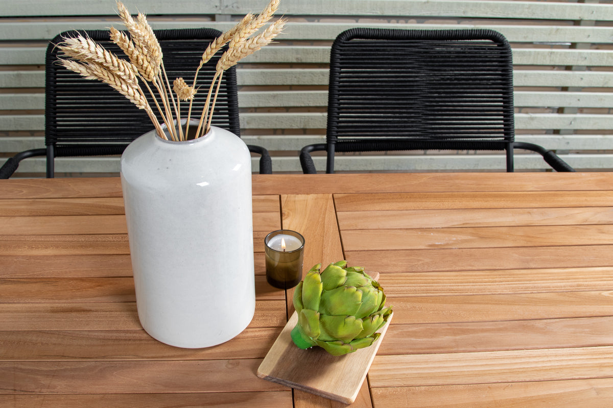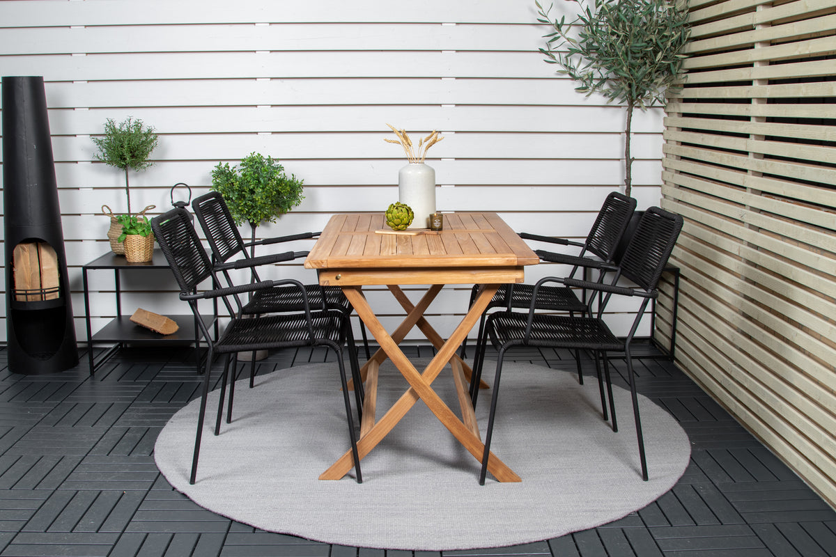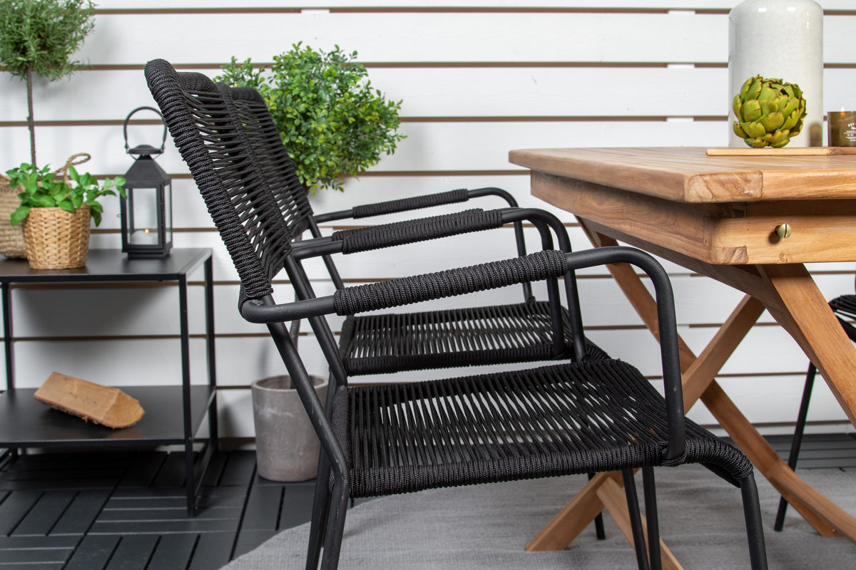 Stilren, trendsikker og komfortabel spisegruppe i skandinavisk design! Vores populære, rektangulære spisebord Kenya har et tidløst design med ribbet udførelse i smagfuld teak. Krydsbenene giver et stabilt og charmerende indtryk. Mål: 120x70 cm. Her i smuk kombination med lækre spisestole fra serien Lindos. Stolene har integrerede armlæn i sort stål og et sæde i slidstærkt, sort reb. Indret indbydende på terrassen og skab et blikfang, der imponerer!