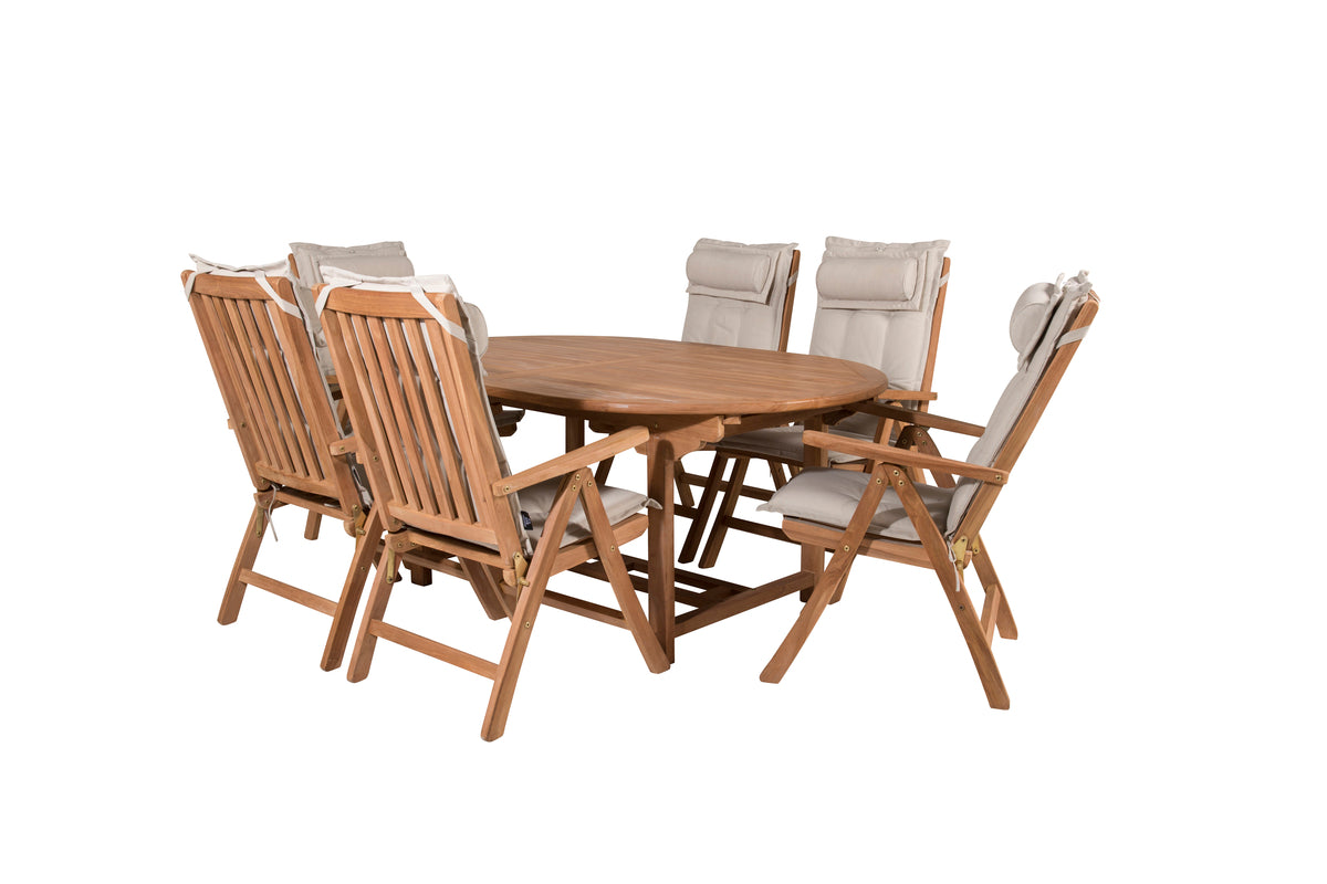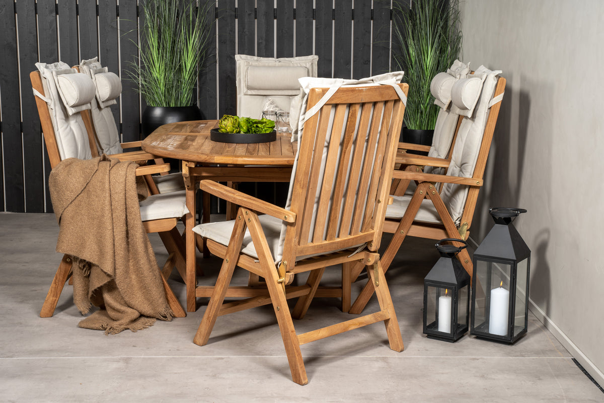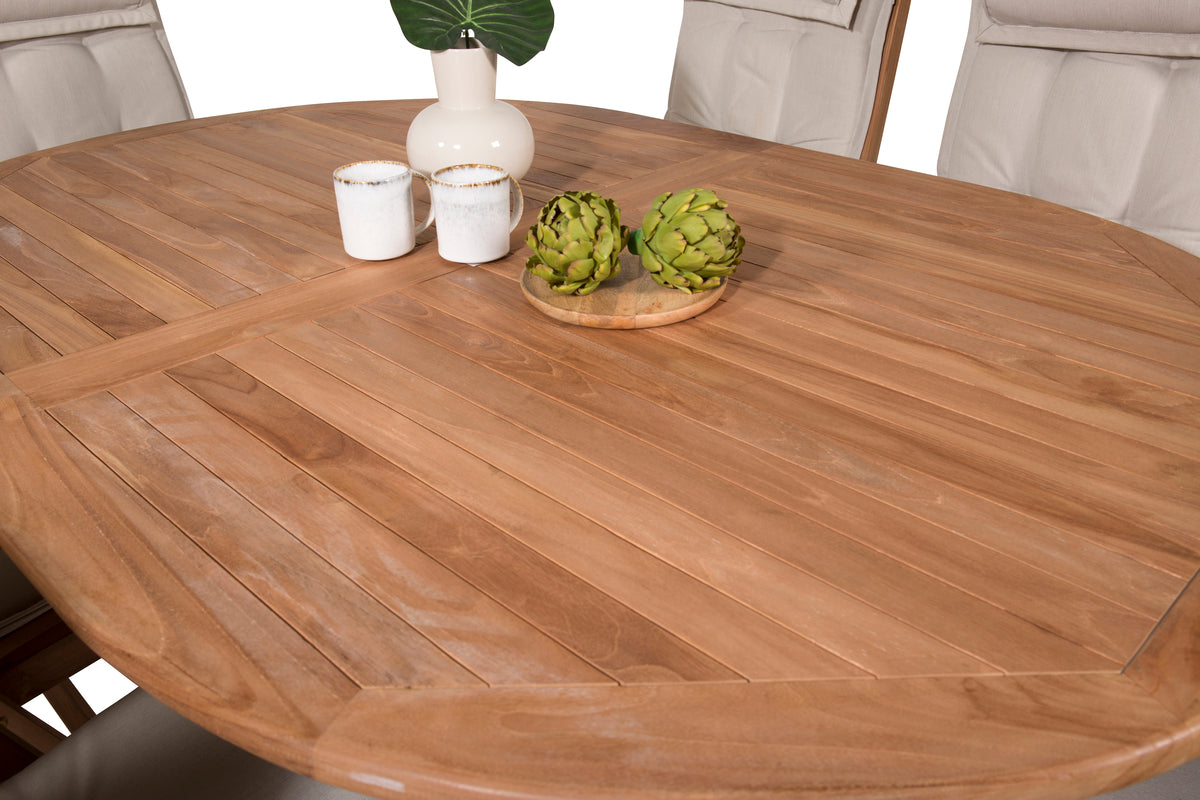 En oval spisegruppe skaber en familiær følelse og sørger for, at ingen havner på kanten! Spisebord Kenya i smagfuld teak imponerer med sin pompøse udformning og skandinaviske design. Bordpladen har en ribbet udførelse, og stellet giver et stabilt indtryk. Mål: 180/240x120 cm. Her i perfekt kombination med 6 stk. komfortable spisestole fra samme serie, som også er i smagfuld teak. Stolene er fældbare for optimal afslapning og har armlæn for ekstra komfort. Læn dig tilbage og nyd hyggelige måltider!