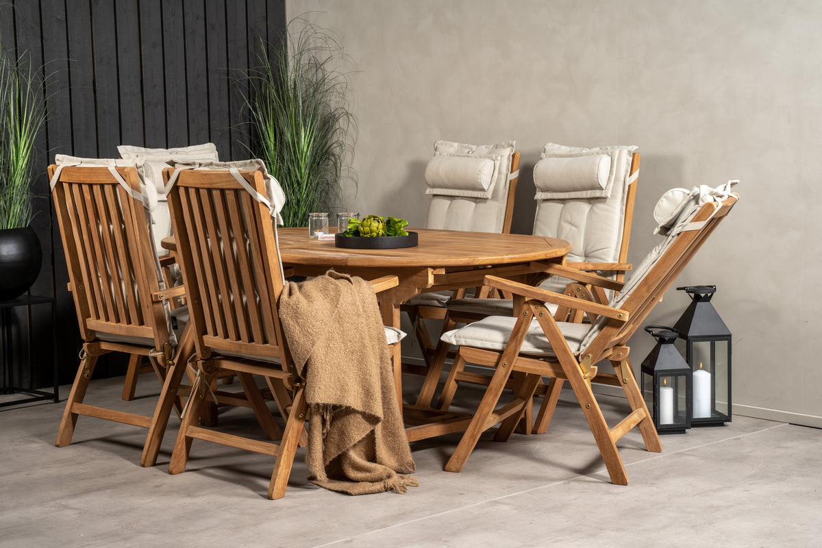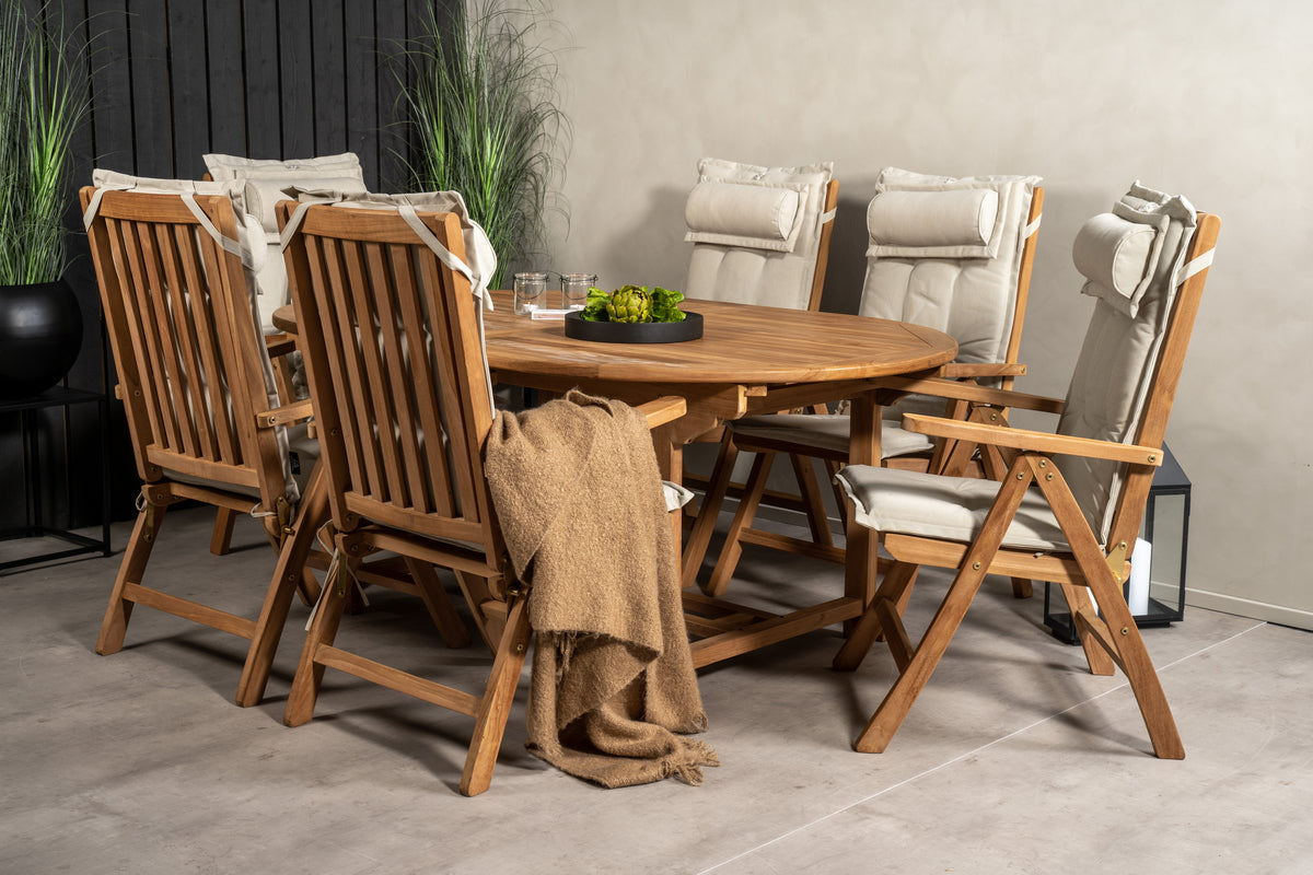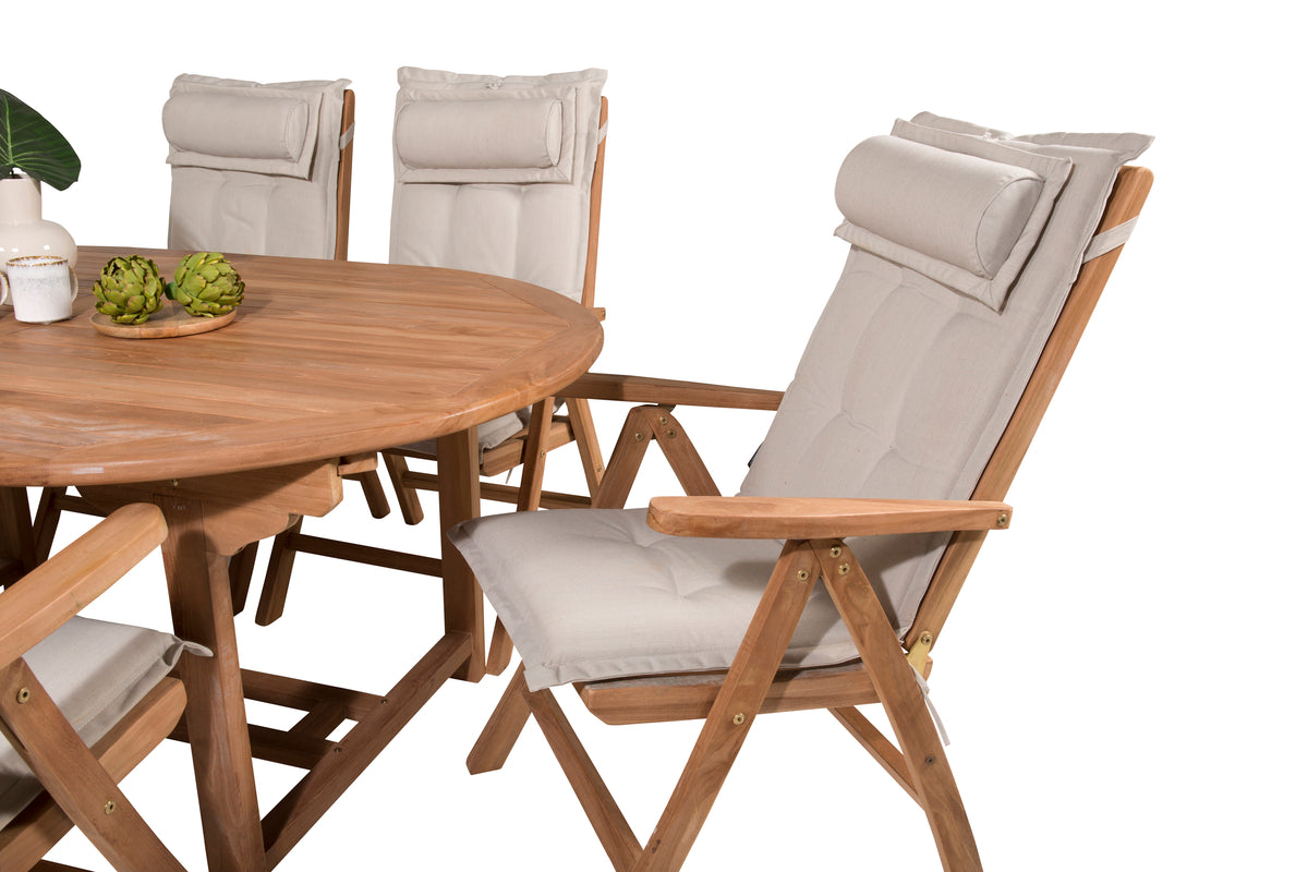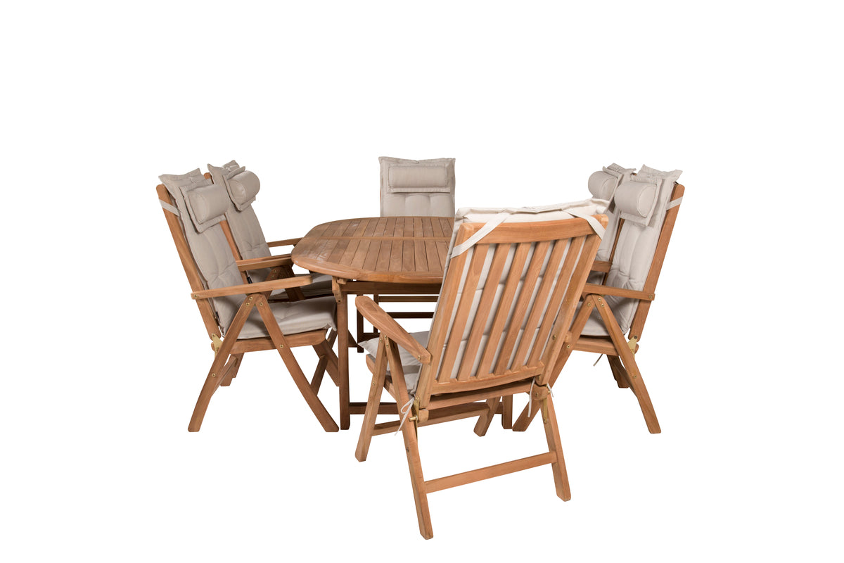En oval spisegruppe skaber en familiær følelse og sørger for, at ingen havner på kanten! Spisebord Kenya i smagfuld teak imponerer med sin pompøse udformning og skandinaviske design. Bordpladen har en ribbet udførelse, og stellet giver et stabilt indtryk. Mål: 180/240x120 cm. Her i perfekt kombination med 6 stk. komfortable spisestole fra samme serie, som også er i smagfuld teak. Stolene er fældbare for optimal afslapning og har armlæn for ekstra komfort. Læn dig tilbage og nyd hyggelige måltider!