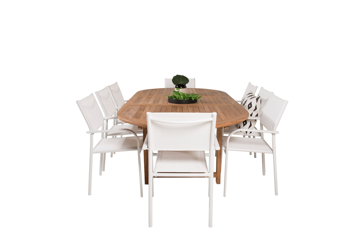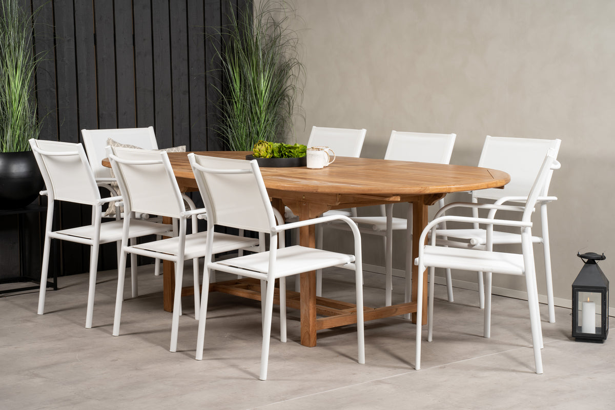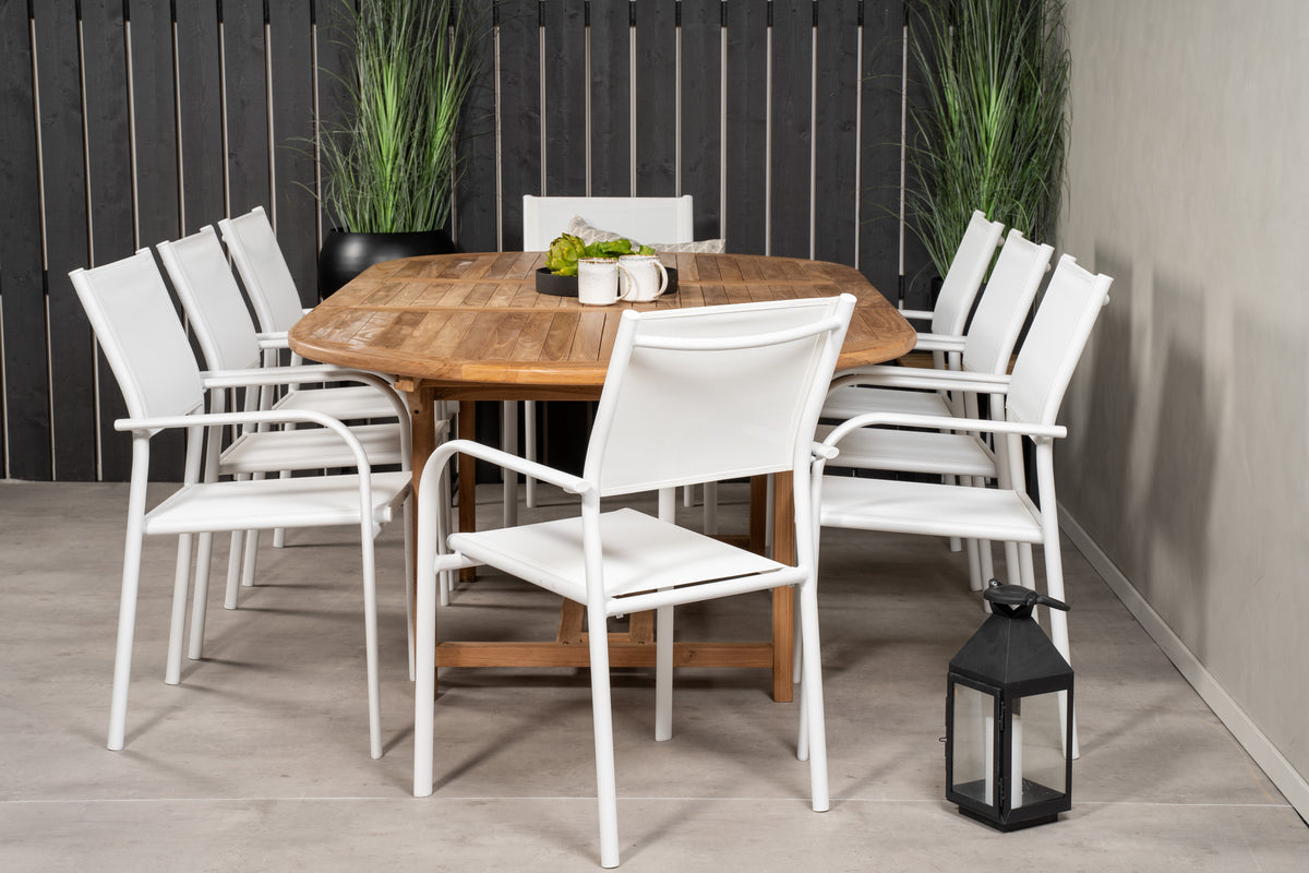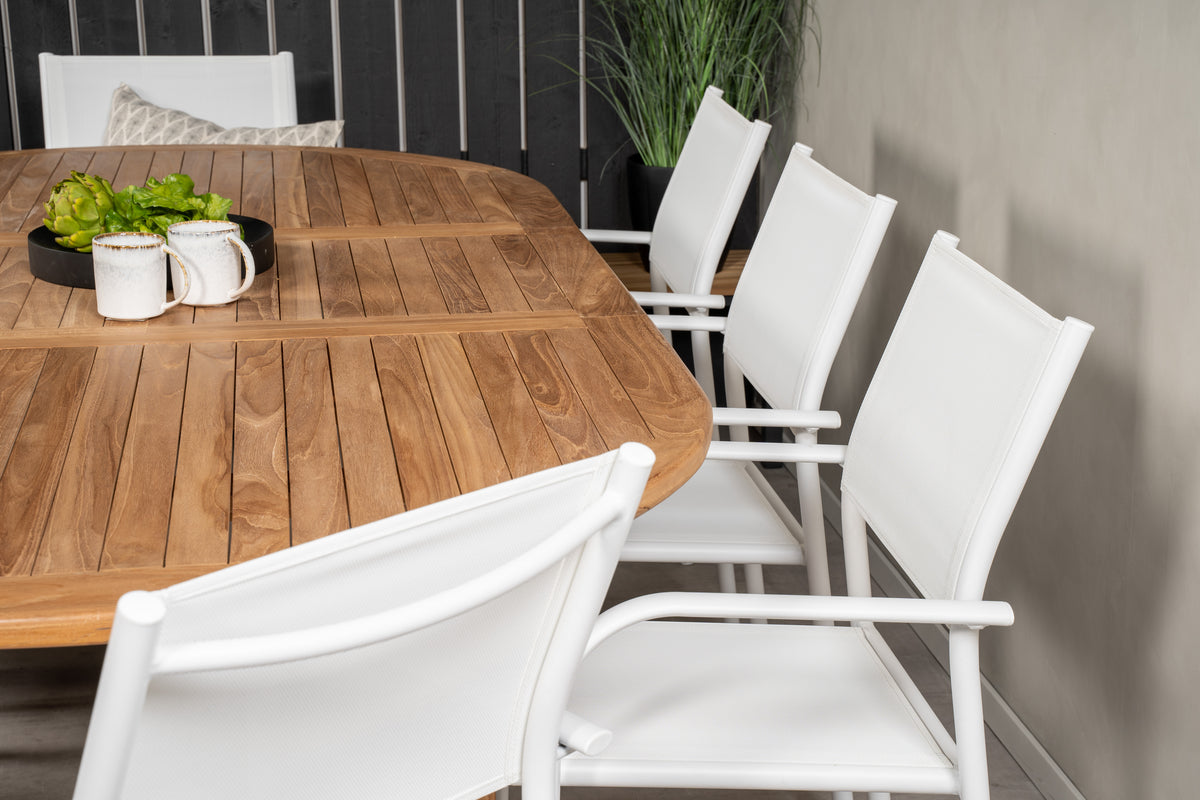 En lys og frisk spisegruppe i luksuriøst skandinavisk design! Vores ovale spisebord Kenya i smagfuld teak skaber et imponerende blikfang. Bordpladen har en ribbet udførelse, og stellet giver et stabilt indtryk. Mål: 180/240x120 cm. Her i trendsikker kombination med 8 stk. spisestole fra serien Santorini. Fremstillet i hvid aluminium med et sæde i textilene og armlæn for ekstra komfort. Stolen er stabelbar for smidig opbevaring. Gør dig klar til et enestående udeliv i sommer!