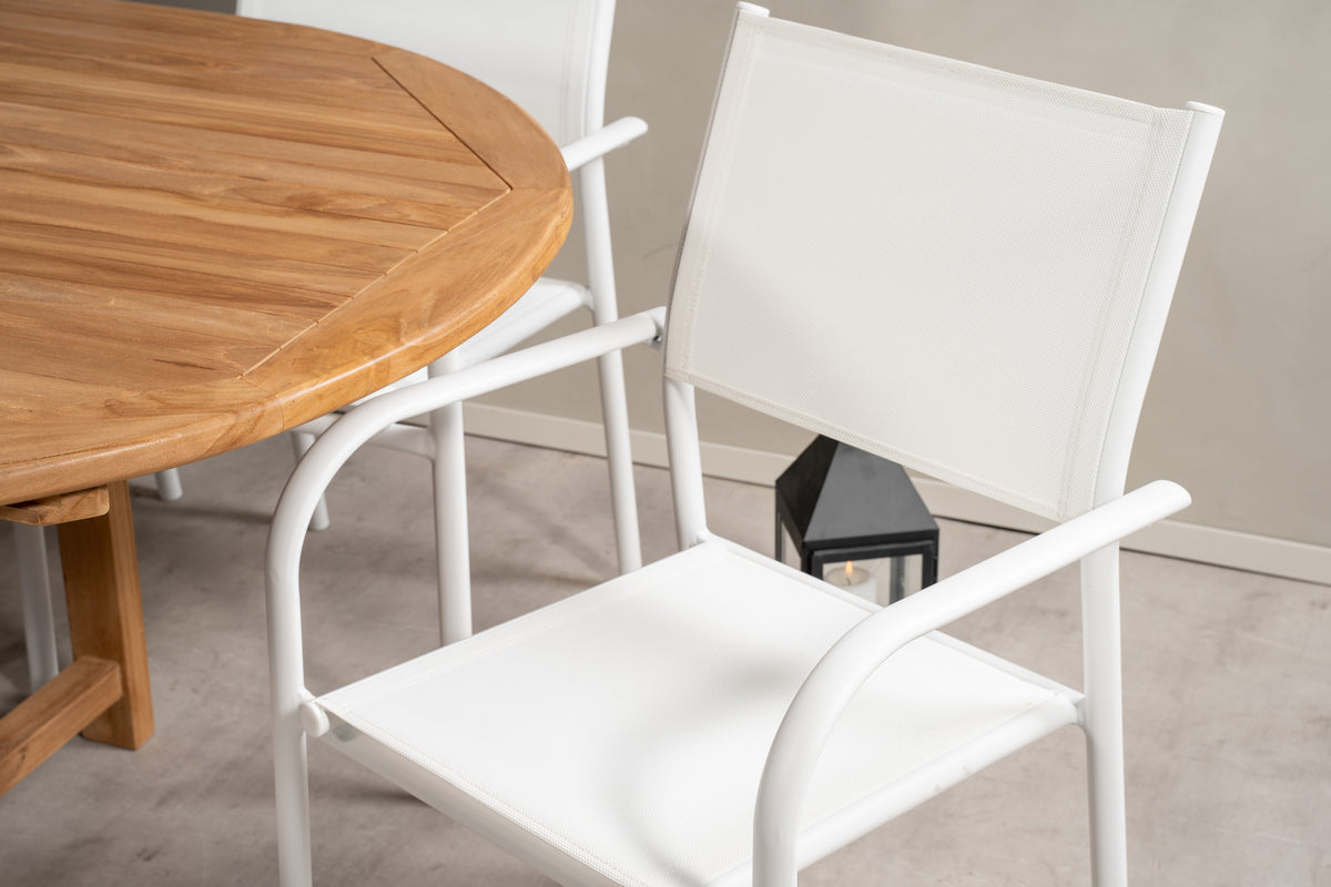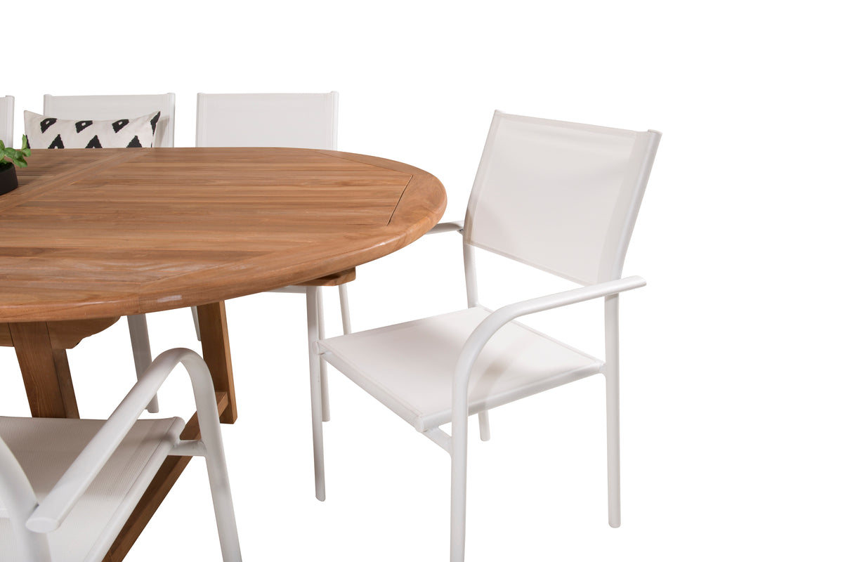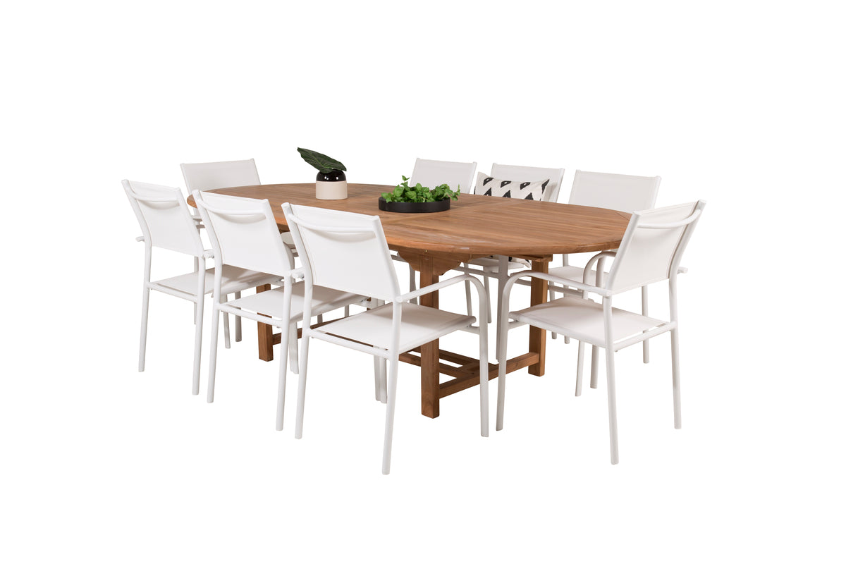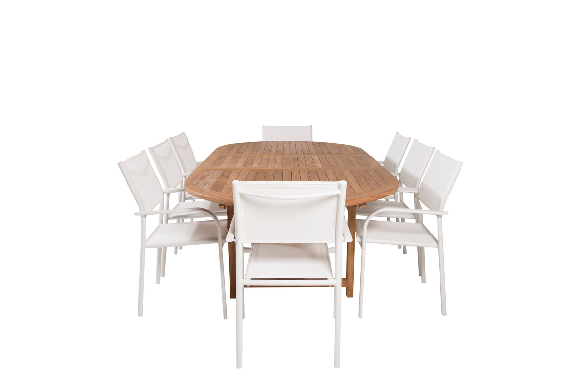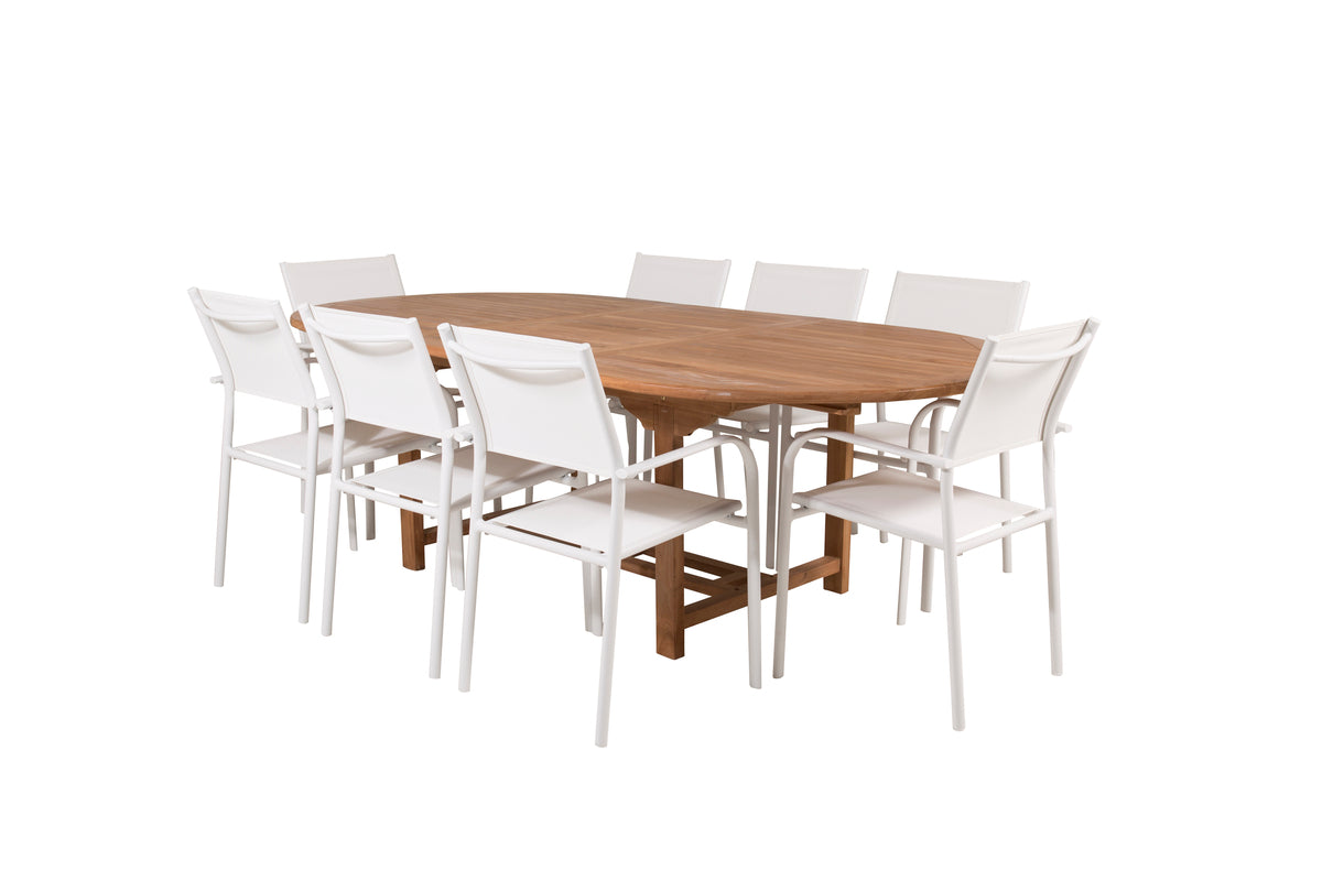 En lys og frisk spisegruppe i luksuriøst skandinavisk design! Vores ovale spisebord Kenya i smagfuld teak skaber et imponerende blikfang. Bordpladen har en ribbet udførelse, og stellet giver et stabilt indtryk. Mål: 180/240x120 cm. Her i trendsikker kombination med 8 stk. spisestole fra serien Santorini. Fremstillet i hvid aluminium med et sæde i textilene og armlæn for ekstra komfort. Stolen er stabelbar for smidig opbevaring. Gør dig klar til et enestående udeliv i sommer!
