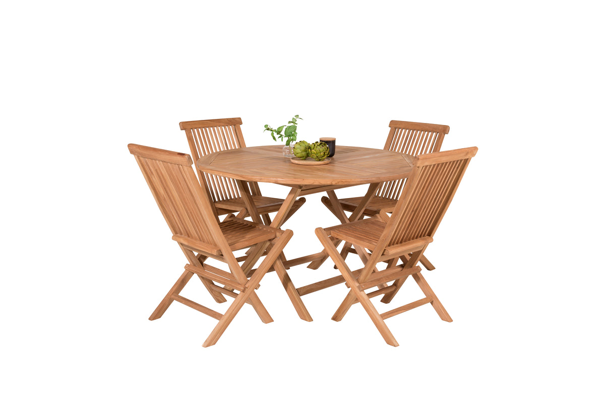 Skab en charmerende atmosfære på terrassen med en familiær spisegruppe! Vores runde spisebord Kenya sørger for, at ingen havner på kanten og imponerer med sit smagfulde, skandinaviske design. Bordet er fremstillet i det smukke materiale teak og har en ribbet udførelse. Mål: 120ø. Her sammen med 4 stk. af vores sammenklappelige spisestole fra serien Kenya. Stolene er også i teak og matcher bordet udmærket. Dæk op til middag og nyd et hyggeligt måltid i en lækker spisegruppe!