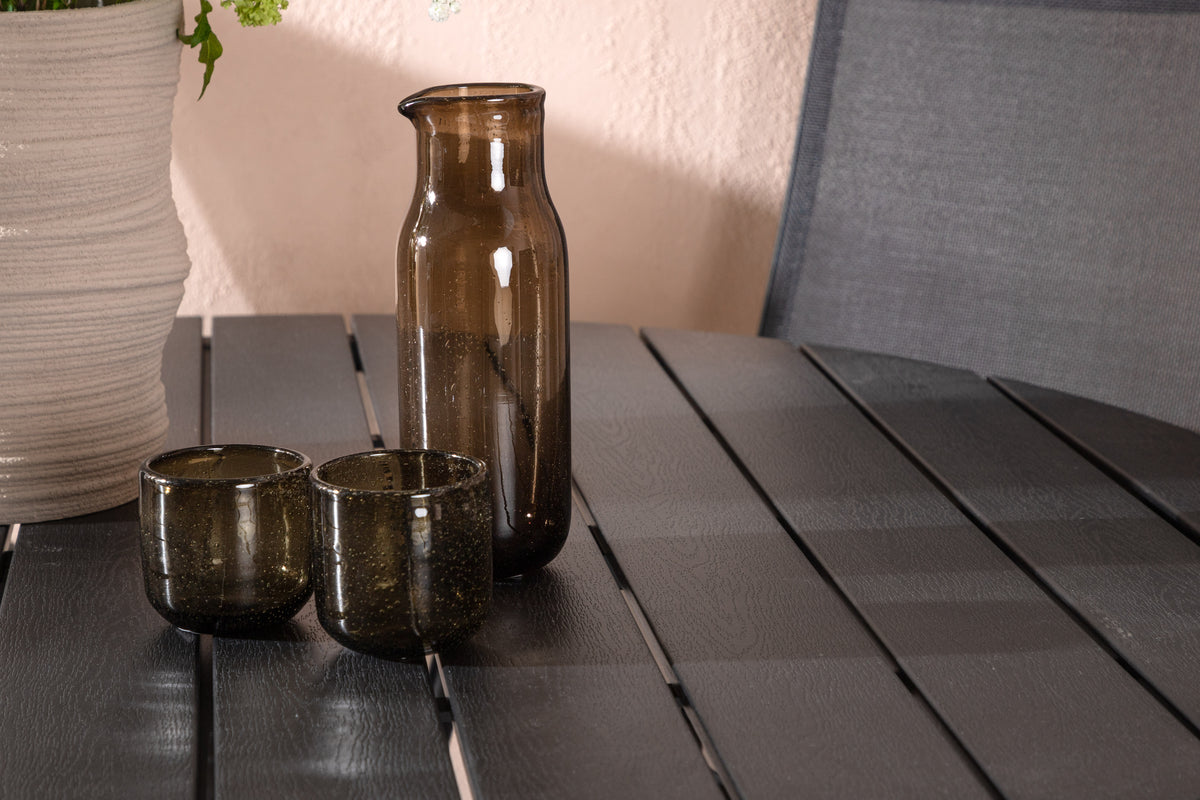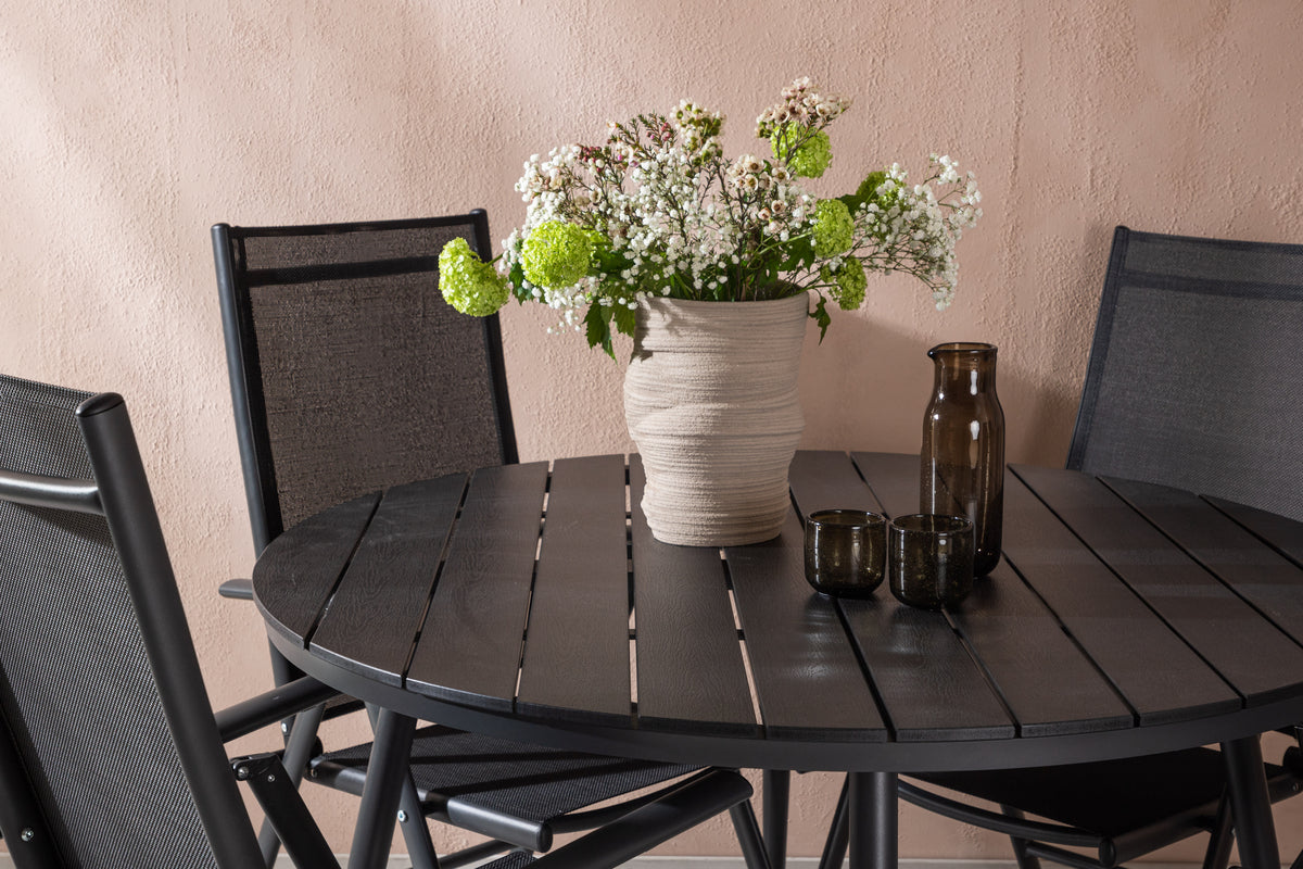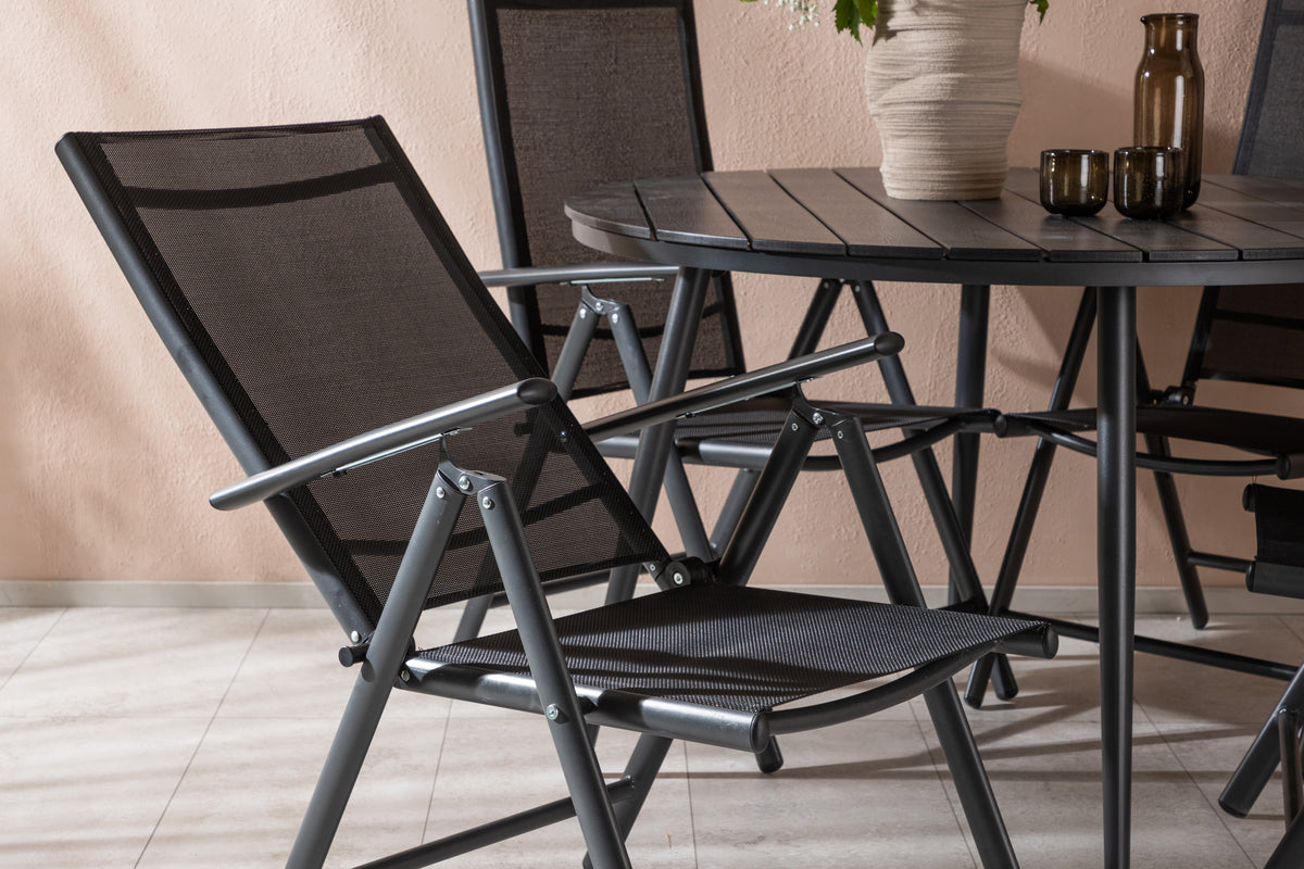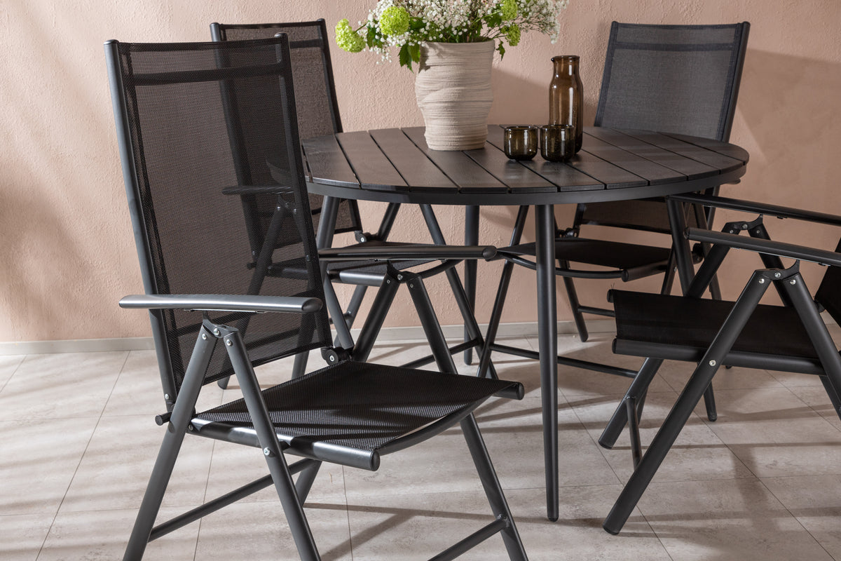En gennemgående sort spisegruppe i moderne design går aldrig af mode - let at matche og tidløs i sit udformning! Bordet Break har en rund bordplade i aintwood og et klassisk understel i sort aluminium. Her i perfekt kombination med foldbare spisestole fra samme serie. Stolens ryglæn i sort textilene kan justeres for optimal komfort og afslapning omkring spisebordet. Skab det perfekte midtpunkt på din terrasse!