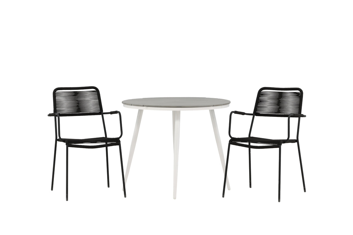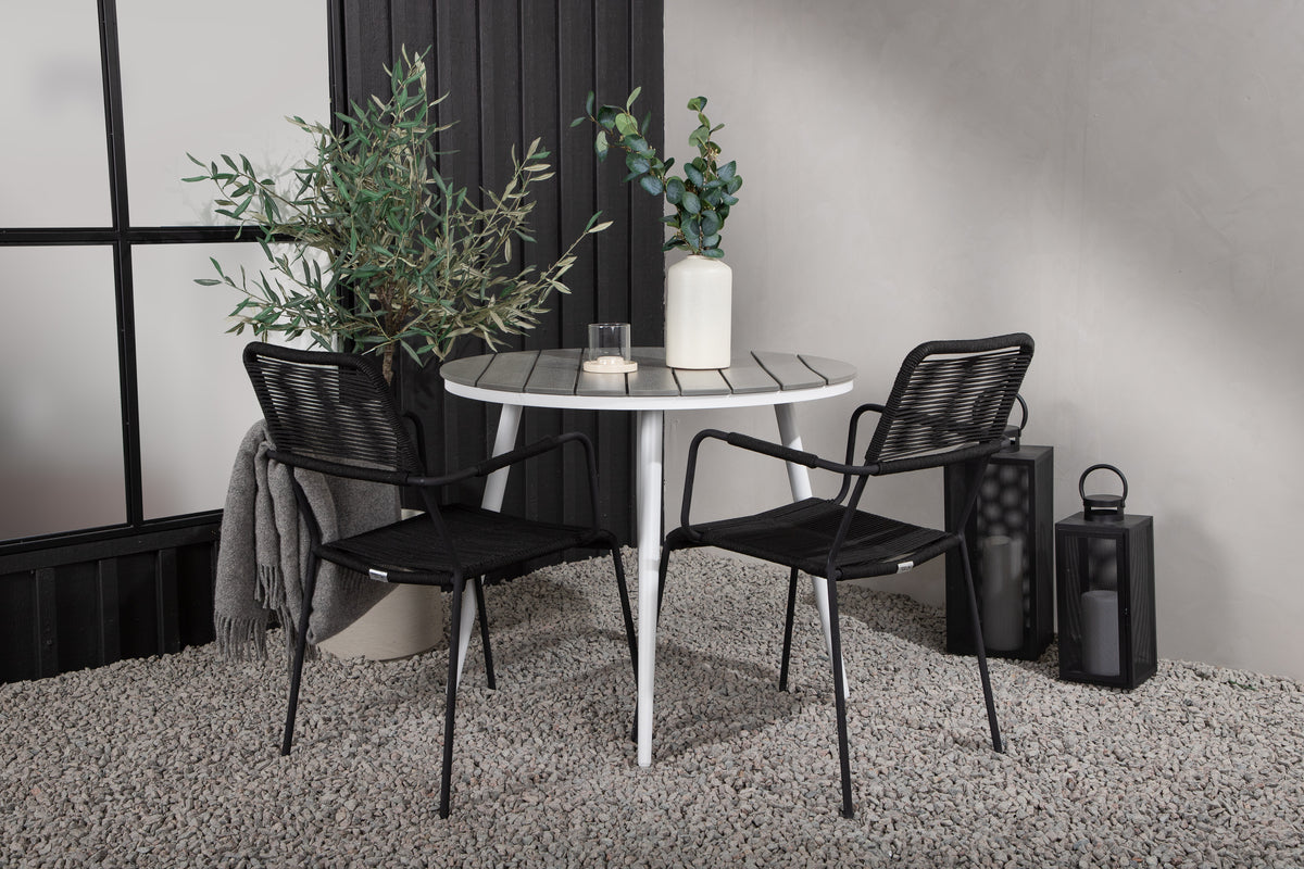 Bekvem, indbydende og nydelig cafégruppe i sort farve, der passer perfekt til terrassen i sommer! Bordet Break har en rund bordplade i grå aintwood og et klassisk understel i hvid aluminium. Her i perfekt kombination med smækre stole fra serien Lindos. Stolene har stilrent smalle ben og integrerede armlæn i sort aluminium og et sæde i slidstærkt, sort reb. Det her er en indbydende spisegruppe til to, der garanteret forlænger hyggelige stunder i sommer!