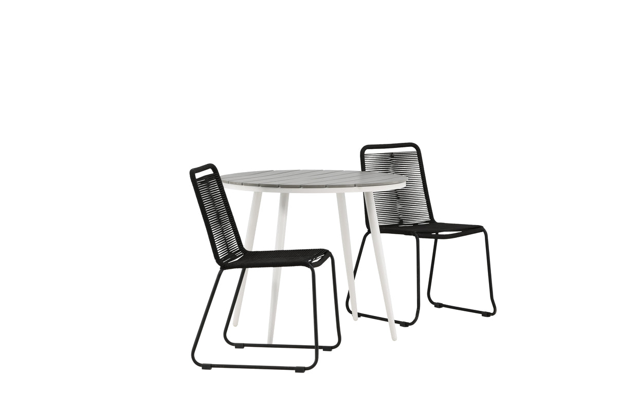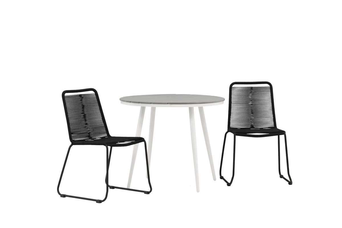 Bekvem, indbydende og nydelig cafégruppe i sort farve, der passer perfekt til terrassen i sommer! Bordet Break har en rund bordplade i grå aintwood og et klassisk understel i hvid aluminium. Her i perfekt kombination med smækre stole fra serien Lindos. Stolene har stilrent smalle ben i sort aluminium og et sæde i slidstærkt, sort reb. Den er også stabelbar for praktisk opbevaring. Det her er en indbydende spisegruppe til to, der garanteret forlænger hyggelige stunder i sommer!