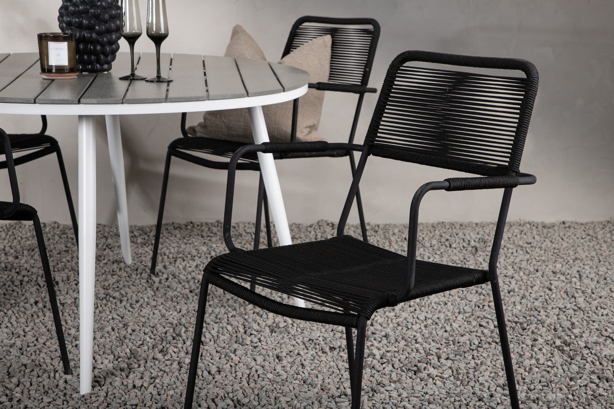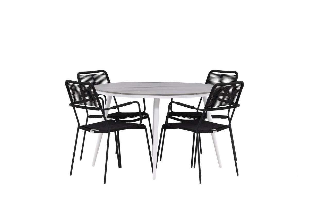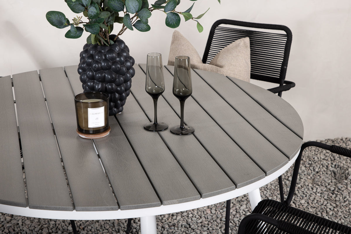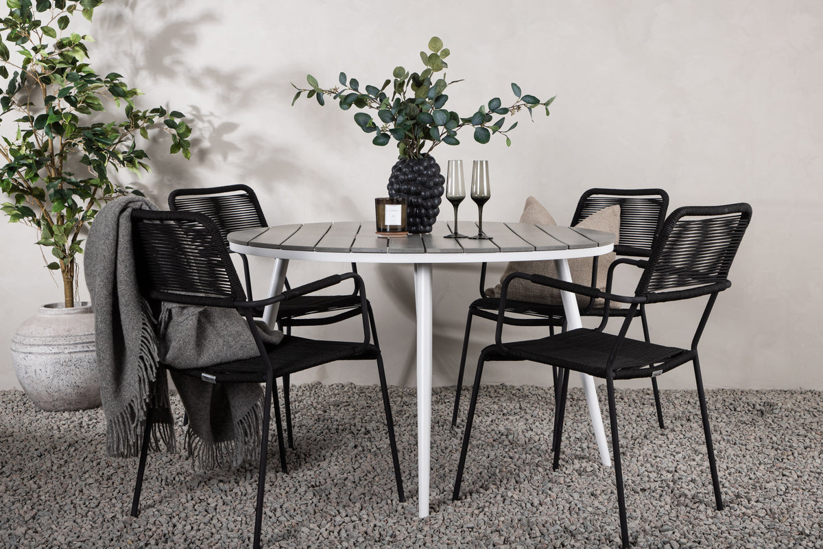 Sid komfortabelt i en indbydende spisegruppe, hvor ingen risikerer at havne på kanten! Spisebord Break har et klassisk design med en rund bordplade i grå aintwood og let udadgående ben i hvid aluminium. Mål: 120ø cm. Her i moderne kombination med vores seje spisebordsstole fra serien Lindos. Stolene har stilrent smalle ben og integrerede armlæn i sort aluminium og et sæde i slidstærkt, sort reb. Skab et charmerende sted til sommerens alle lejligheder!