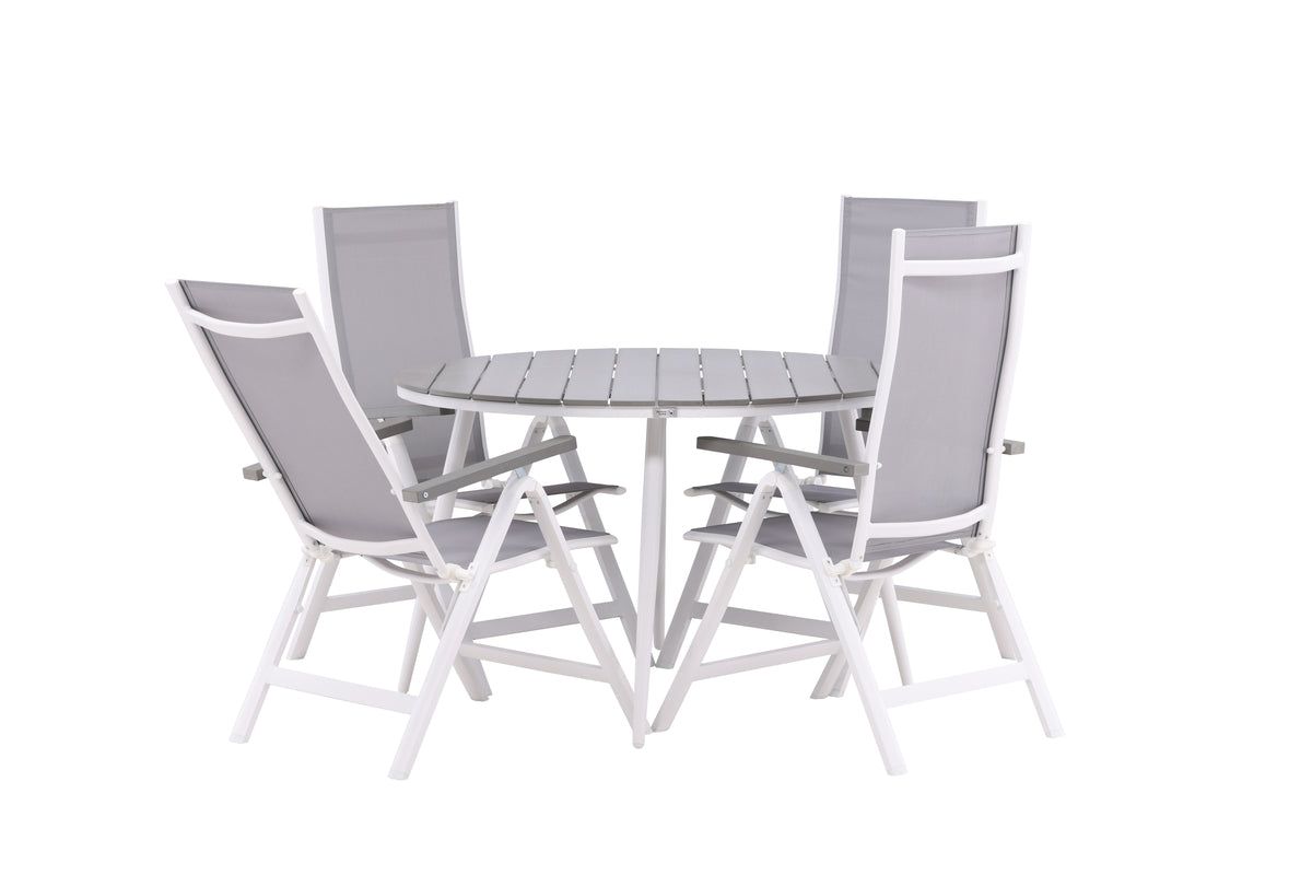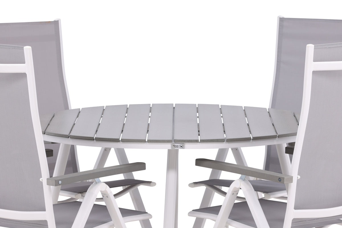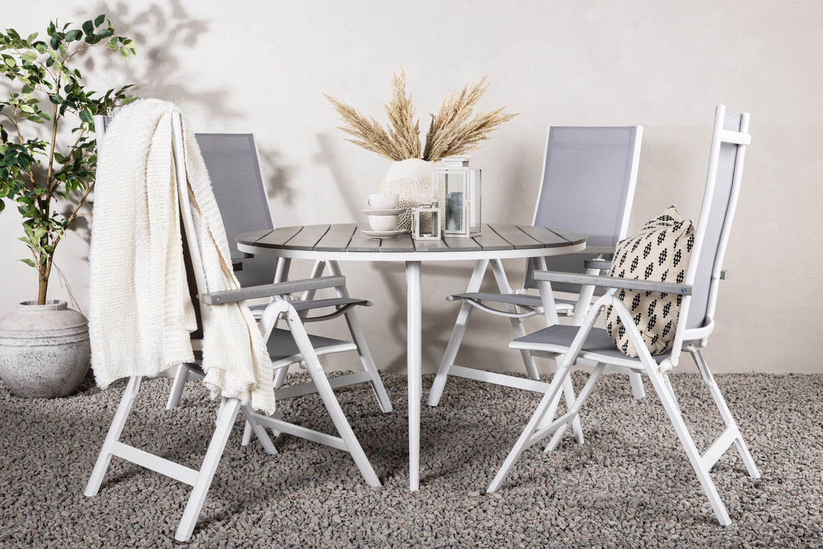 En lækkert matchende spisegruppe i behagelige farver - perfekt til sommerens alle udendørs måltider! Spisebord Break har en rund bordplade i grå aintwood og et klassisk understel i hvid aluminium. Mål: 120ø cm. Her sammen med 4 stk. spisebordsstole fra serien Albany, en stol med fokus på komfort og holdbarhed. Stolen er en grå 5-positionsstol i textilene med lækre armlæn og rammekonstruktion i hvid aluminium. Ryglænet er justerbart for optimal komfort og afslapning. Her bliver I siddende længe og nyder god mad!