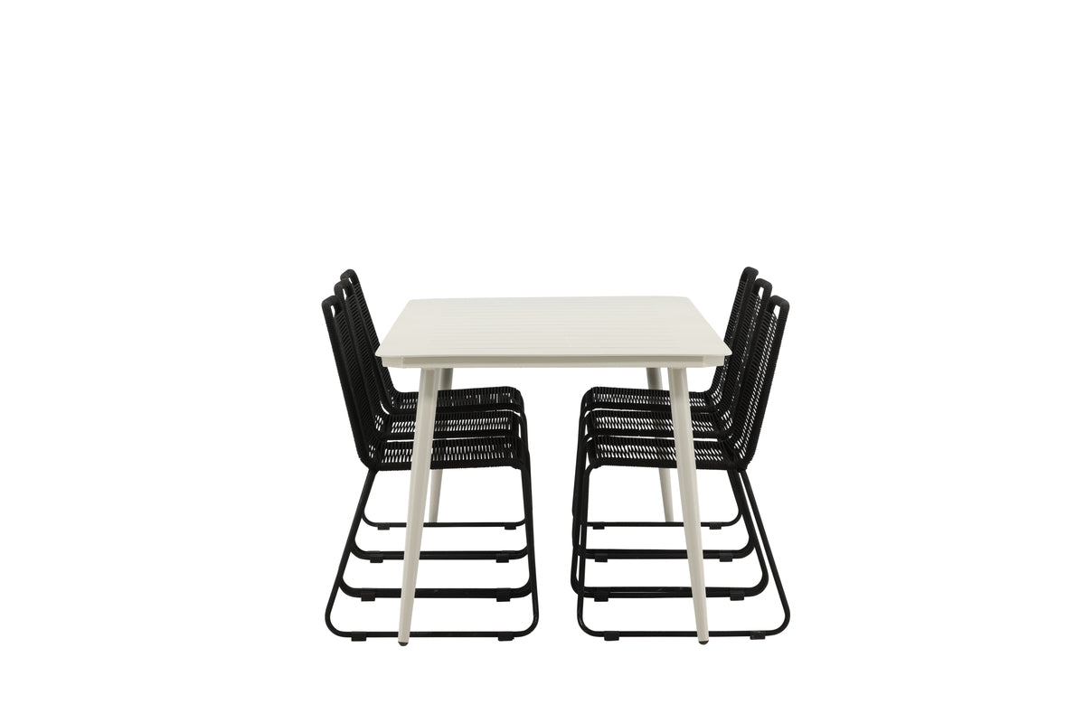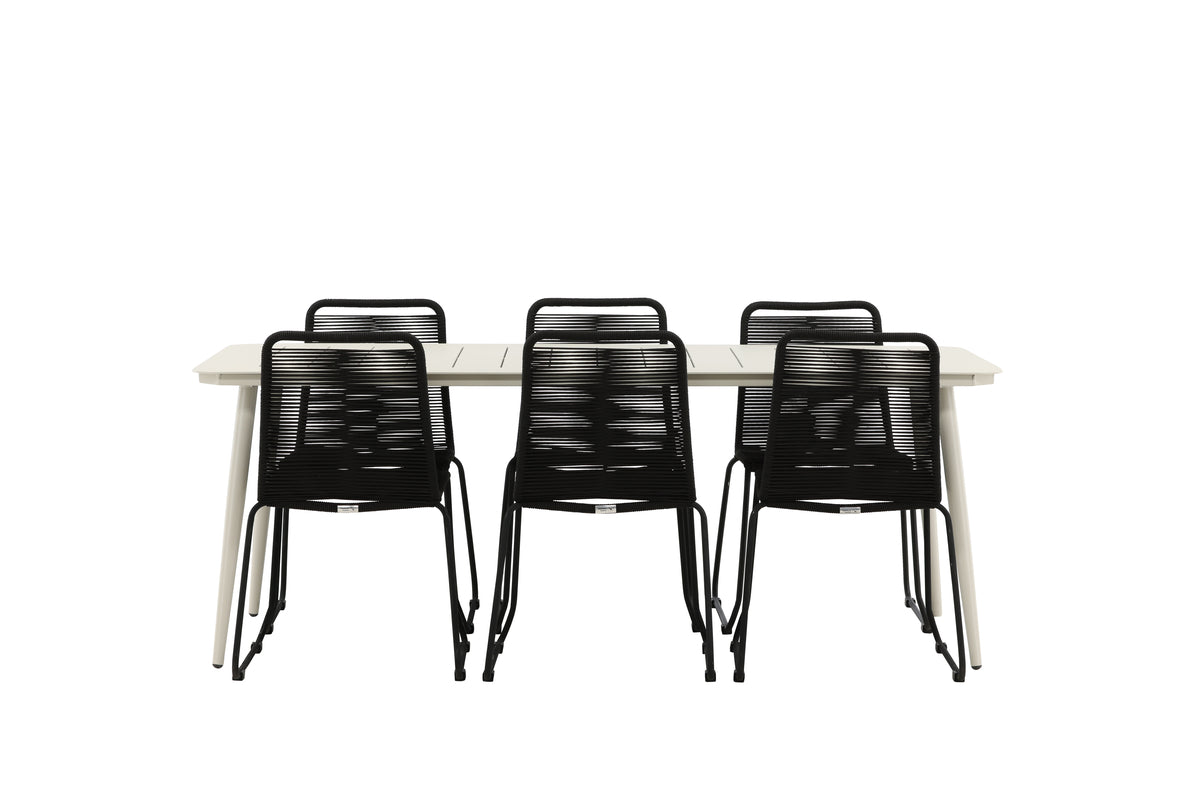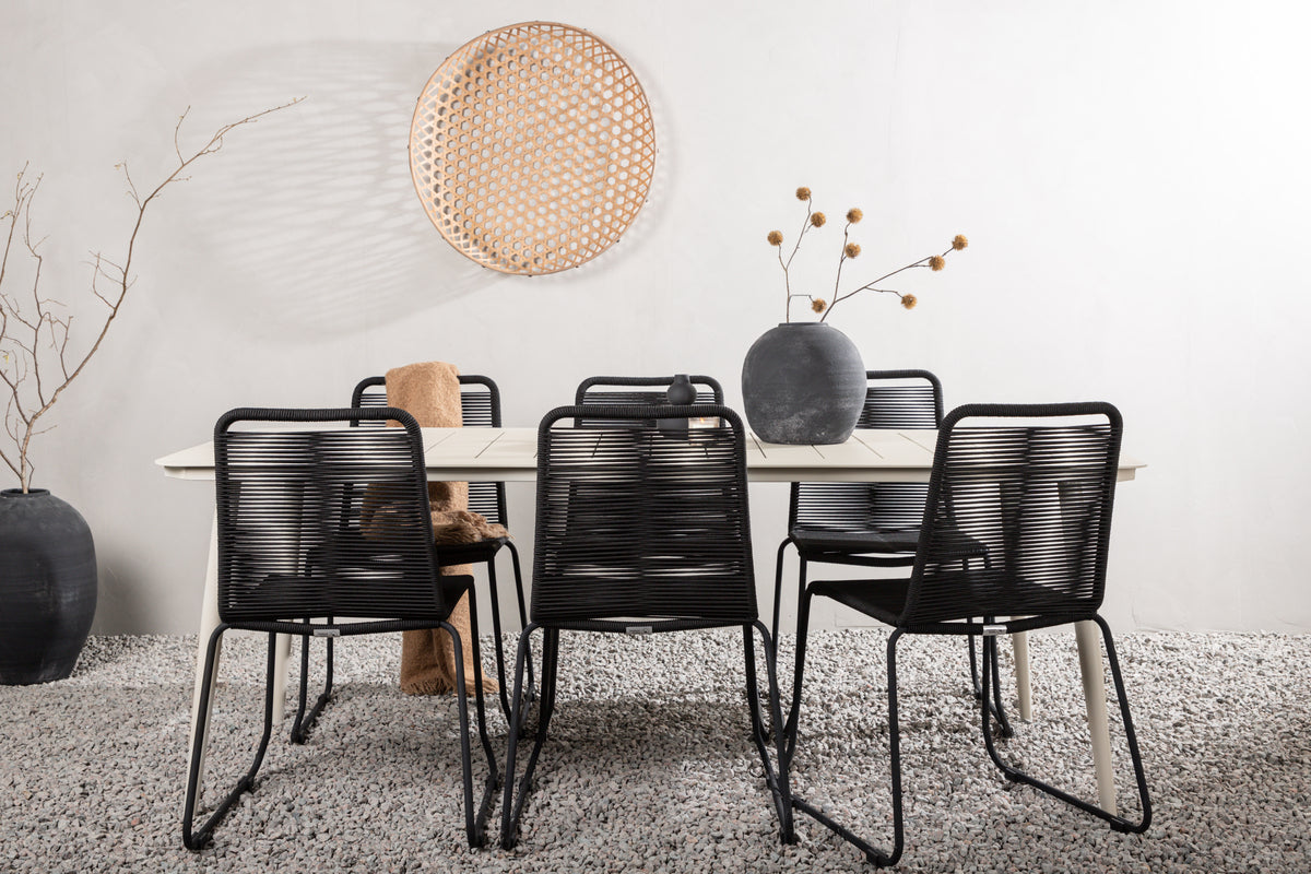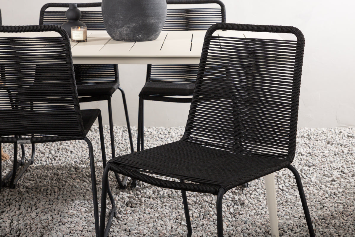 En moderne farvematchning, der skaber et modebevidst indtryk i udestuen. Bordet Lina har et minimalistisk design i hvidt/beige stål, med en rektangulær bordplade og blødt afrundede kanter. Bordbenene er let udadgående og giver et stabilt indtryk. Mål: 200x90 cm. Her sammen med sorte spisebordsstole fra serien Lindos. Stolene har stilrent smalle ben i sort stål og et sæde i slidstærkt reb. Stolen er også stabelbar for praktisk opbevaring. Invitér til mange hyggelige måltider fremover!
