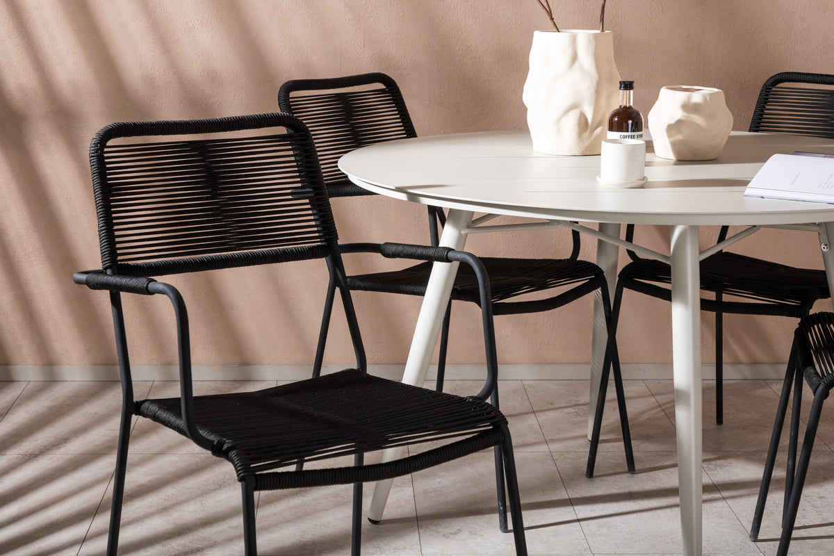It´s a match - En moderne farvematchning, der skaber et modebevidst indtryk i udestuen. Bordet Lina har et minimalistisk design i hvidt/beige stål, med en rektangulær bordplade og blødt afrundede kanter. Bordbenene er let udadgående og giver et stabilt indtryk. Mål: 200x90 cm. Her sammen med trendsikre spisebordsstole fra serien Lindos. Stolene har integrerede armlæn i sort aluminium og et sæde i slidstærkt, sort reb. Møblér indbydende på terrassen og skab et blikfang, der imponerer!