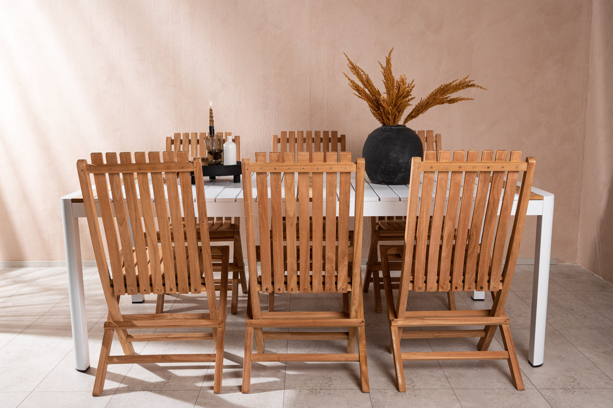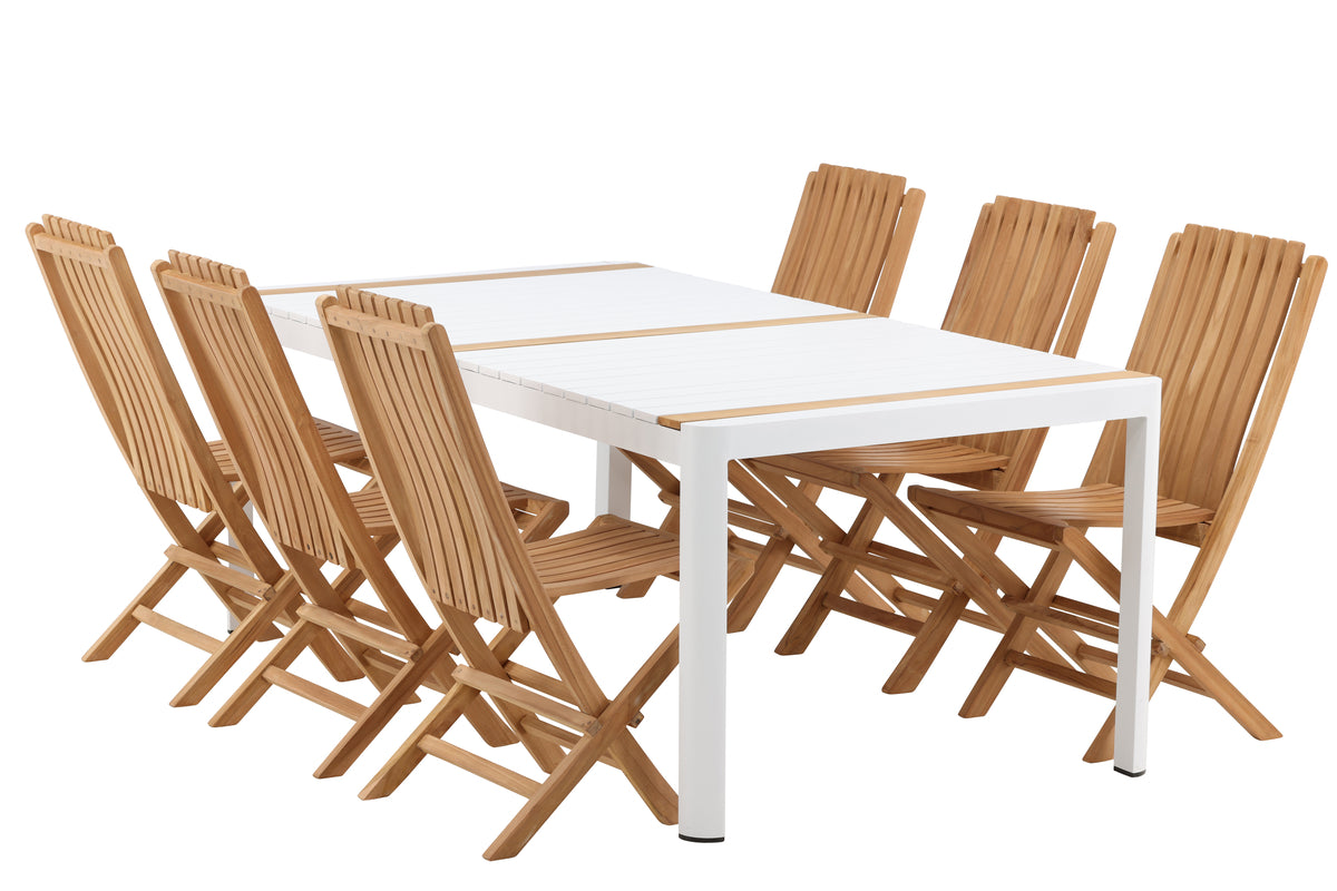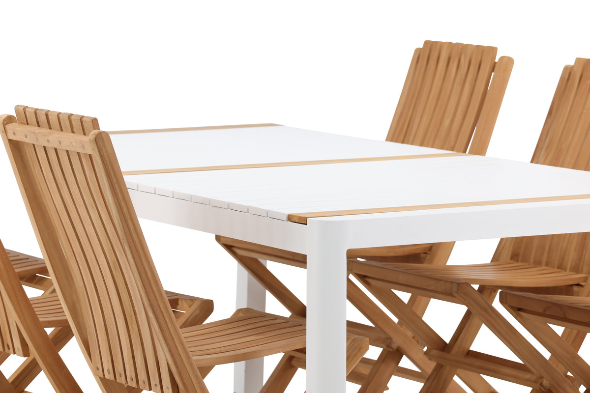 Skab et elegant blikfang, der imponerer - denne spisegruppe er lige så iøjnefaldende som slidstærk! Spisebord Togo har et smagfuldt design med en rektangulær bordplade i hvid og træfarvet teak og et understel i hvid aluminium. De lækre teakdetaljer i bordpladen gør, at bordet passer perfekt til spisestolene fra serien Ghana. Stolene er sammenklappelige og fremstillet i smagfuld teak i et ribbet design, der giver et meget moderne indtryk. Lad tiden her blive dagens højdepunkt!