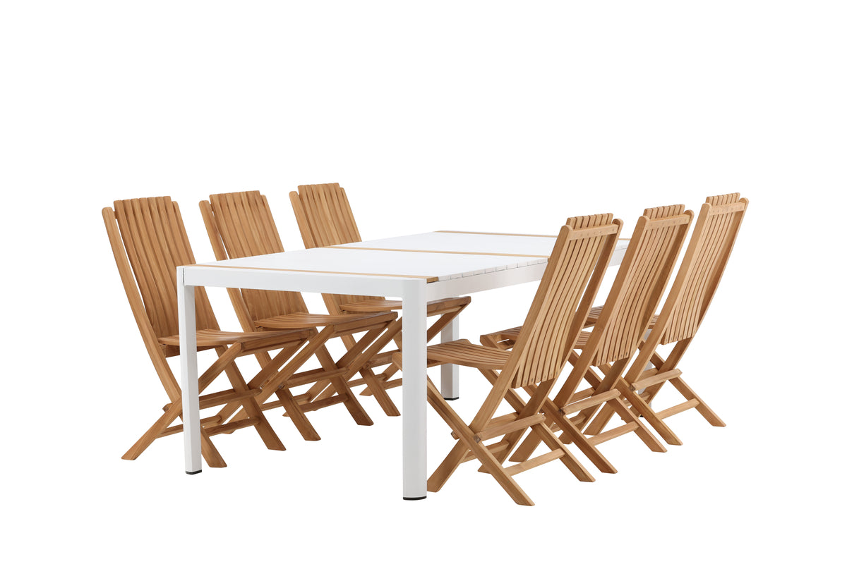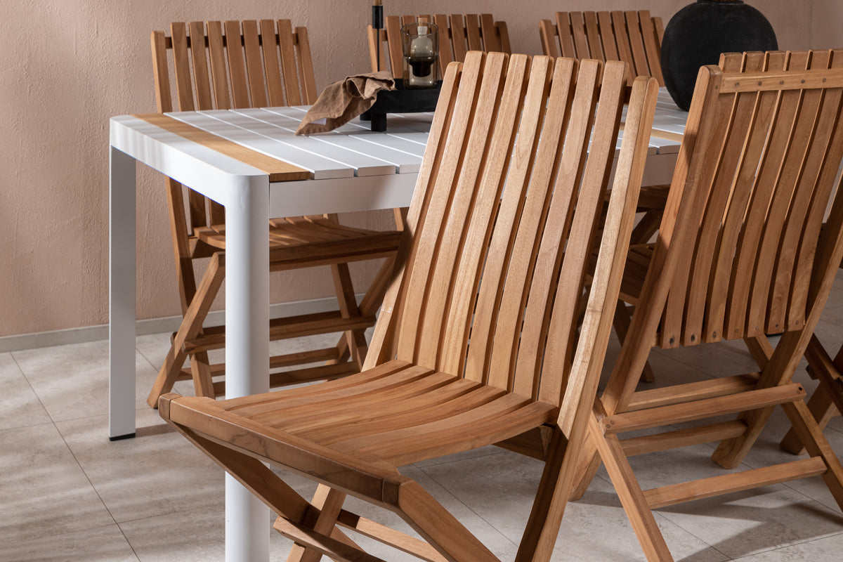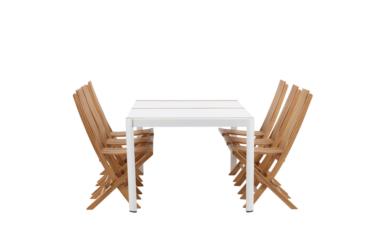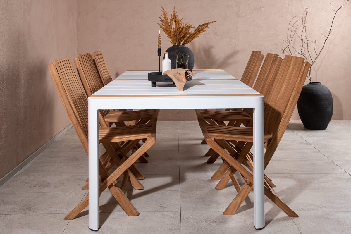 Skab et elegant blikfang, der imponerer - denne spisegruppe er lige så iøjnefaldende som slidstærk! Spisebord Togo har et smagfuldt design med en rektangulær bordplade i hvid og træfarvet teak og et understel i hvid aluminium. De lækre teakdetaljer i bordpladen gør, at bordet passer perfekt til spisestolene fra serien Ghana. Stolene er sammenklappelige og fremstillet i smagfuld teak i et ribbet design, der giver et meget moderne indtryk. Lad tiden her blive dagens højdepunkt!