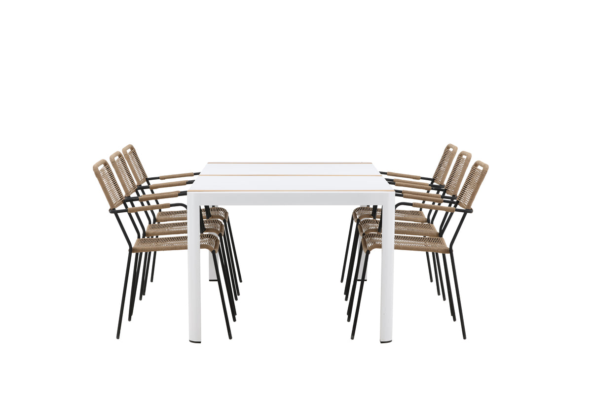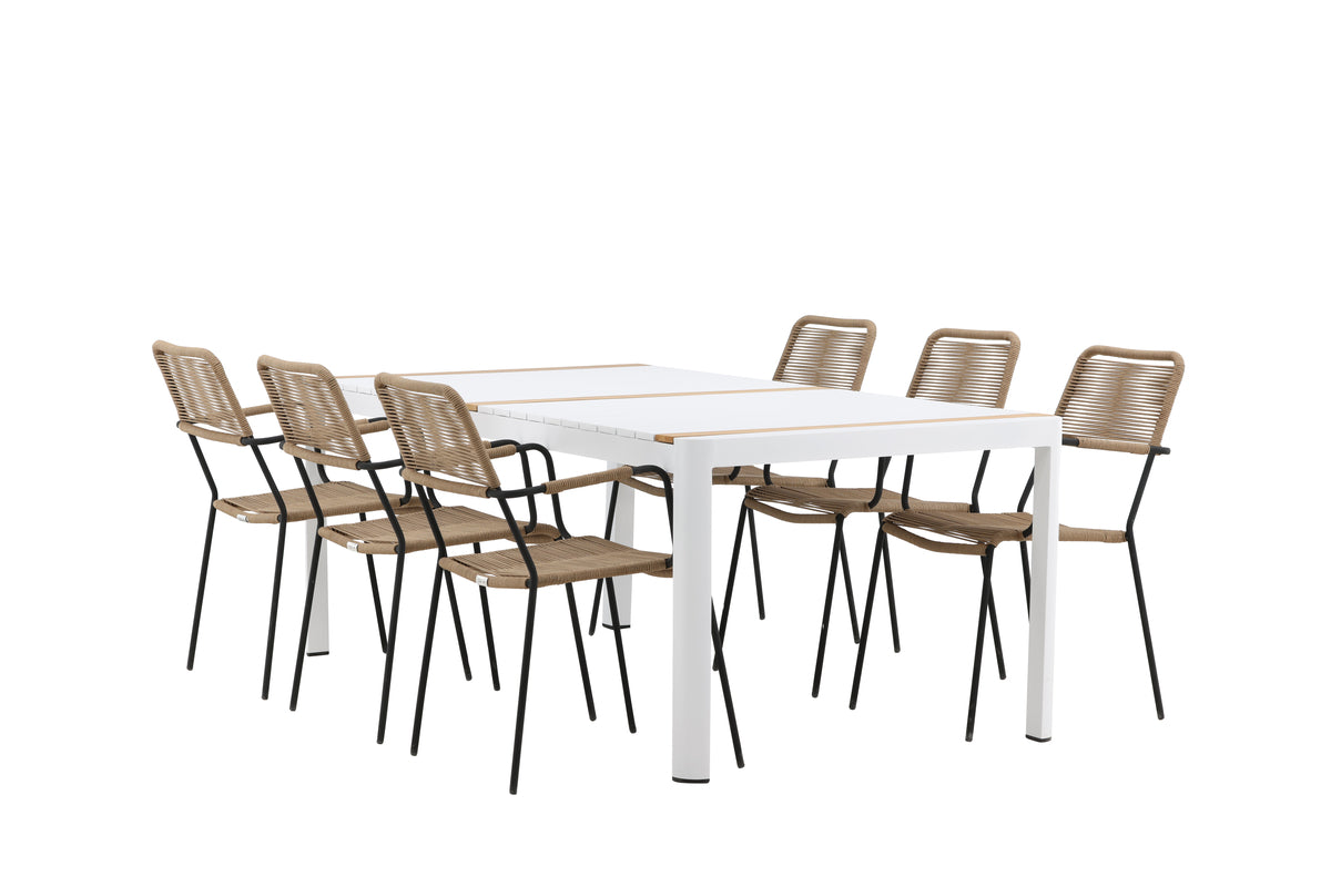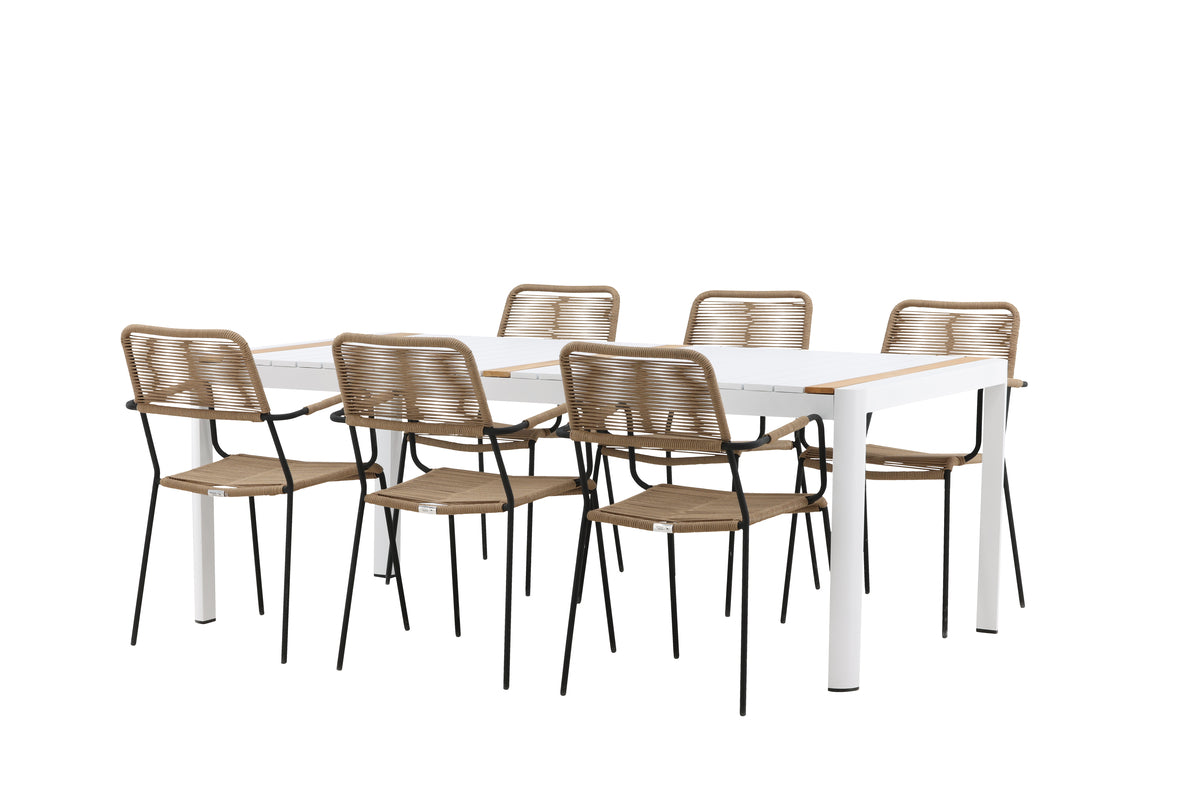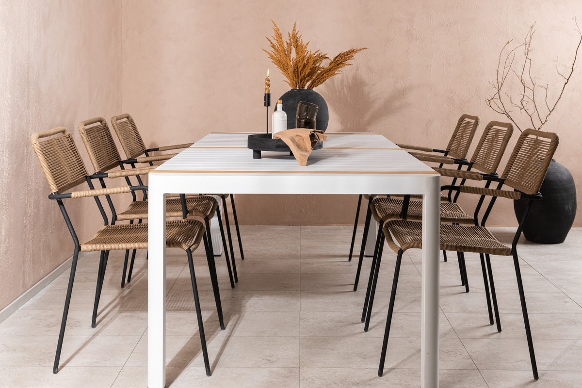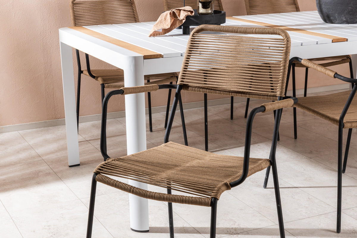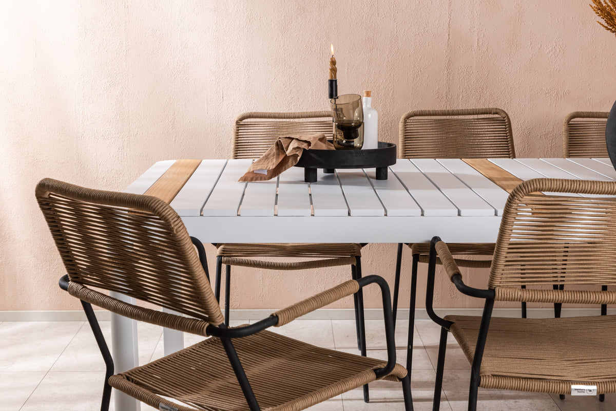 Skab et trendsikkert blikfang, der imponerer - denne spisegruppe er lige så iøjnefaldende som slidstærk! Spisebord Togo har et smagfuldt design med en rektangulær bordplade i hvid og træfarvet teak og et understel i hvid aluminium. Mål: 200x100. Her i moderne kombination med lattefarvede spisestole fra serien Lindos. Stolene har stilrent smalle ben og integrerede armlæn i sort aluminium og et sæde i slidstærkt beige reb. Den jordnære farve giver et varmt indtryk til møblementet. Invitér til mange hyggelige måltider fremover!