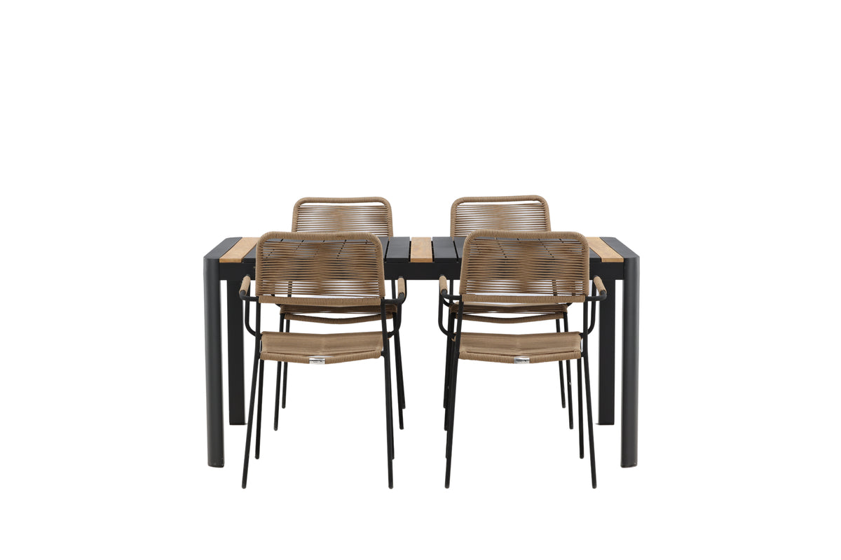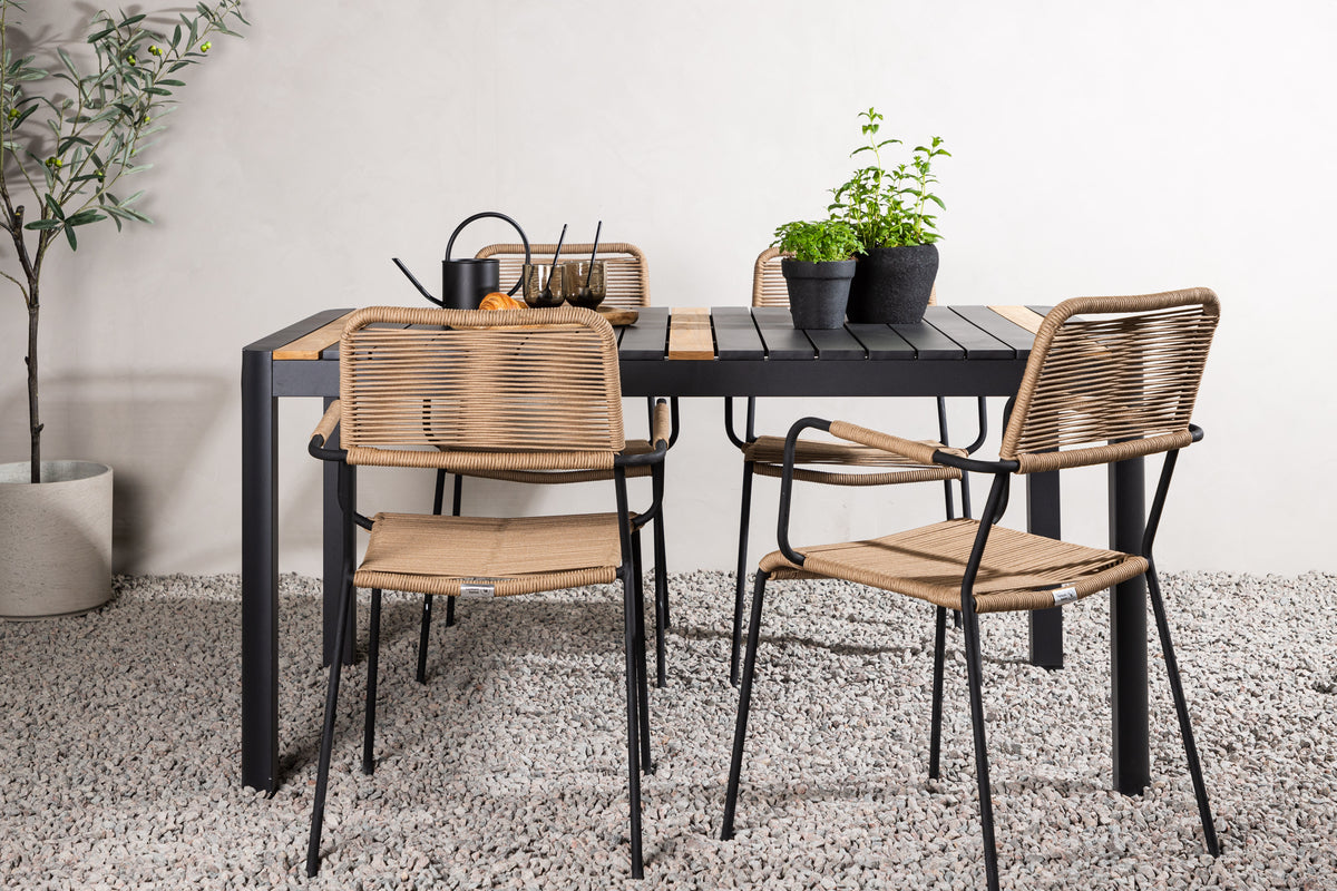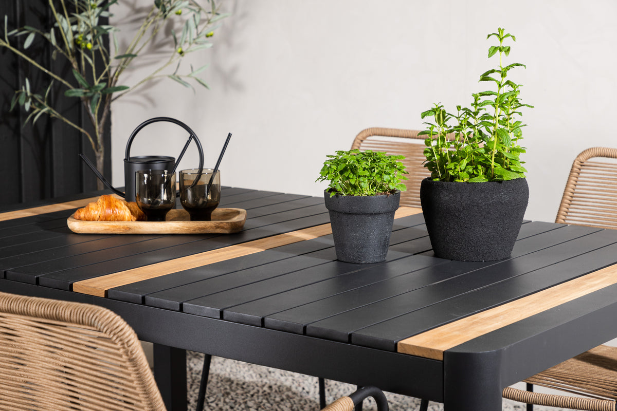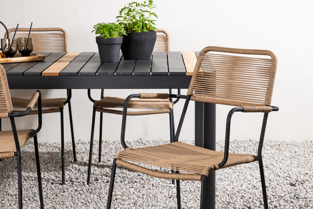 Stilrent, slidstærkt og elegant - en spisegruppe med alt det rigtige! Spisebord Togo har et smagfuldt design med en rektangulær bordplade i sort og træfarvet teak og et understel i sort aluminium. Det lige nordiske design er lige så klassisk som tidløst. Mål: 150x100 cm. Her i moderne kombination med lattefarvede spisebordsstole fra serien Lindos. Stolene har stilrent smalle ben og integrerede armlæn i sort stål og et sæde i slidstærkt beige reb. Den jordnære kulør giver et varmt indtryk til møblementet. Invitér til mange hyggelige måltider fremover!