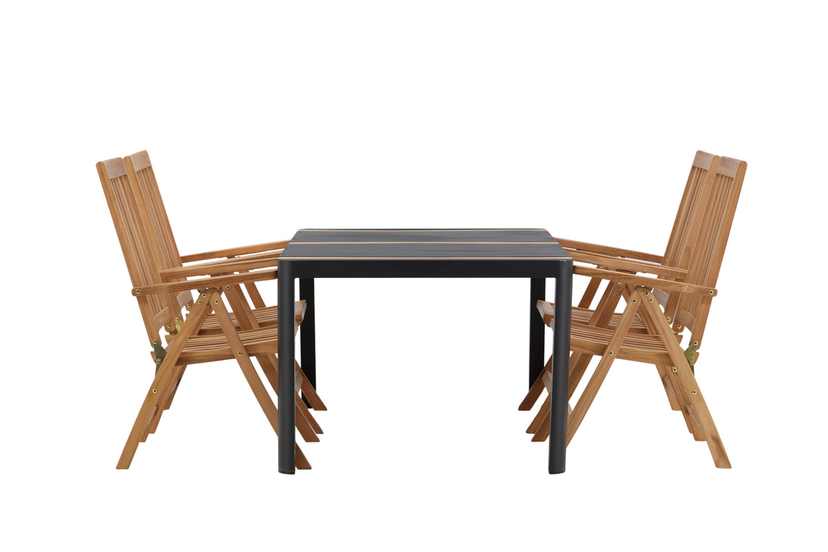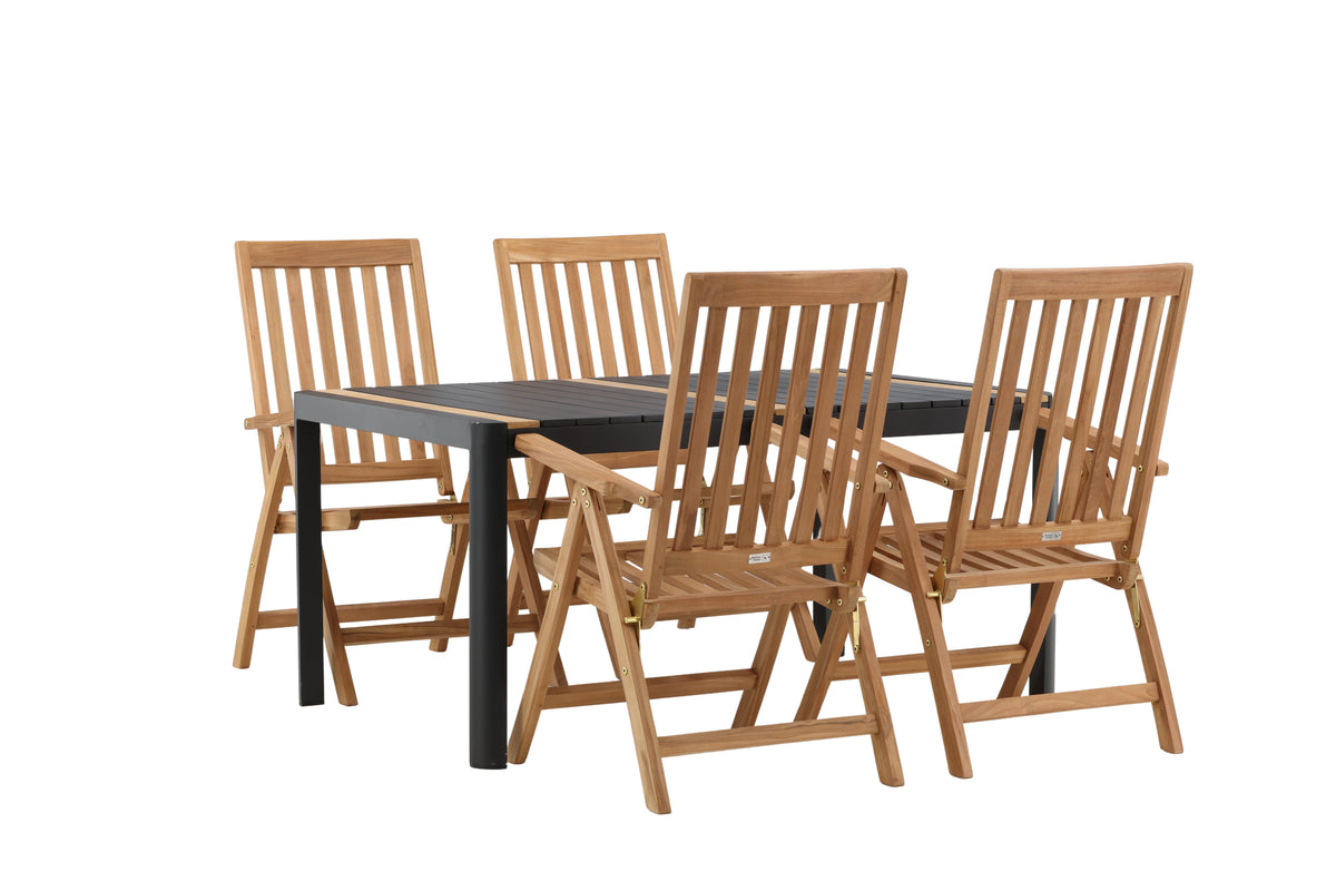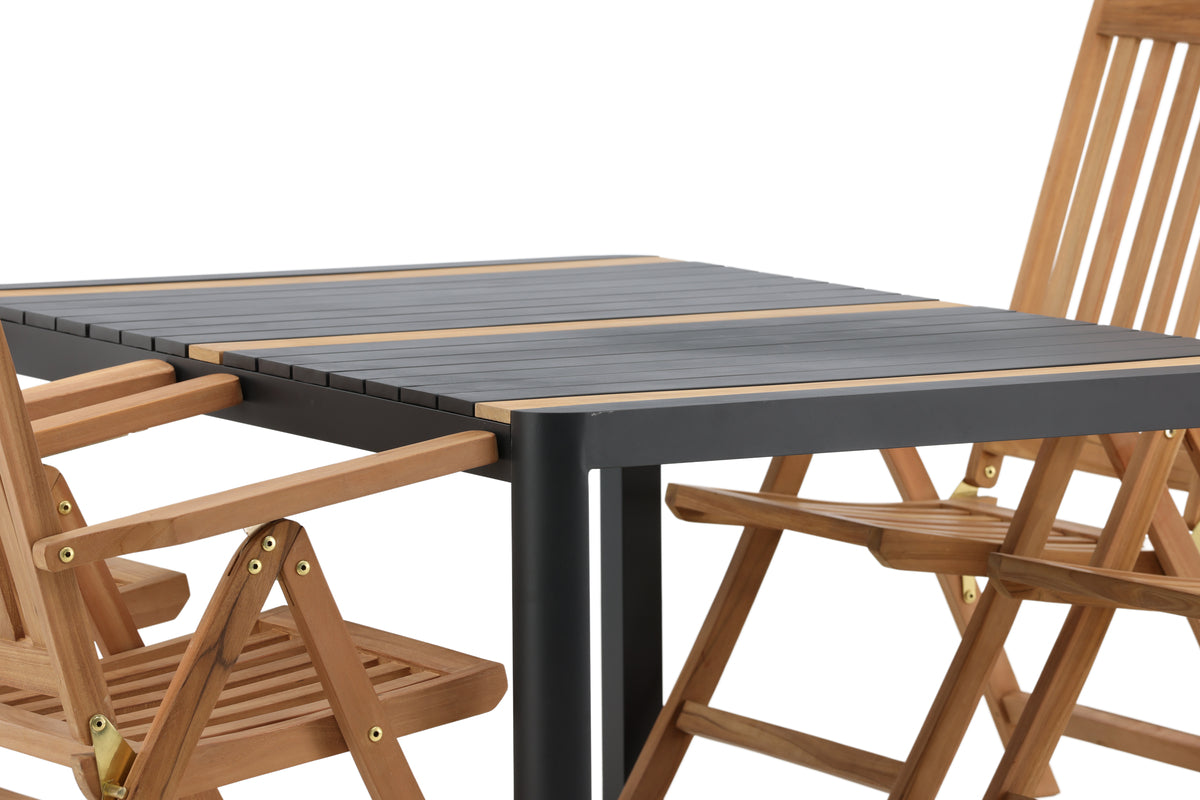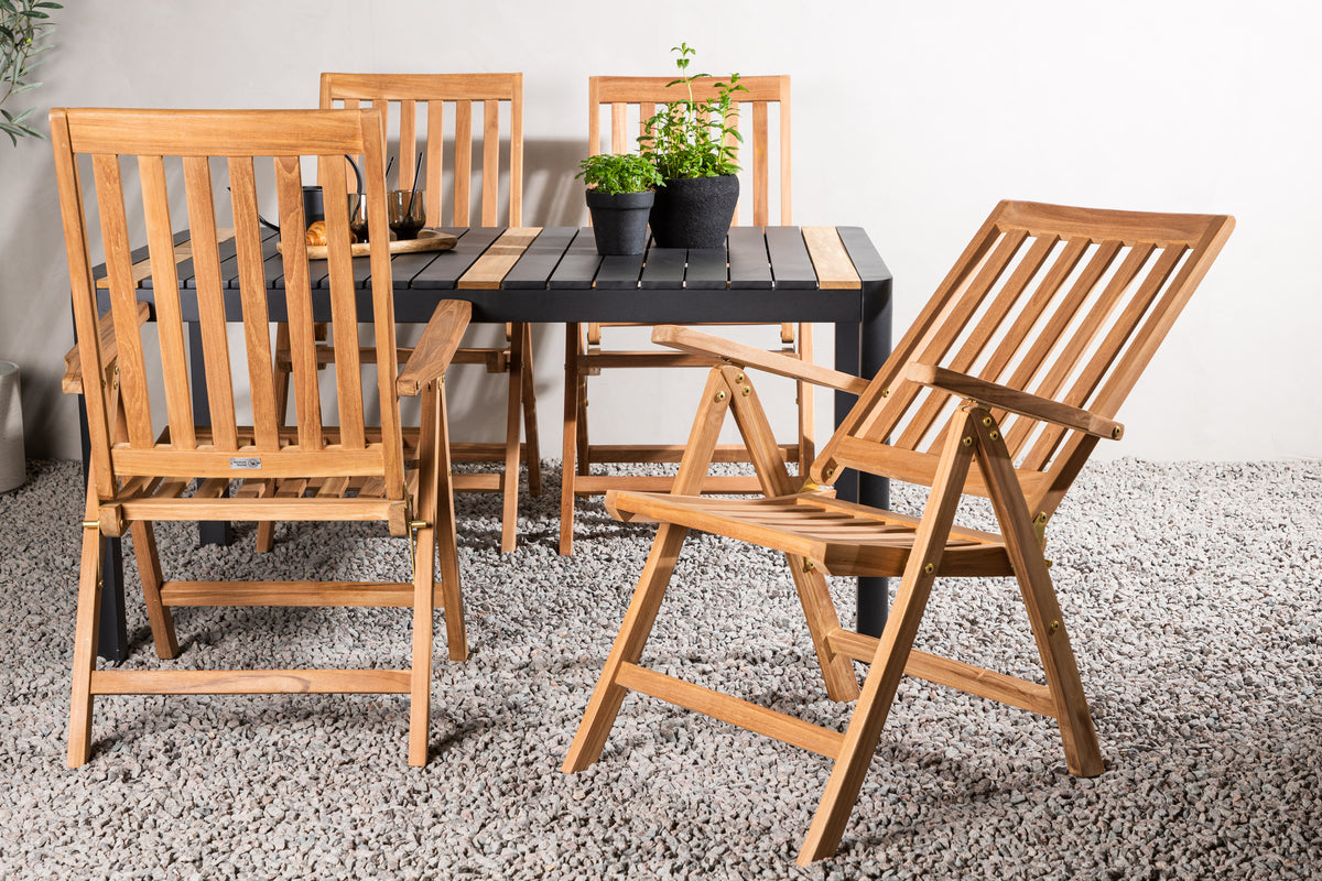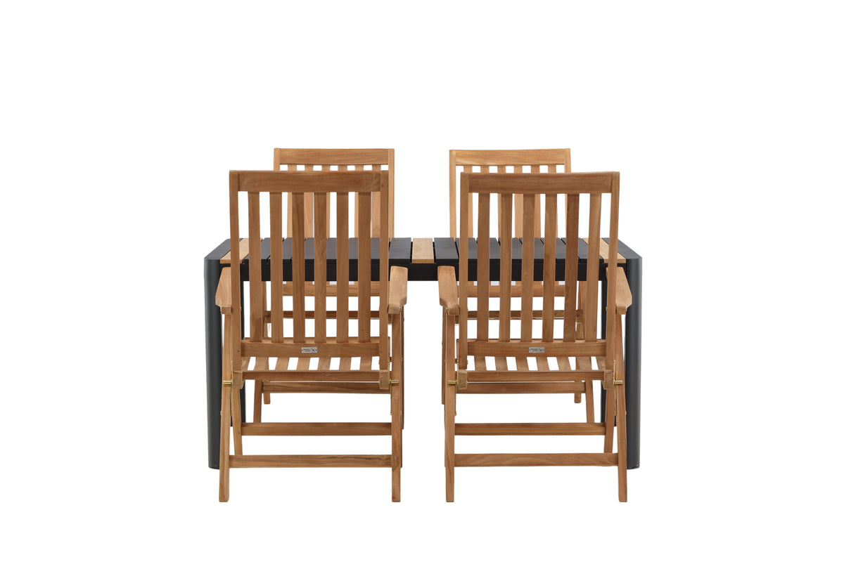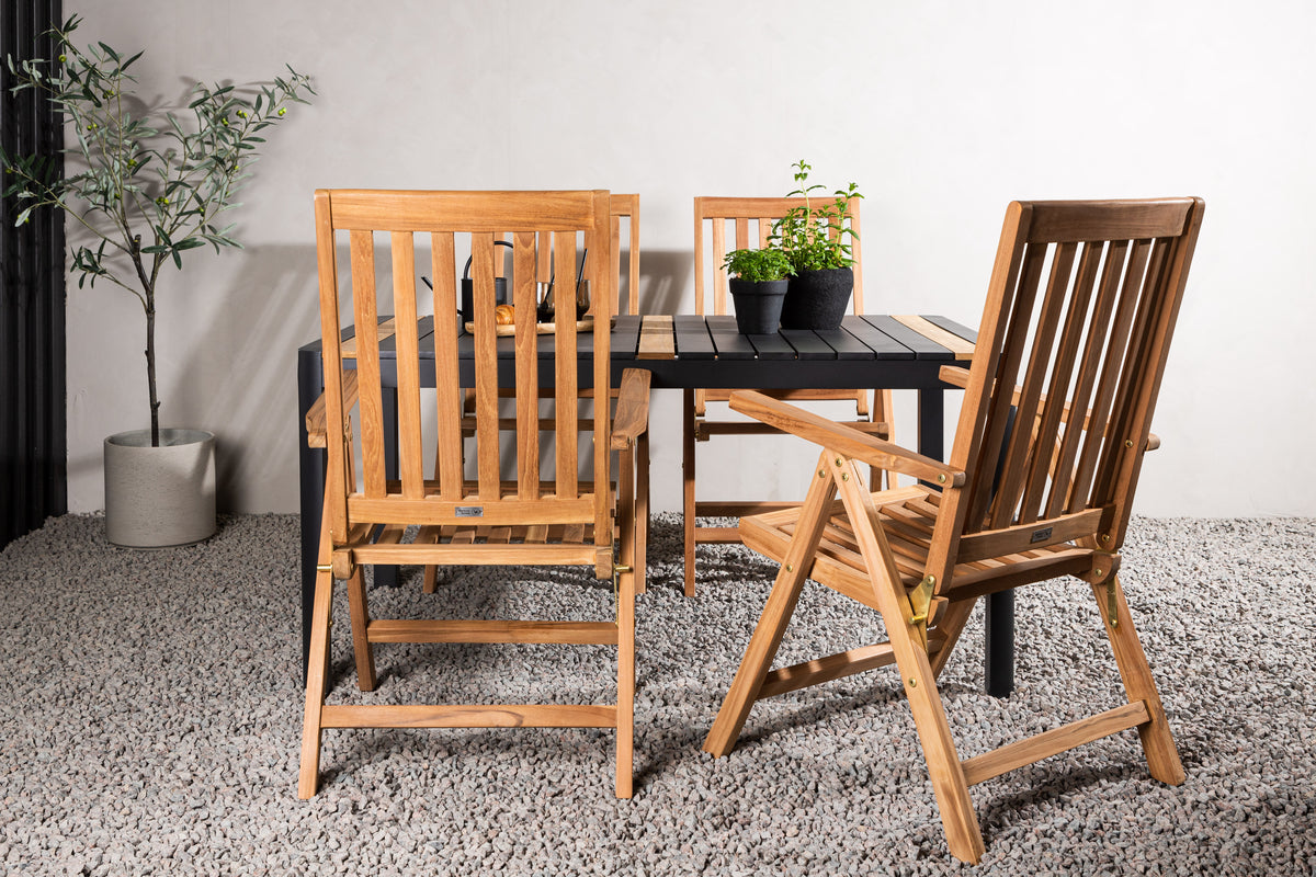 Skab et blikfang, der imponerer - denne spisegruppe er lige så iøjnefaldende som slidstærk! Spisebord Togo har et smagfuldt design med en rektangulær bordplade i sort og træfarvet teak og et understel i sort aluminium. De lækre teakdetaljer i bordpladen gør, at bordet passer perfekt til spisebordsstolene fra serien Kenya. Stolene er klapbare og har armlæn for ekstra komfort. Fremstillet i smagfuld teak i et ribbet design, der giver et meget moderne indtryk. Lad tiden her blive dagens højdepunkt!