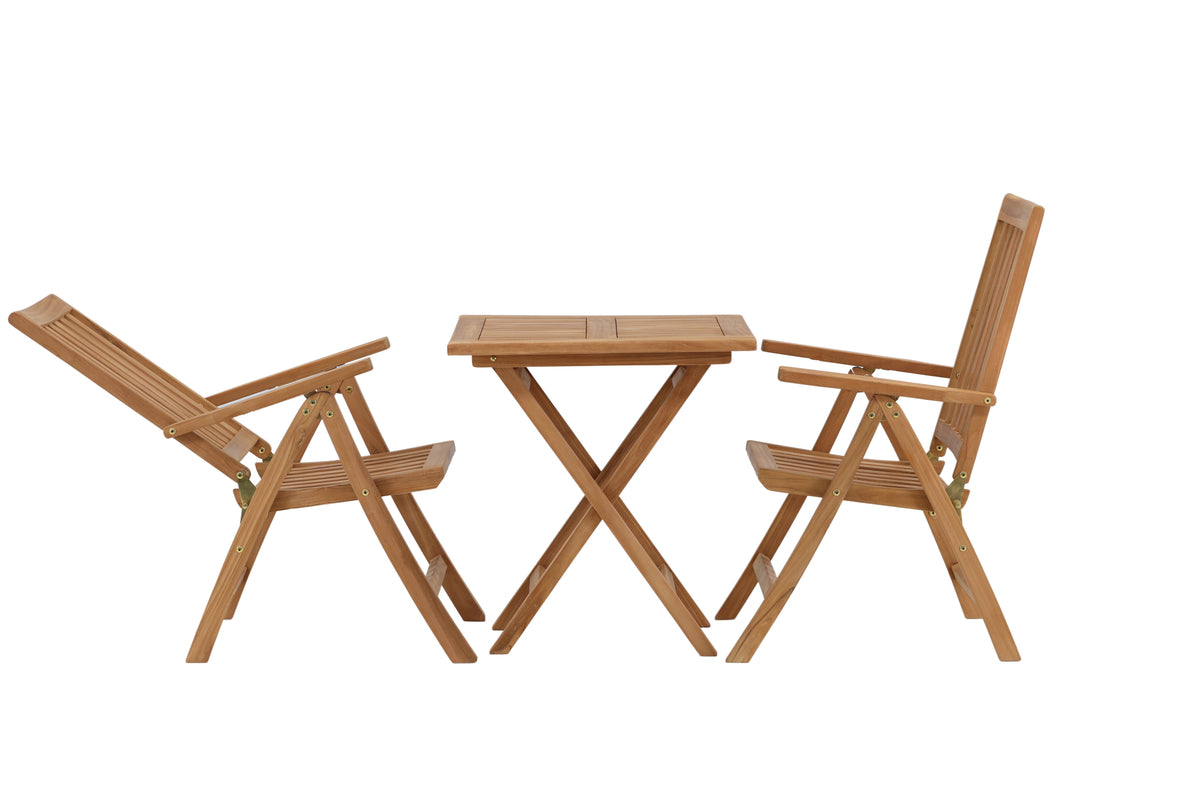 En hyggelig café-gruppe fra serien Kenya er lige hvad din terrasse har brug for! Det nydelige bord er sammenklappeligt i smuk teak og passer perfekt til sommerens alle udendørs morgenmad og eftermiddagskaffe. Med sit klassiske design og smidige design er bordet let at matche og let at flytte rundt. Mål: 70x70 cm. Stolene er fældbare i flere positioner og har armlæn for ekstra komfort. Fremstillet i smagfuld teak i et ribbet design, der giver et meget moderne indtryk. Lad tiden her blive dagens højdepunkt!