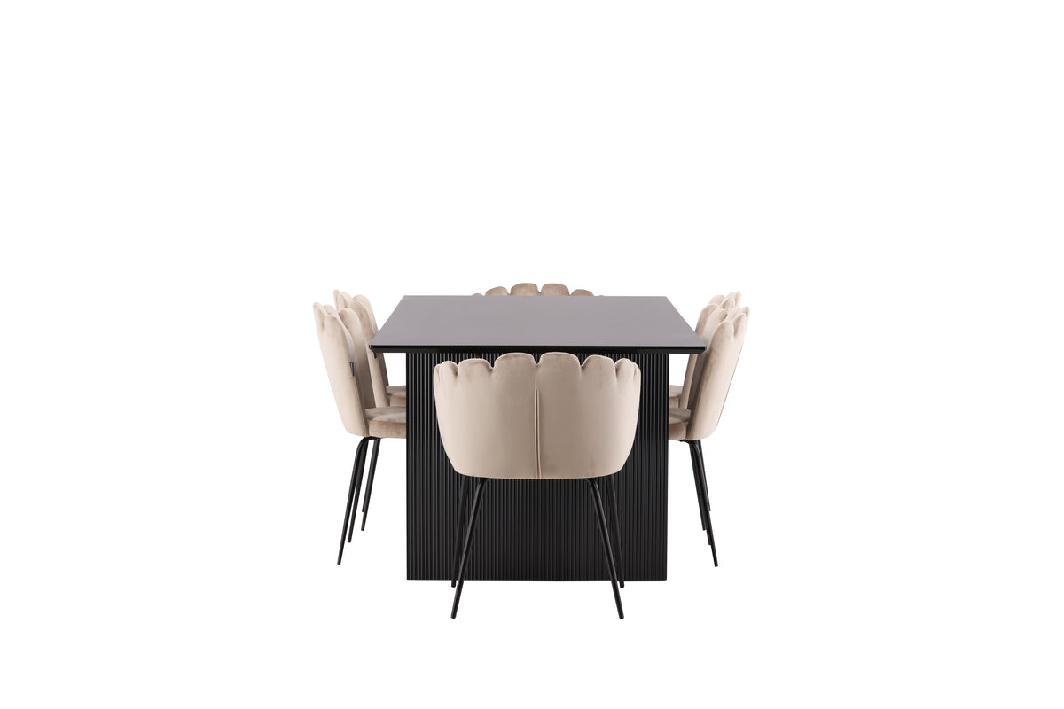 Indret hjertet af dit hjem charmerende og indbydende! Vores rektangulære spisebord fra Vail serien har lige nordiske former og er lavet af holdbar MDF i en sodet sort farve. Bordpladen er tynd og balancerer på to solide træplader, der udgør understellet - så pænt som det er holdbart. Her sammen med spiseborde fra Limhamn serien i luksuriøs beige farve. Stolen er en moderne favorit i mange husstande med sit indbydende design, dekorativt skaldformet ryg med dekorativ syning og en rund sæde i smagfuld beige velourstof. Benene er i sort pulverlakeret metal. Læn dig tilbage, sid komfortabelt og nyd!