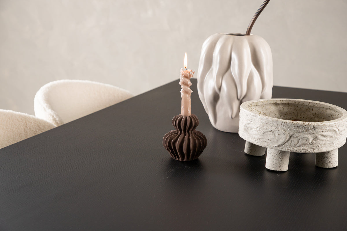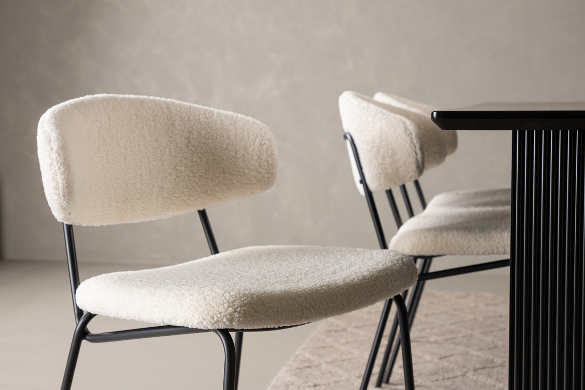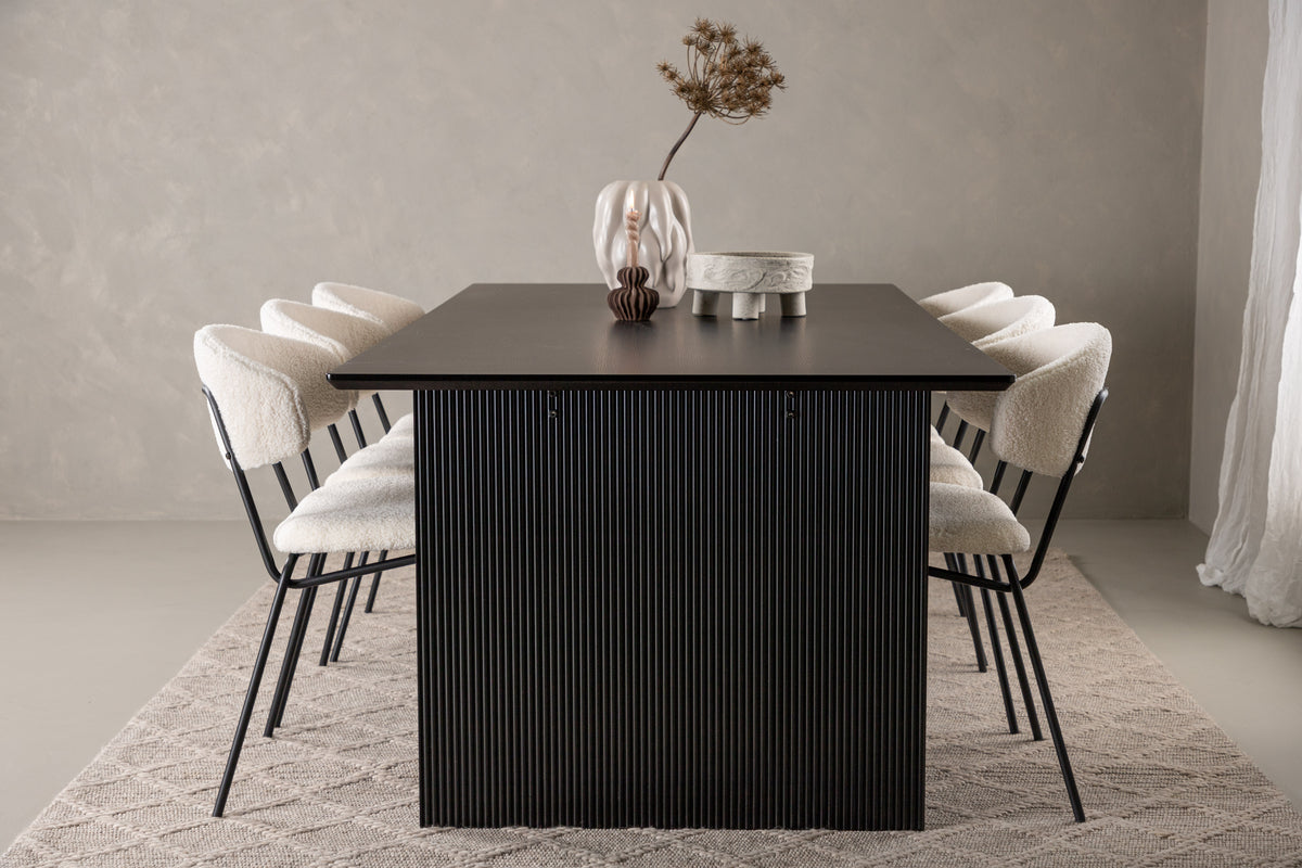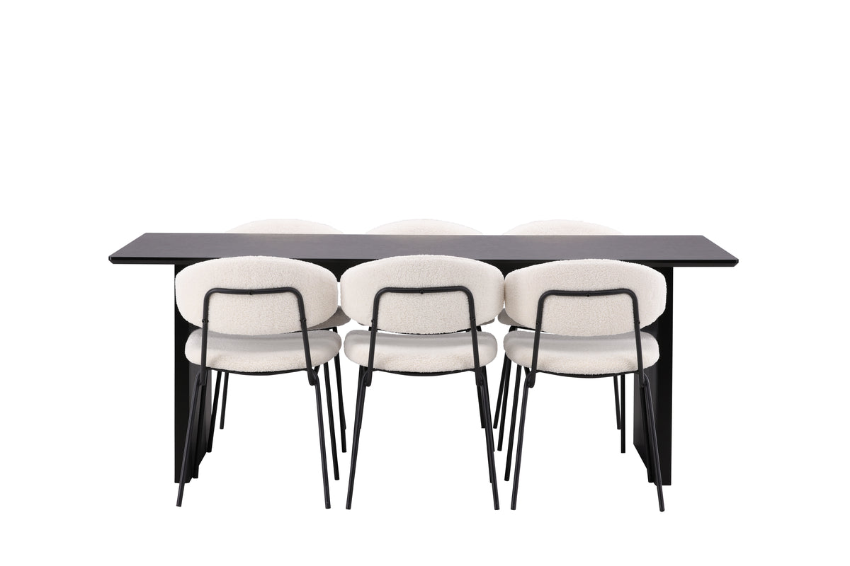 En spisegruppe med alle de rigtige funktioner! Vores rektangulære spisebord fra Vail serien har lige nordiske former og er lavet af holdbar MDF i en sodet sort farve. Bordpladen er tynd og balancerer på to solide træplader, der udgør understellet - så pænt som det er holdbart. Her sammen med vores smagfulde spiseborde fra Chico serien. Stolen har et minimalistisk og komfortabelt design med ryg og sæde i hvid boucle stof og en smal ramme i sort stål. Her får du et blikfang, der imponerer dine gæster!