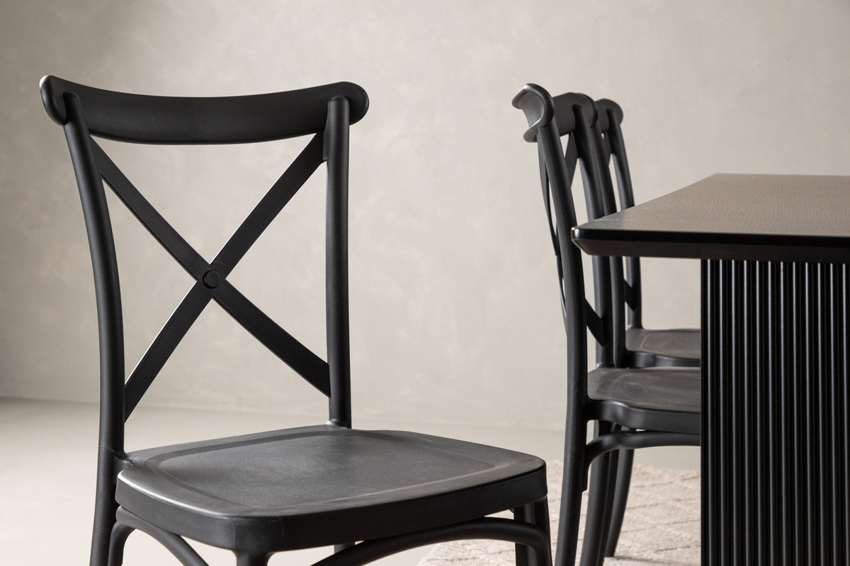 Her kombineres klassisk design og moderne former! Vores rektangulære spisebord fra Vail serien har lige nordiske former og er lavet af holdbar MDF i en sodet sort farve. Bordpladen er tynd og balancerer på to solide træplader, der udgør understellet - så pænt som det er holdbart. Her sammen med spiseborde fra Crosett serien. Stolen har et nostalgisk design med en krydset ryg og lige linjer, konsekvent lavet af sort plastik. Her får du en stilfuld spisegruppe til at indrette dit hjem med!