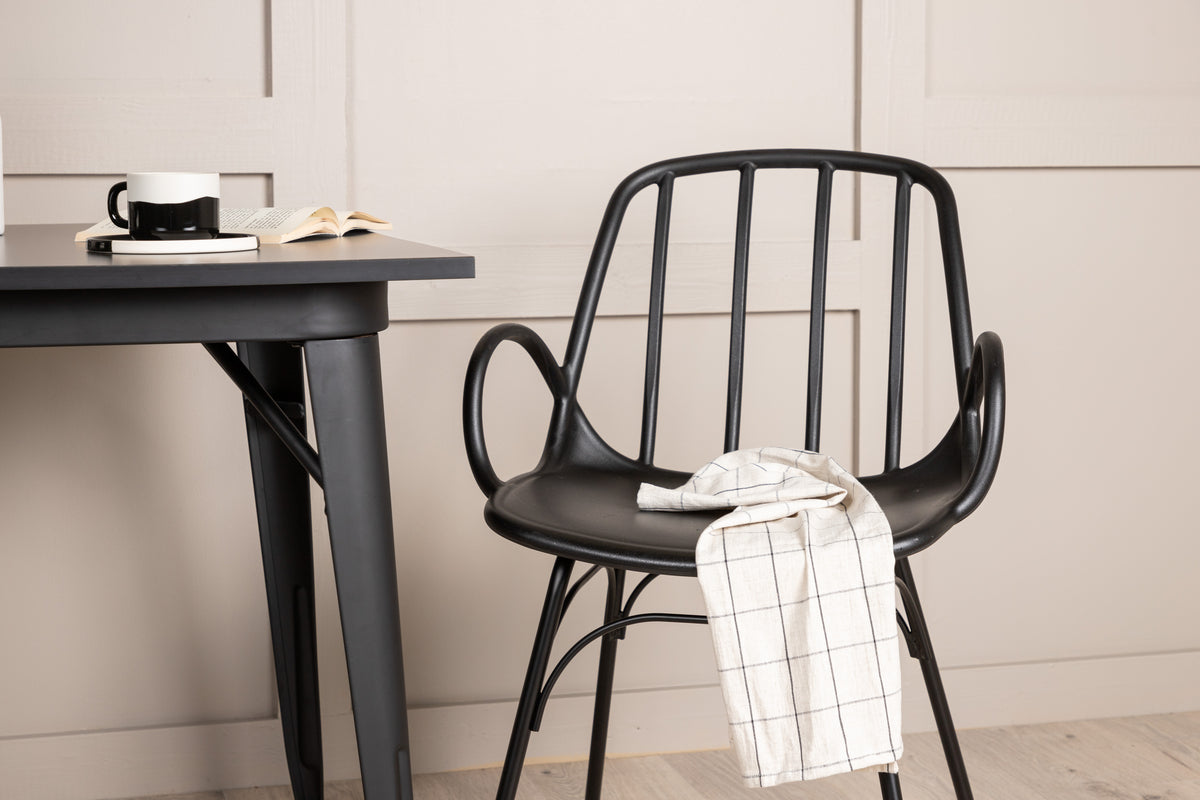 En perfekt spisegruppe til det mindre køkken! Tempe spisebordet har et skandinavisk design med lige nordiske former, der står tidens prøve. Lavet med en kvadratisk bordplade i sort MDF og bordben i sort metal. Her sammen med 2 spiseborde fra serien Dyrön. Stolen er lige så stilfuld som praktisk, lavet af sort plastik og stål. Stolen har integrerede armlæn og et ribbet design i den let afrundede ryg. Indret smart og indbydende med en trendy sort spisegruppe!