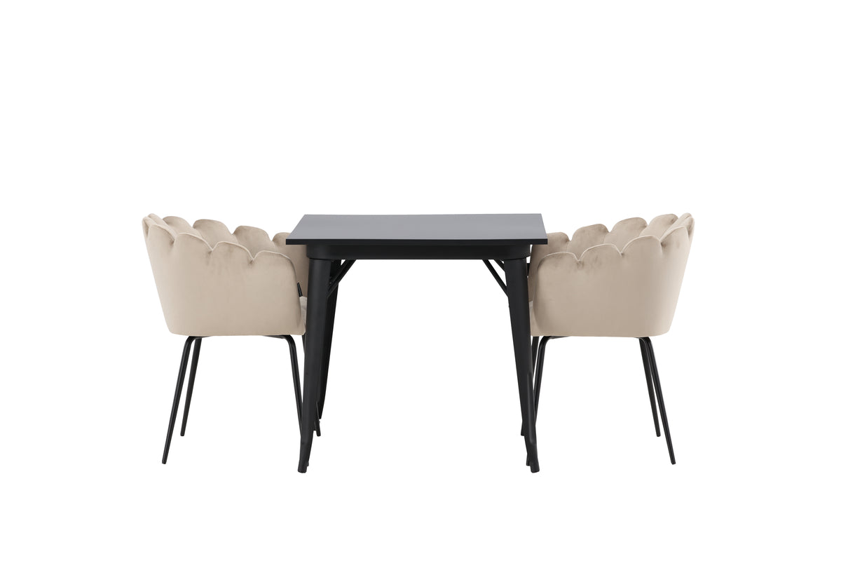 En pæn spisegruppe, der udstråler luksus og elegance! Dette spisebord fra Tempe serien har et klassisk, kvadratisk design og en tidløs sort farve. Bordpladen er i sort MDF og bordbenene i sort metal. Her i en smagfuld kombination med to komfortable spiseborde fra Limhamn serien. Stolen er en moderne favorit i mange husstande med sit indbydende design, dekorative skaldformede ryg med dekorativ syning og et rundt sæde i smagfuldt beige velourstof. Benene er i sort pulverlakeret metal. Sid komfortabelt og storslået!