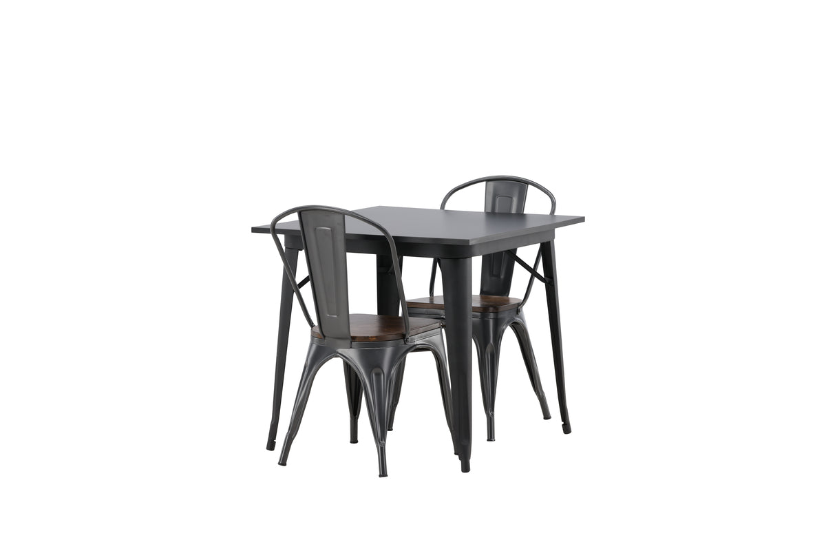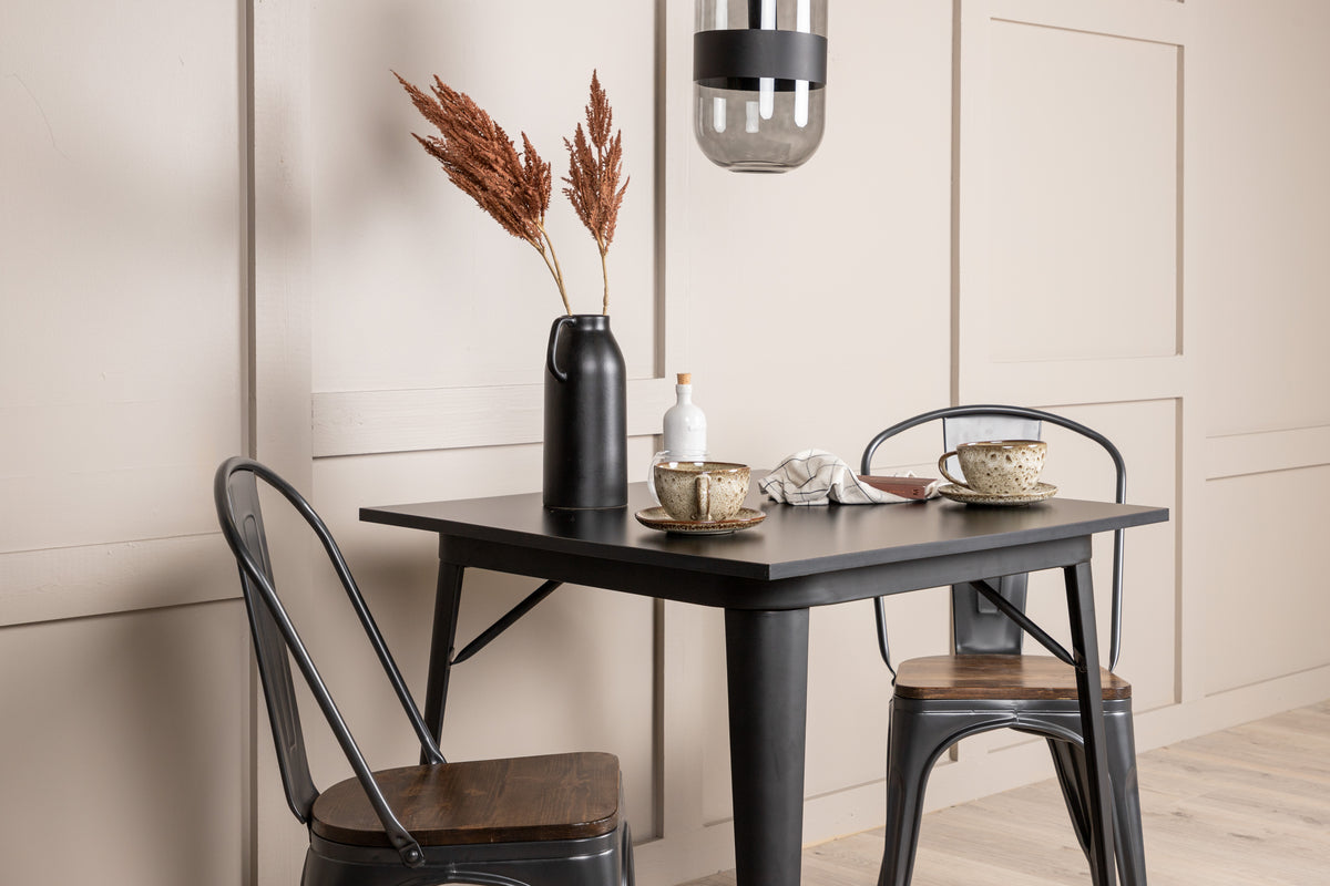 Skab et matchende blikfang i det mindre køkken med en spisegruppe fra Tempe serien! Bordet har et klassisk, kvadratisk design og en tidløs sort farve. Bordpladen er i sort MDF og bordbenene i sort metal. Her sammen med spiseborde fra den samme serie. Stolen tilhører Venture Home kollektionen og har et klassisk design af en rustik stol med let udadvendte ben i mørkegrå stål og et sæde i mørkt træ. Indret smart og stilfuldt!