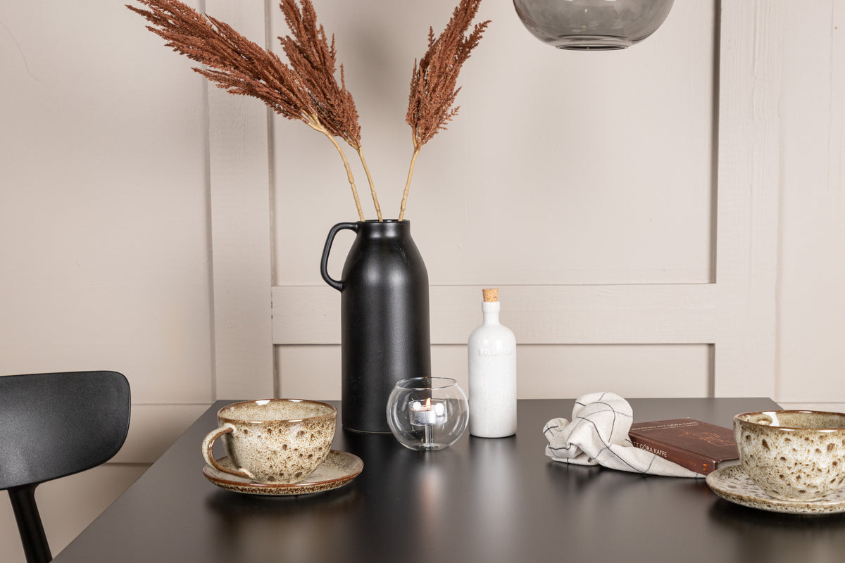En perfekt spisegruppe til det mindre køkken! Tempe spisebordet har et skandinavisk design med lige nordiske former, der holder tidens prøve. Lavet med en kvadratisk bordplade i sort MDF og bordben i sort metal. Her sammen med 2 spiseborde fra Ursholmen serien. Lavet af holdbart plastik i en sodet sort farve, der er nem at matche med andet interiør. Stolen har en pæn ryg, en lidt dybere sæde og let udvidede ben i et dejligt skandinavisk design. Indret smart og indbydende med en trendy sort spisegruppe!