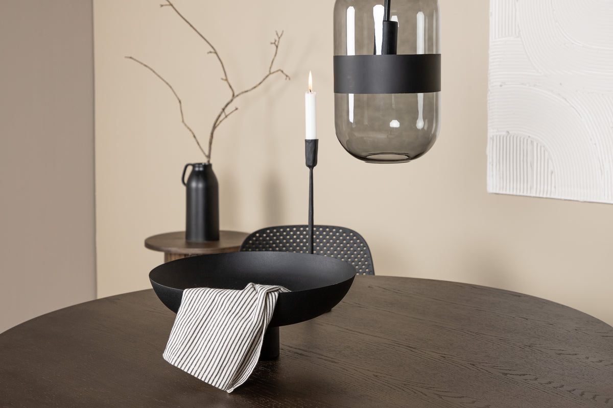 Hæv niveauet af stil i hjertet af dit hjem - denne spisegruppe imponerer dine gæster med sit skandinaviske design! Vores runde spisebord Stone har et dejligt design, der passer til mængden. Bordet har en smuk brunfarvet bordplade i MDF med finer og en dekorativ cylinderformet bund i sort metal. Her sammen med spiseborde fra Baltimore serien. Stolen har et industrielt design i sort plastik, hvilket gør dem lige så stilfulde som de er holdbare. Skab et charmerende midtpunkt i dit hjem!