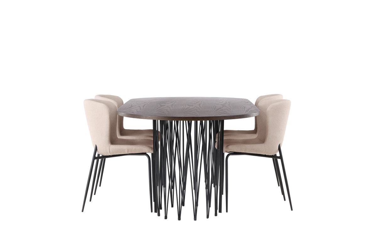 Velkommen hjem til et charmerende midtpunkt! Vores ovale spisebord Stone imponerer med sit modebevidste design. Bordet har en smuk brunfarvet bordplade i MDF med finer og to dekorative cylindriske rammer i sort metal. Her sammen med modebevidste spisebordsstole fra Modesto serien. Stolen er fuldpolstret i grå shaggy stof med stilfulde smalle stolben i sort metal. Den let afrundede ryg og det polstrede sæde giver ekstra komfort og forlængelse af behagelige måltider omkring spisebordet. Sid komfortabelt med venner og familie! Bordmål: 220x100cm.
