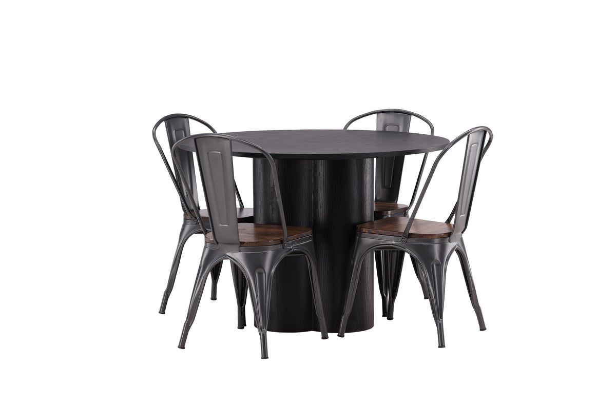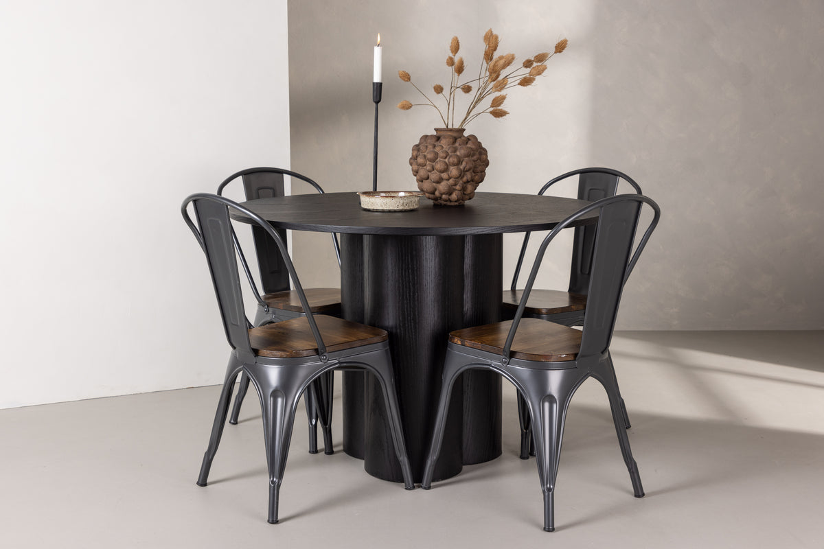 Indret stuen minimalistisk og moderne! Spisebordet Olivia imponerer med sit skandinaviske design og smagfulde design. Bordet har et samlet holistisk design i sort MDF med en tynd, rund top og tre cylindrisk formede ben, der samles under midten af bordet. Her sammen med stole fra Tempe serien i klassisk design. Stolene har let udvidede ben, der glat møder sædet og ryggen i et stilfuldt design, konsekvent lavet af sort metal. Sædet er i mørkebrunt træ, hvilket bliver en stilfuld detalje. Nyd behagelige måltider i fremtiden!