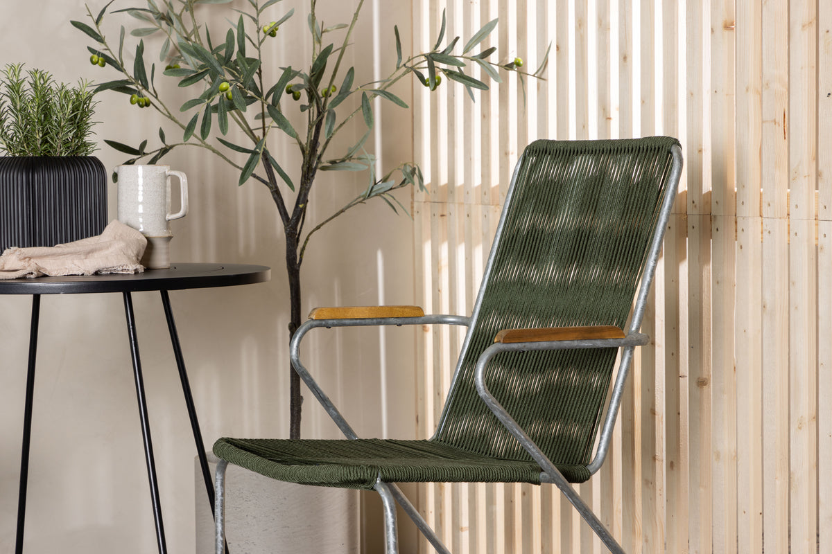 Skab et moderne og charmerende blikfang på den lille balkon eller terrasse! Spisebordsstolene fra serien Bois har et smækkert design i trendsikkert design. Fremstillet i stilren zinkkonstruktion, sæde i smækkert grønt reb og dekorative armlæn i teak. Her i flot kombination med et net cafébord fra serien Bacong. Bordet har en net, rund bordplade og smalle ben i sort stål. Dæk op til fika til sommer og nyd hyggelige stunder.
