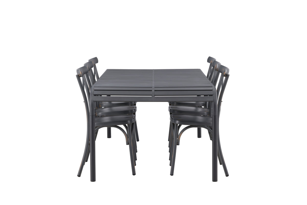 Indret udestuen gennemtænkt med en lækkert matchende, sort spisegruppe! Det rektangulære spisebord Borneo har smidige former med en ribbet bordplade, der bølger ned langs kanterne ved benene. Gennemgående fremstillet i det slidstærke materiale aluminium. Her sammen med moderne spisebordsstole fra serien Tablas. Stolen har en industriel stil og er fremstillet i slidstærkt aluminium i en sodet sort farve. Spisegruppen er velegnet til udendørs brug! Bordets mål: 200x100x75cm.