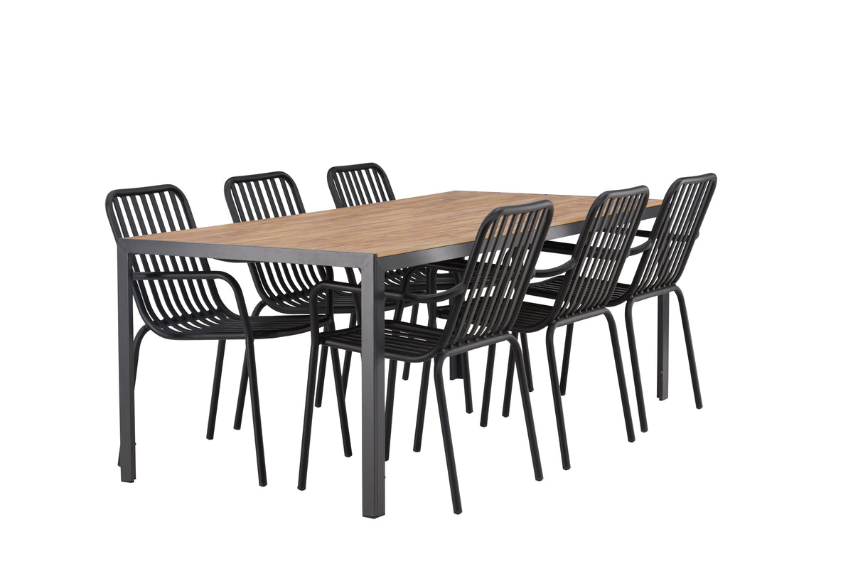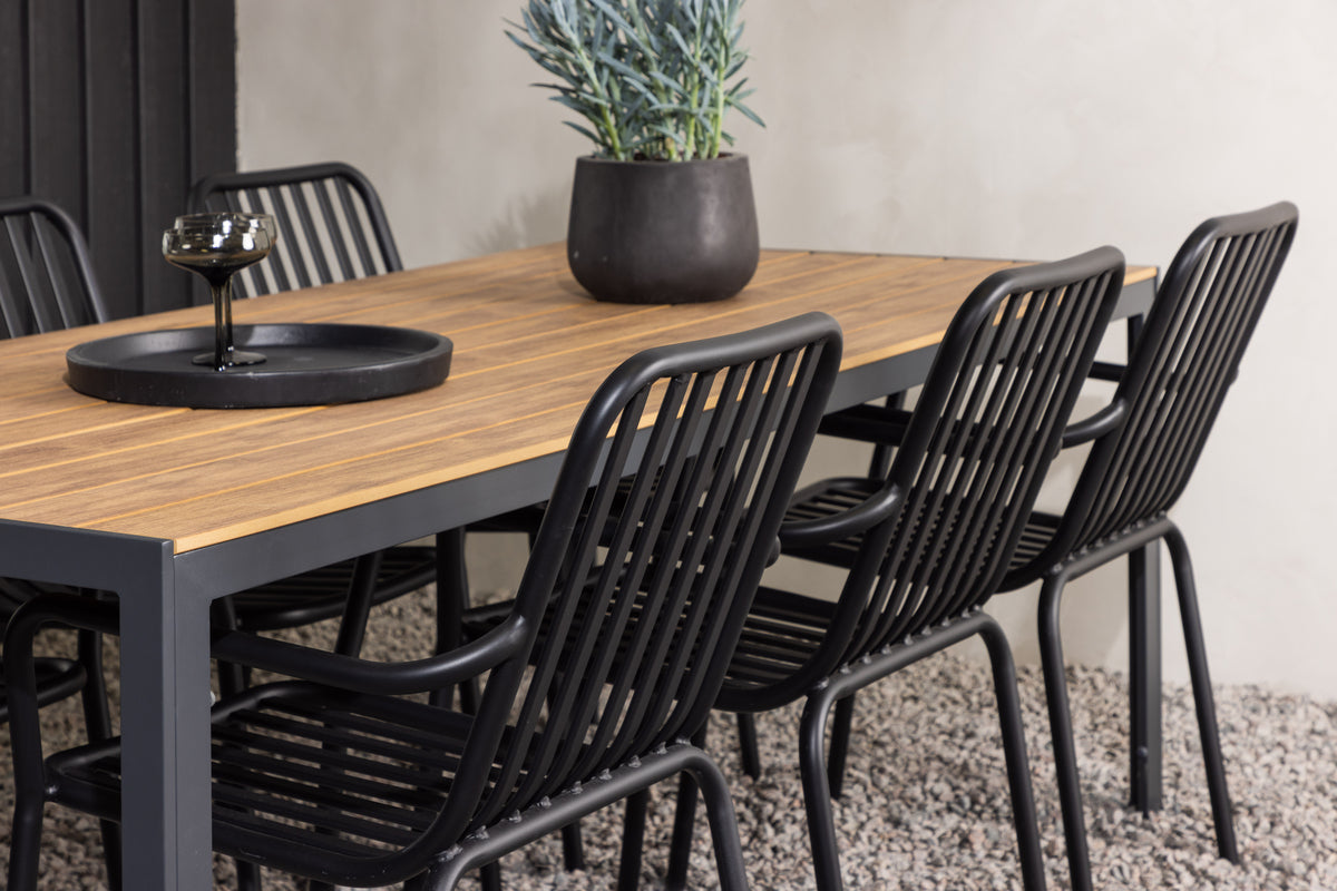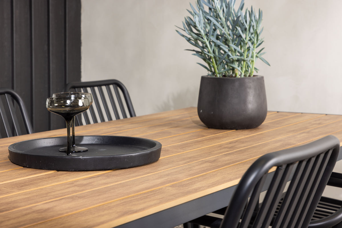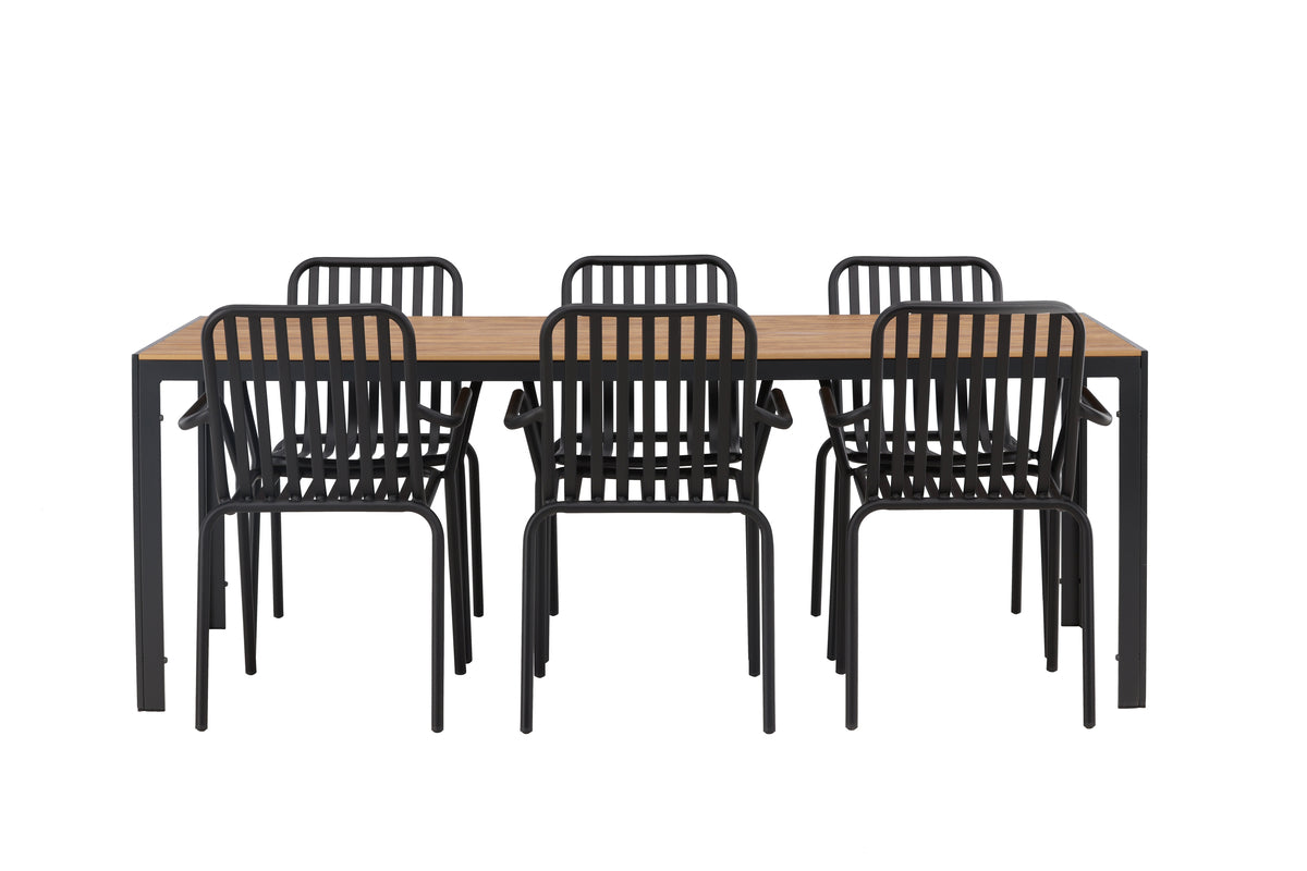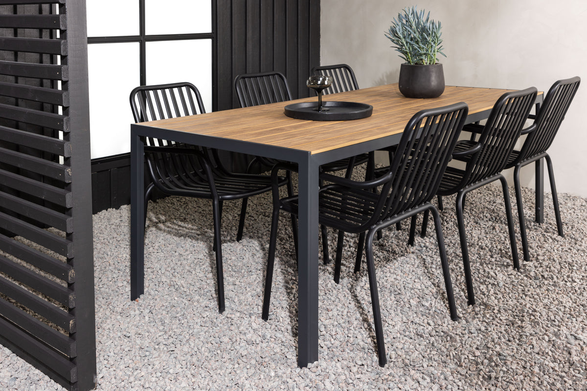 Skab et trendy blikfang på din terrasse med en spisegruppe, der matcher! Vores rektangulære spisebord Break har lige former i klassisk nordisk design med en bordplade i krydsfiner og bordben i sort aluminium. Her i en flot kombination med spisestole fra serien Peking. Stolens ribbede udførelse og sodfarvede sorte kulør gør, at den både føles moderne og tidløs. Fremstillet i aluminium, som gør den nem at flytte rundt, og integrerede armlæn for ekstra komfort. Her bliver du siddende længe og nyder det på din terrasse! Bordets mål: 200x90cm.