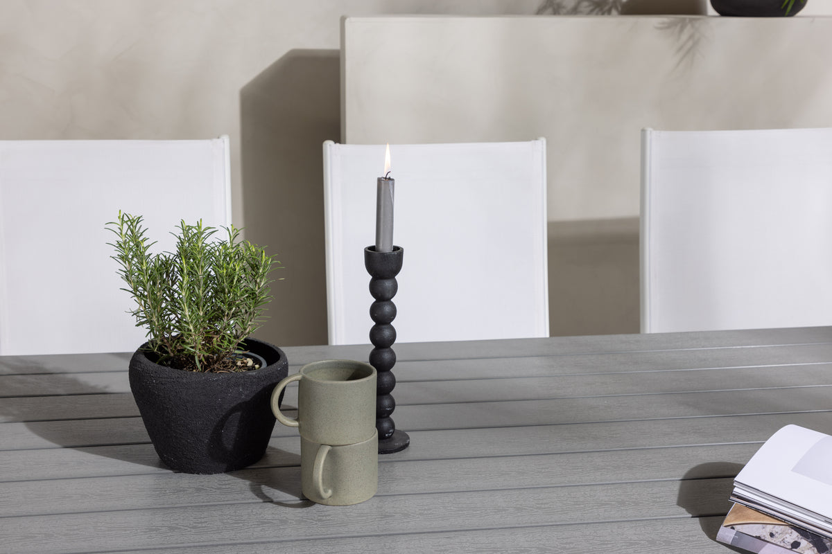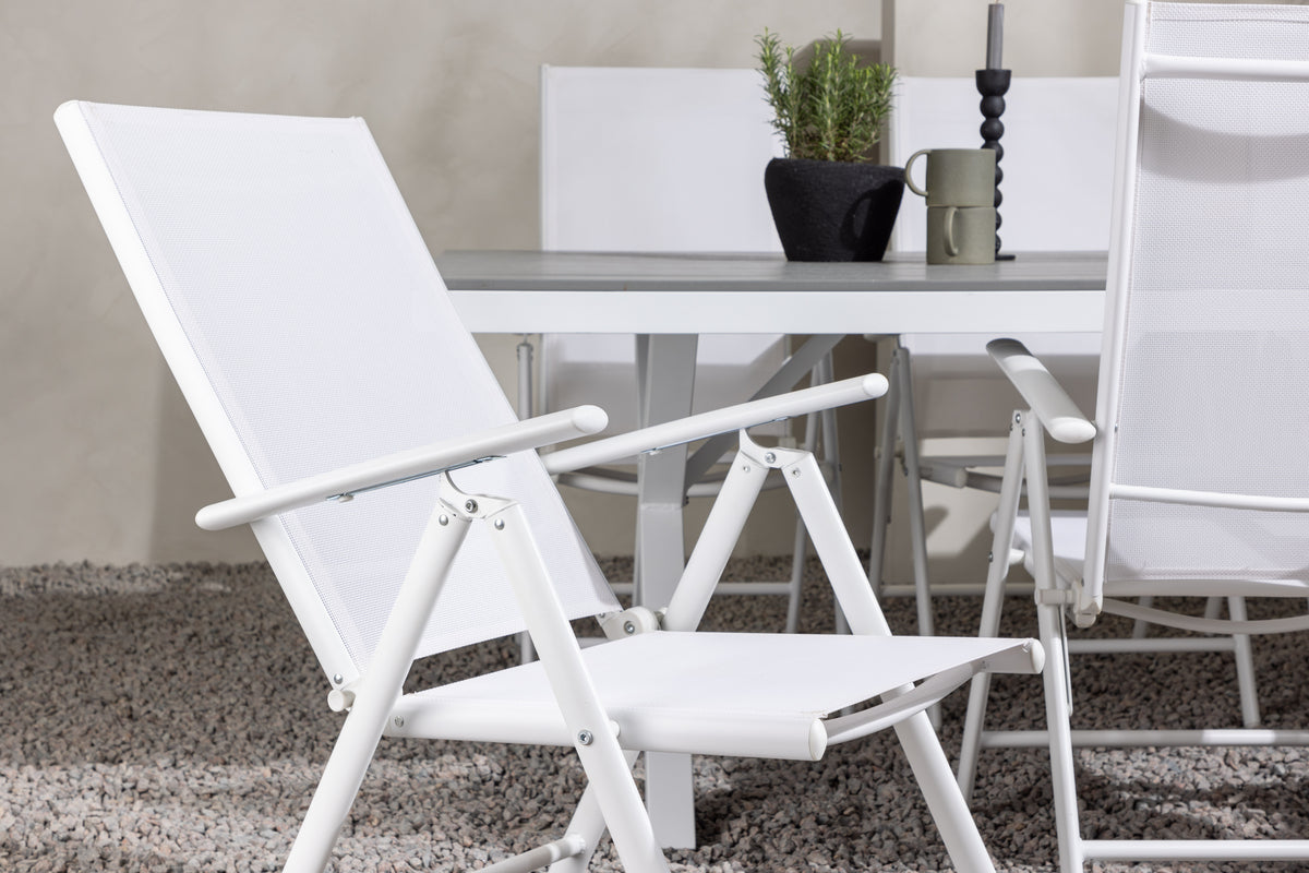 Skab et lyst og friskt blikfang på din terrasse! Vores rektangulære spisebord Garcia har et klassisk design med en bordplade i smagfuld aintwood og krydsede bordben i hvid aluminium. Her sammen med vores foldbare spisestole fra samme serie: Break. Stolen har et sæde i hvid textilene og stoleben i hvid aluminium. Den foldbare funktion giver dig en praktisk stol med høj komfort. Gør dig klar til et enestående udeliv til sommer! Bordets mål: 200x100cm.