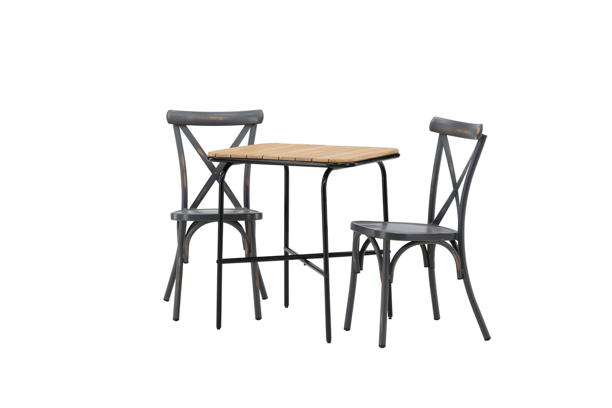 En café-gruppe med lige så gennemtænkt design som slidstærk! Vores stilrene cafébord Holmbeck har en moderne, ribbet bordplade i akacie og et minimalistisk understel i sort stål. Her sammen med 2 stk. sorte spisebordsstole fra serien Tablas. Stolen har en industriel stil og er fremstillet i slidstærkt aluminium i en sodfarvet sort farve. Her kan du nemt dække op til kaffe og nyde rolige stunder! Bordets mål: 74x70x55cm.