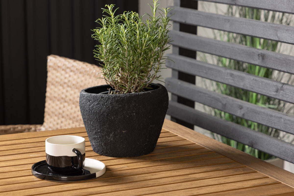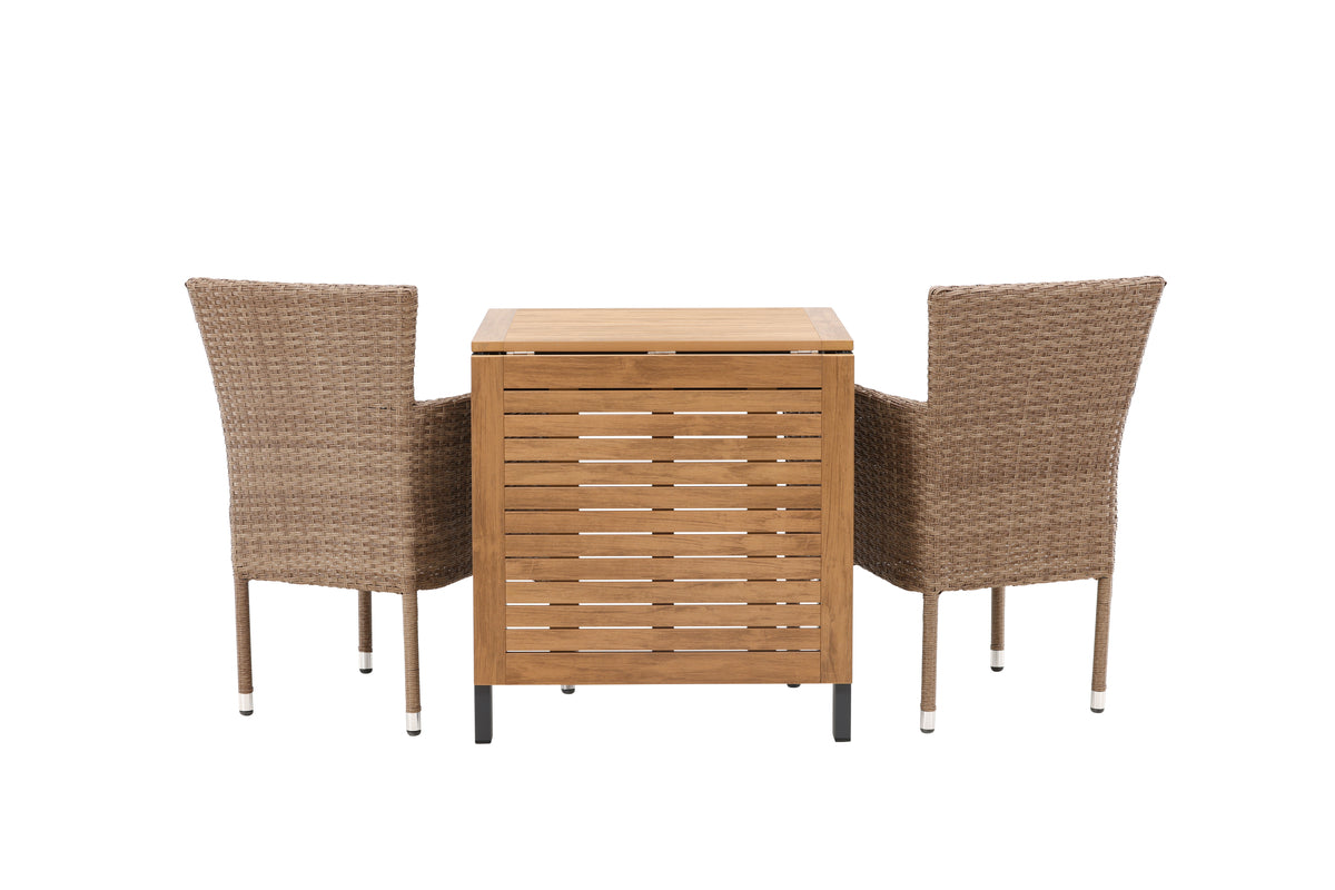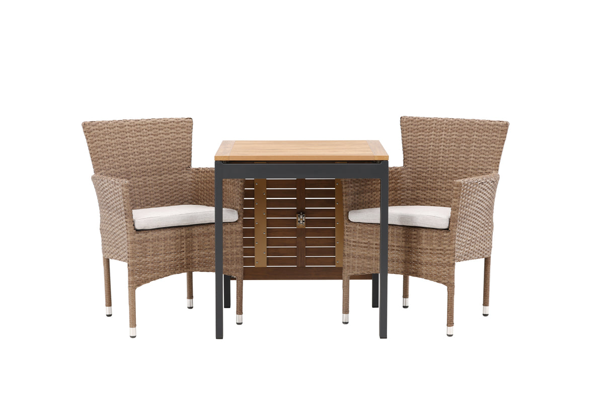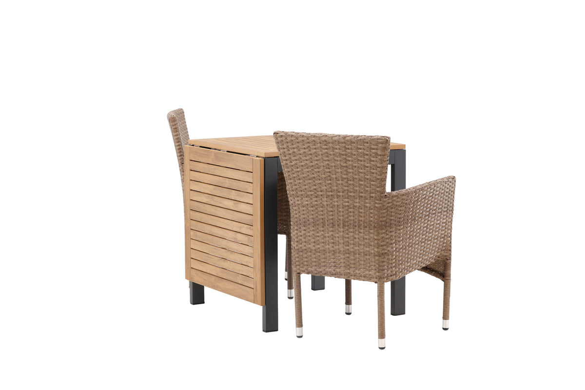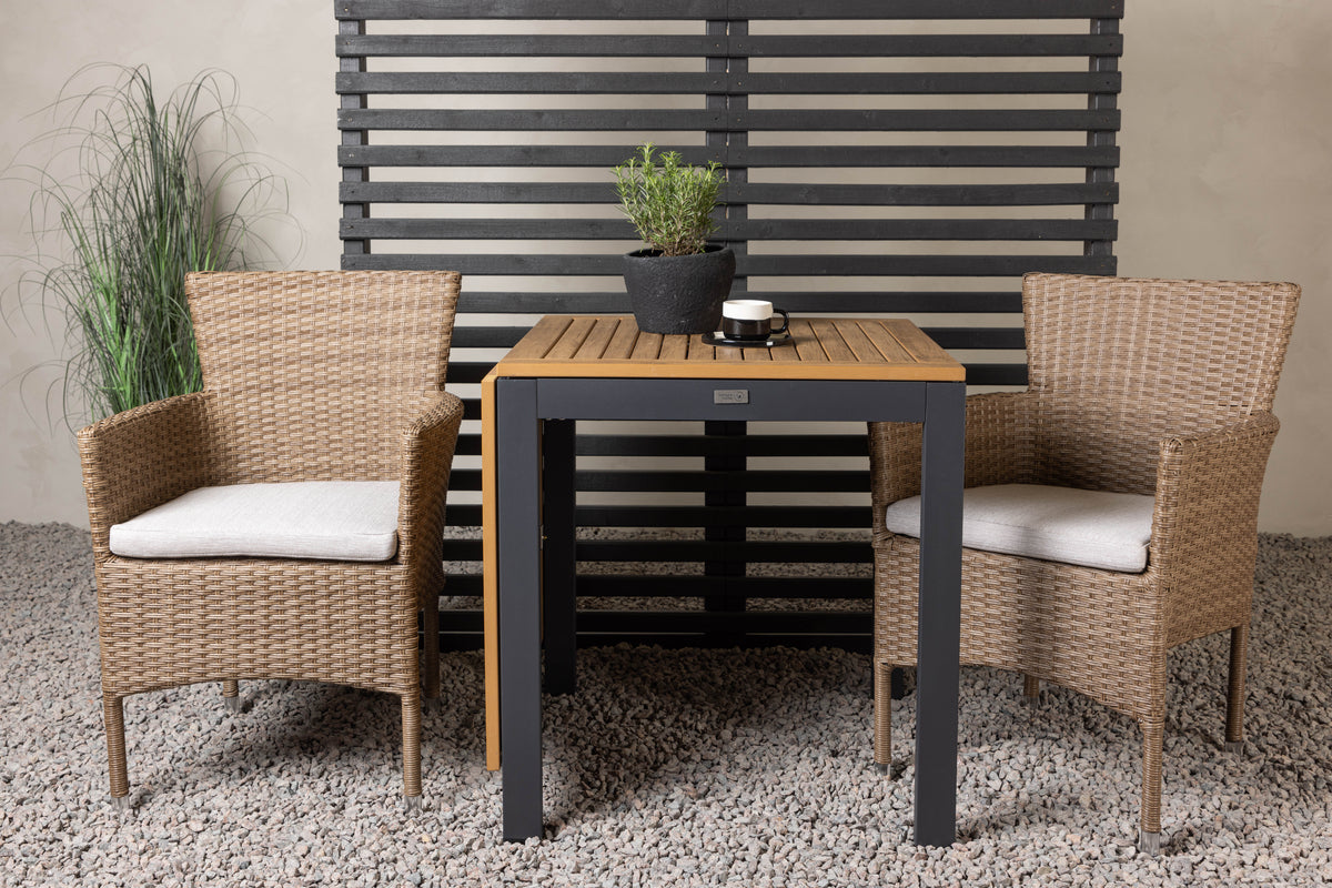En charmerende café-gruppe i jordnære farver! Cafébordet Diego er lige så smart som stilrent med en bordplade i brun aintwood og ben i sort aluminium. Bordet har også en enkel konstruktion, der gør, at du let kan folde forlængerpladerne op eller ned langs siderne. Her i kombination med 2 stk. komfortable spisestole fra serien Malina. Stolen har en ramme i aluminium og er beklædt med kurveflettet, beige kunstrotting. Det skal føles rart at slå sig ned til eftermiddagskaffen udendørs! Bordets mål: 130/70x70cm.