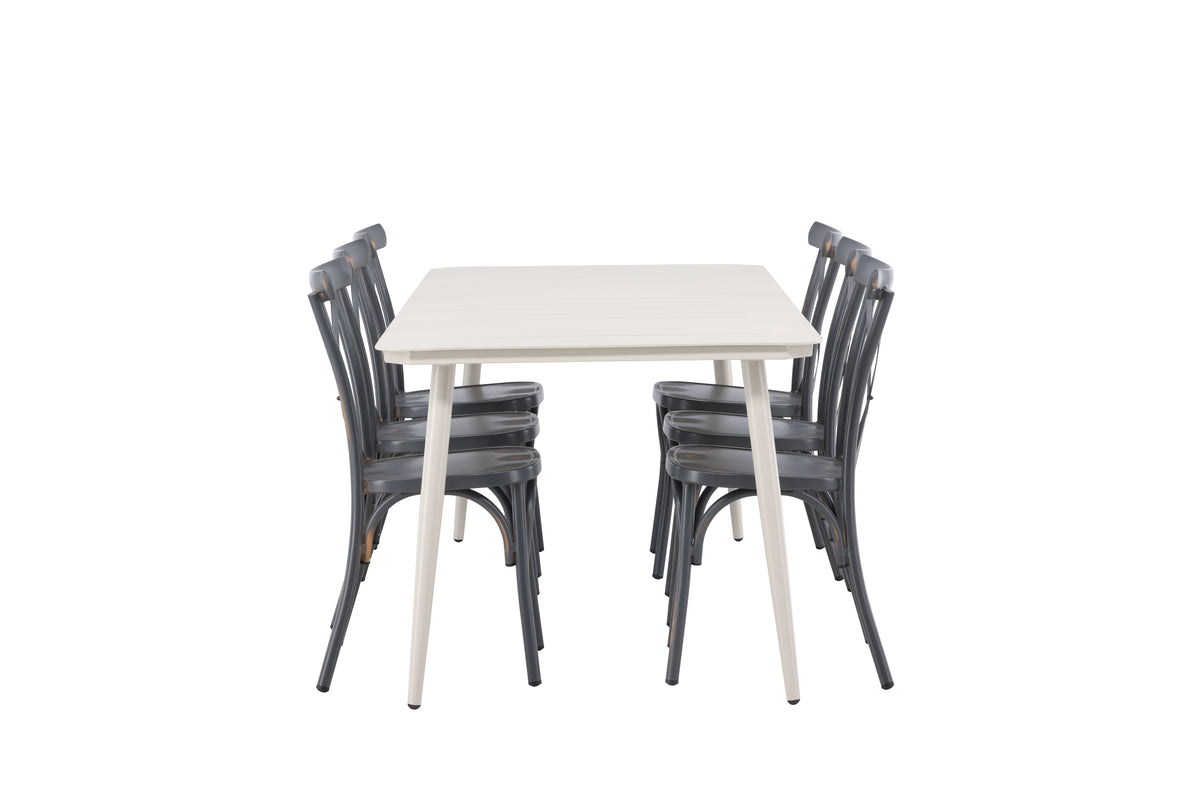 Vores tidløse og smarte, rektangulære spisebord fra serien Lina passer til alle lejligheder og holder over tid. Den stilrene farve i beige og minimalistiske design gør, at det passer til en stor variation af supplerende møbler. Her i perfekt kombination med spisestole fra serien Tablas i industriel design. Stolen har et krydset ryglæn og let udadgående ben for et stabilt indtryk. Fremstillet i slidstærkt aluminium i en sodet sort farve. Sid behageligt og skab et flot blikfang på terrassen! Bordets mål: 200x90cm.