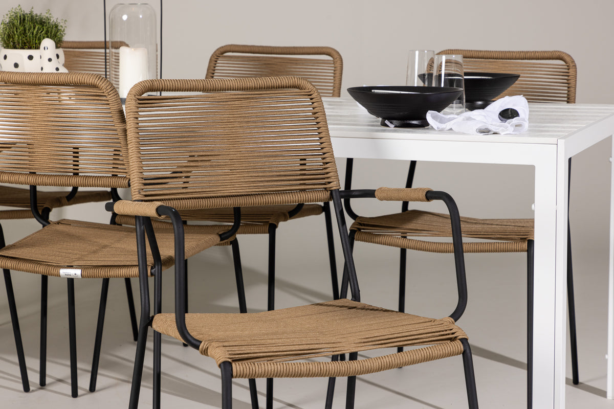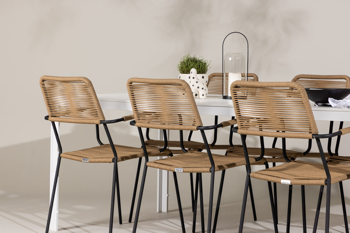 Lindos stolene, med deres brune sæder i rebmateriale og sorte stålrammer, tilbyder både komfort og holdbarhed. Deres naturlige udseende giver et rustikt touch til dit udendørsmiljø.