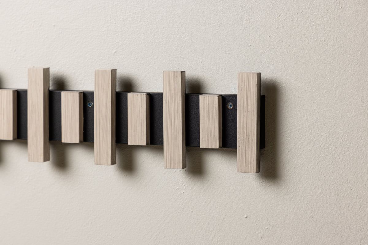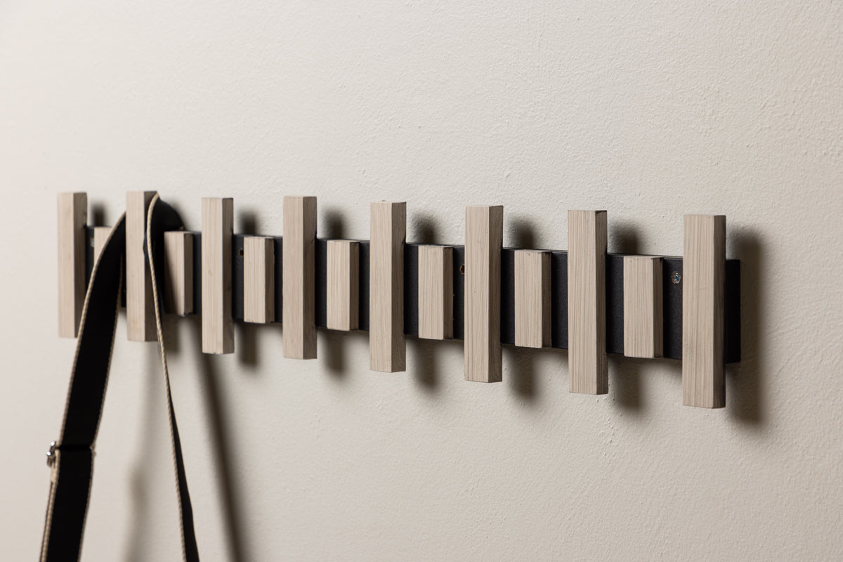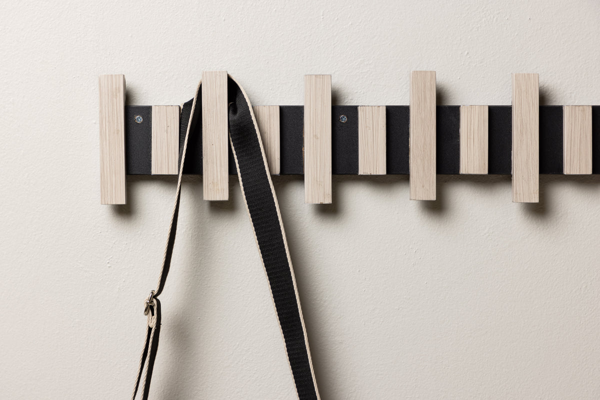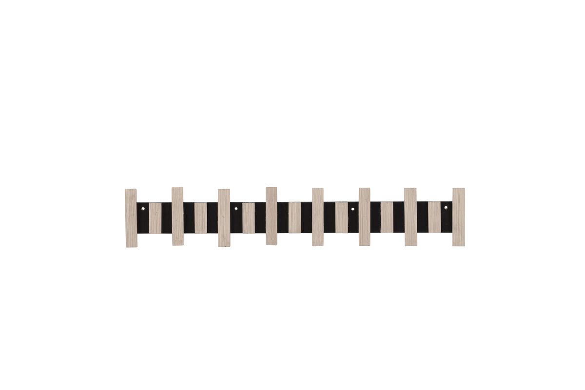 Denne smarte knagerække fastgøres på væggen i en sort metalskinne, der bærer flere knager i hvidpudset MDF. Lige så smart som flot, simpelthen med et diskret design, der bærer alt, hvad du ønsker at hænge af i entréen.