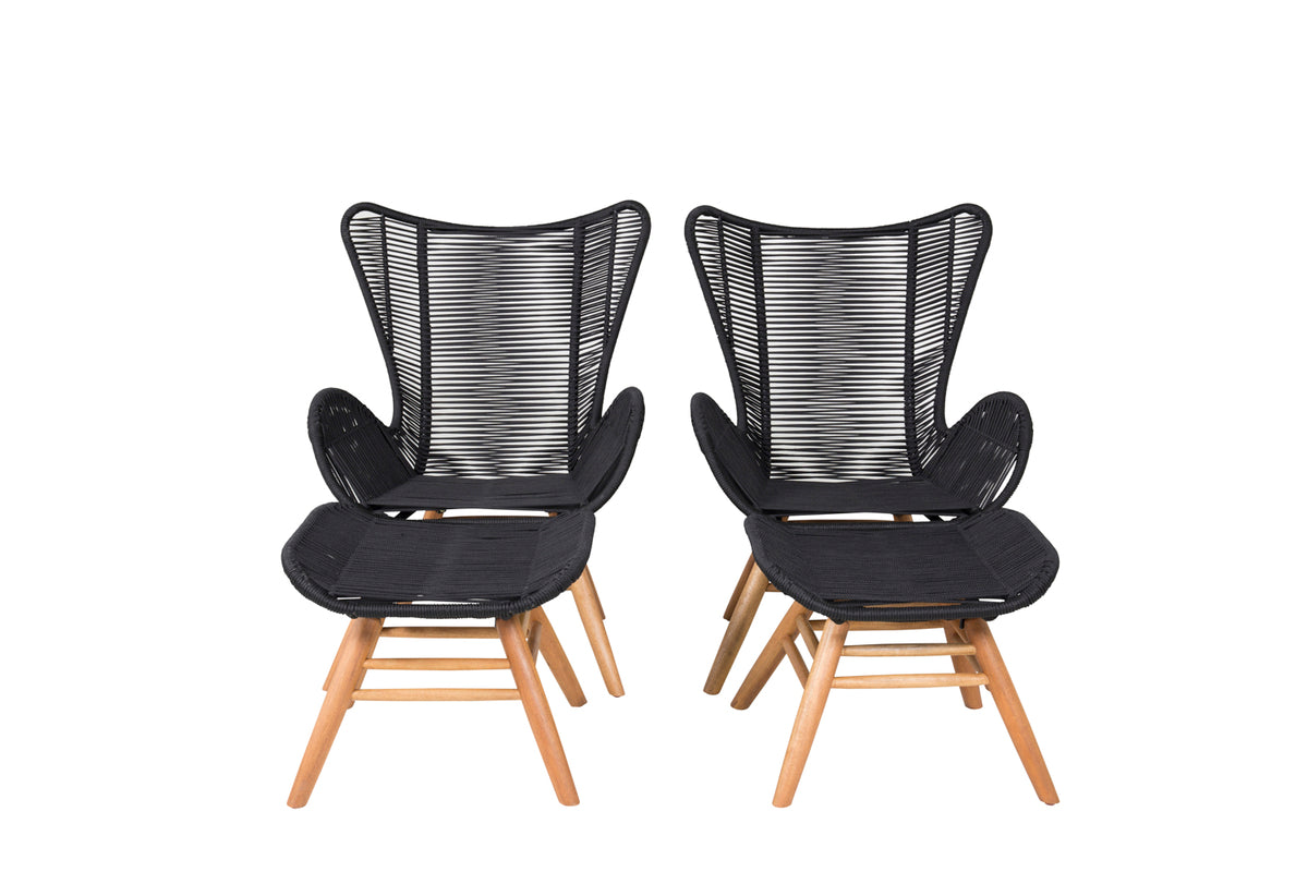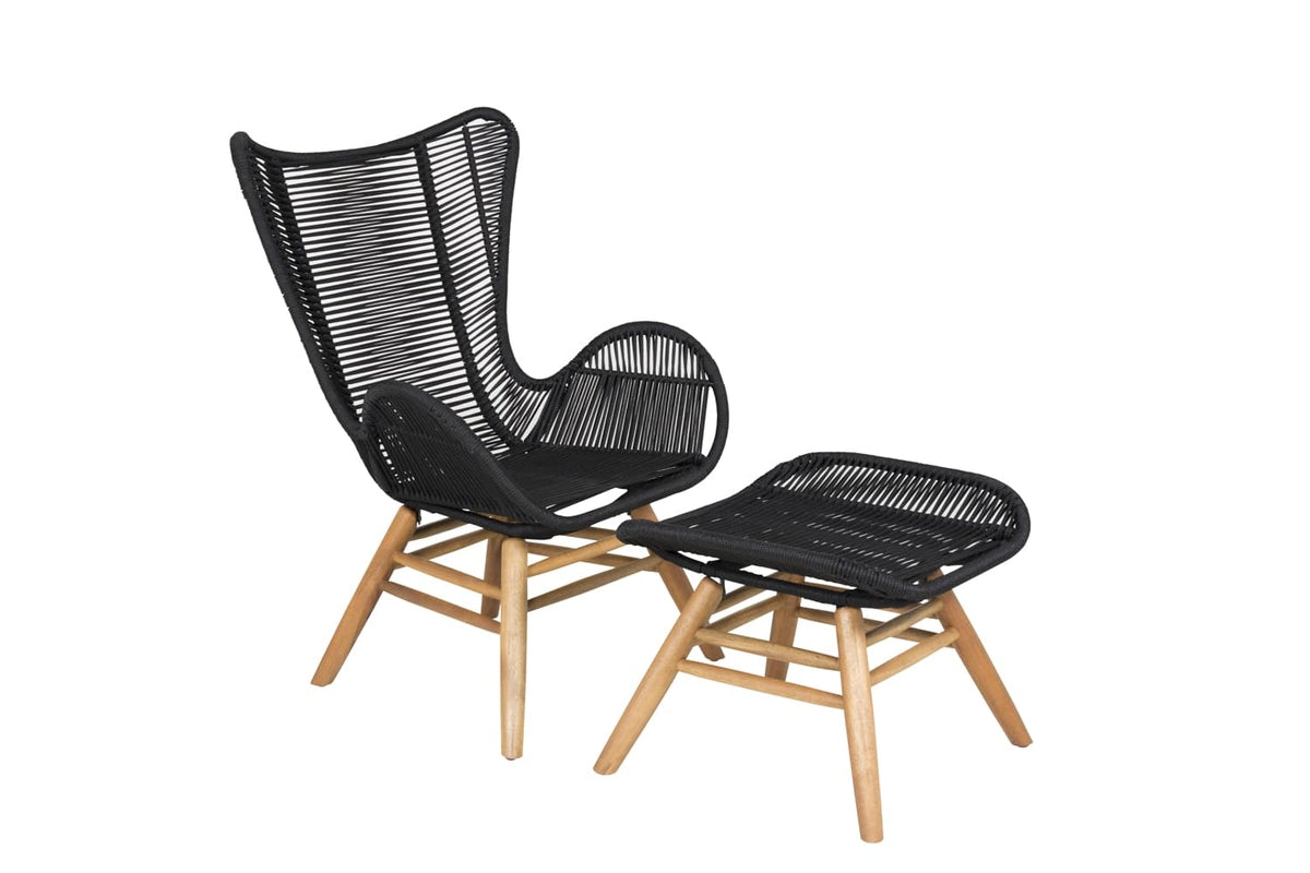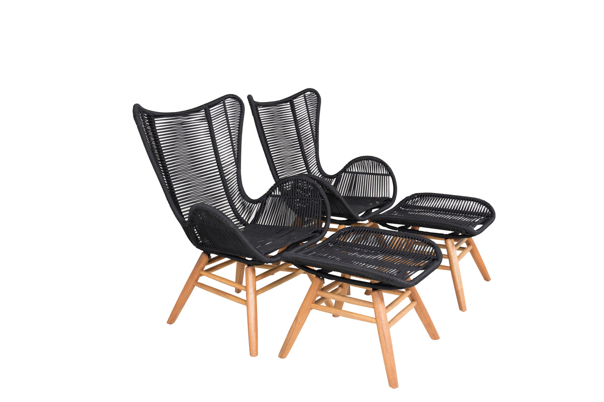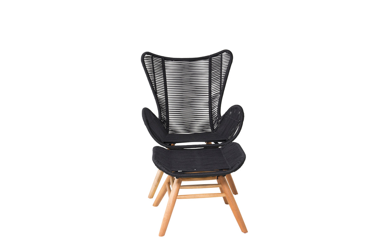 Lige så flot i sit design som behagelig at sidde i. Tjingeling er en loungestol med tilhørende fodskammel, der garanteret bliver et moderne blikfang på terrassen. Benene er fremstillet i acacia og sædet i slidstærkt vævet reb. Gør dig klar til sommerens udeliv!