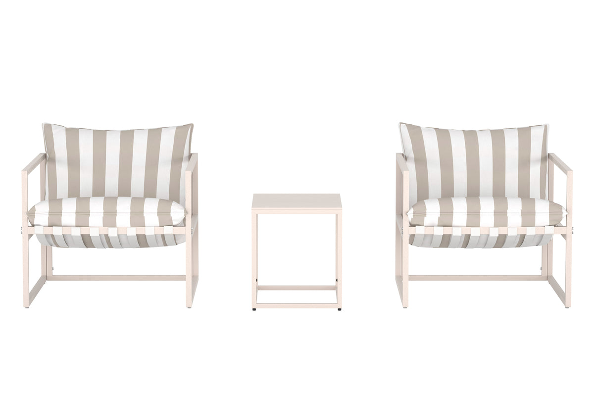Messina er et elegant loungesæt, der kombinerer moderne form med afslappet følelse. Sættet består af to generøse lænestole med bløde hynder i et dejligt stribet stof samt et smart bord – perfekt til kaffekoppen, aften drinken eller yndlingsbogen.