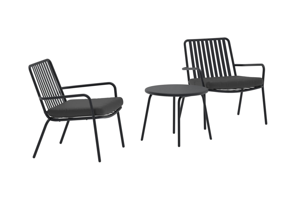Mykonos er et moderne loungesæt, der kombinerer tidløst design med høj komfort. Sættet består af to elegante lænestole med behagelige hynder og et matchende bord – perfekt til morgenkaffen, aften drinken eller en stunds afslapning i solen. Det stilrene sorte design gør, at Mykonos passer lige så godt på balkonen som på terrassen eller i haven. Med sin letplaceret størrelse og harmoniske udtryk bliver det et naturligt samlingspunkt, hvor du kan nyde både hverdag og ledige stunder.