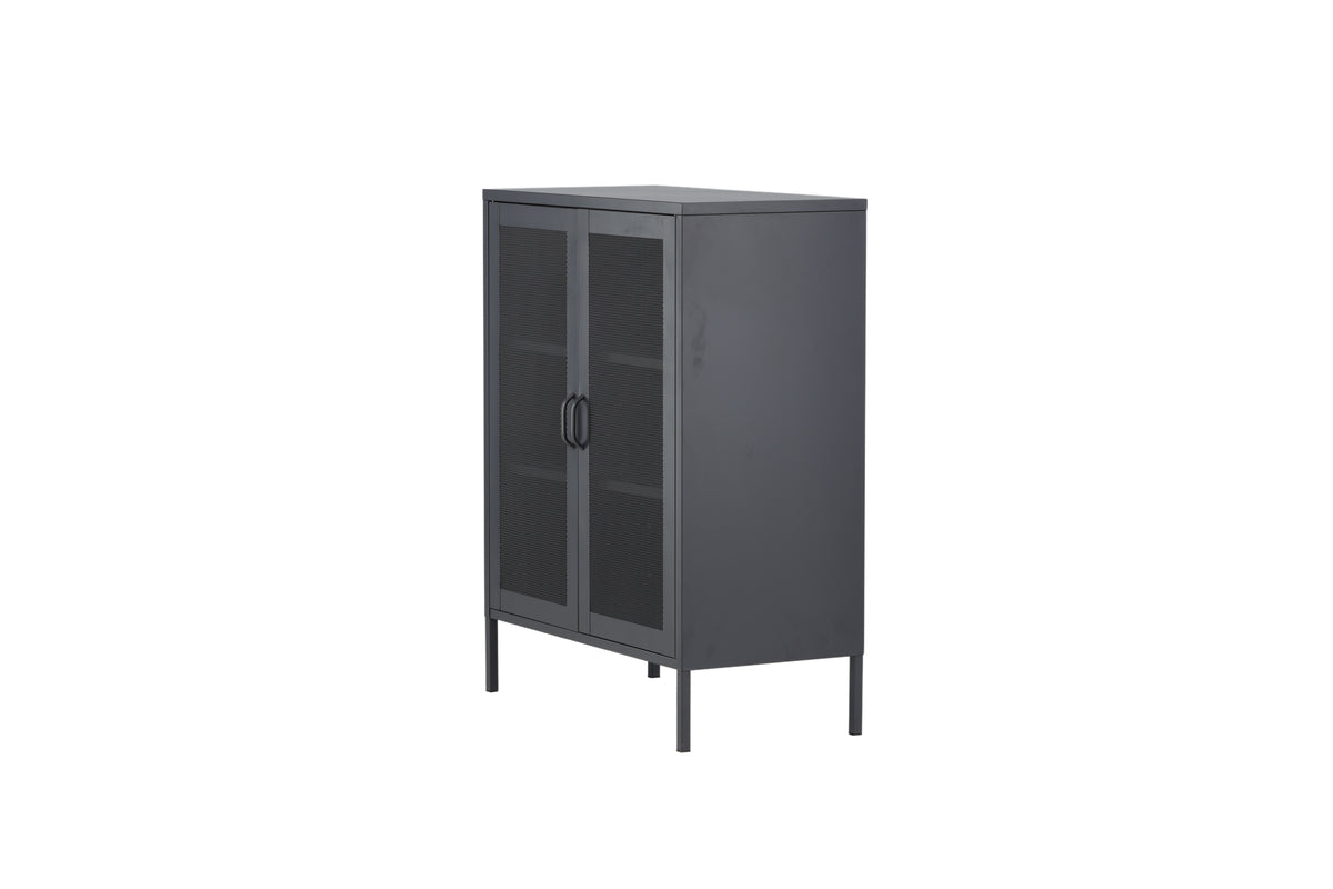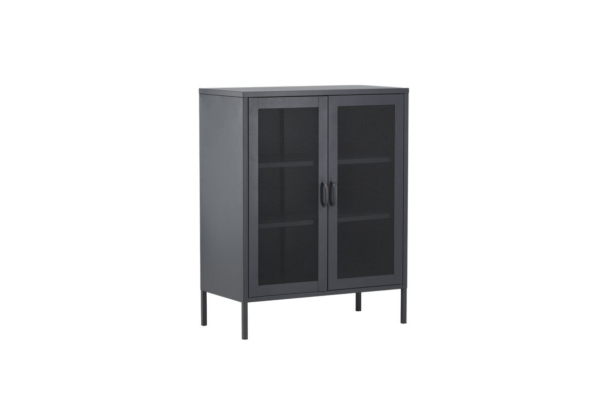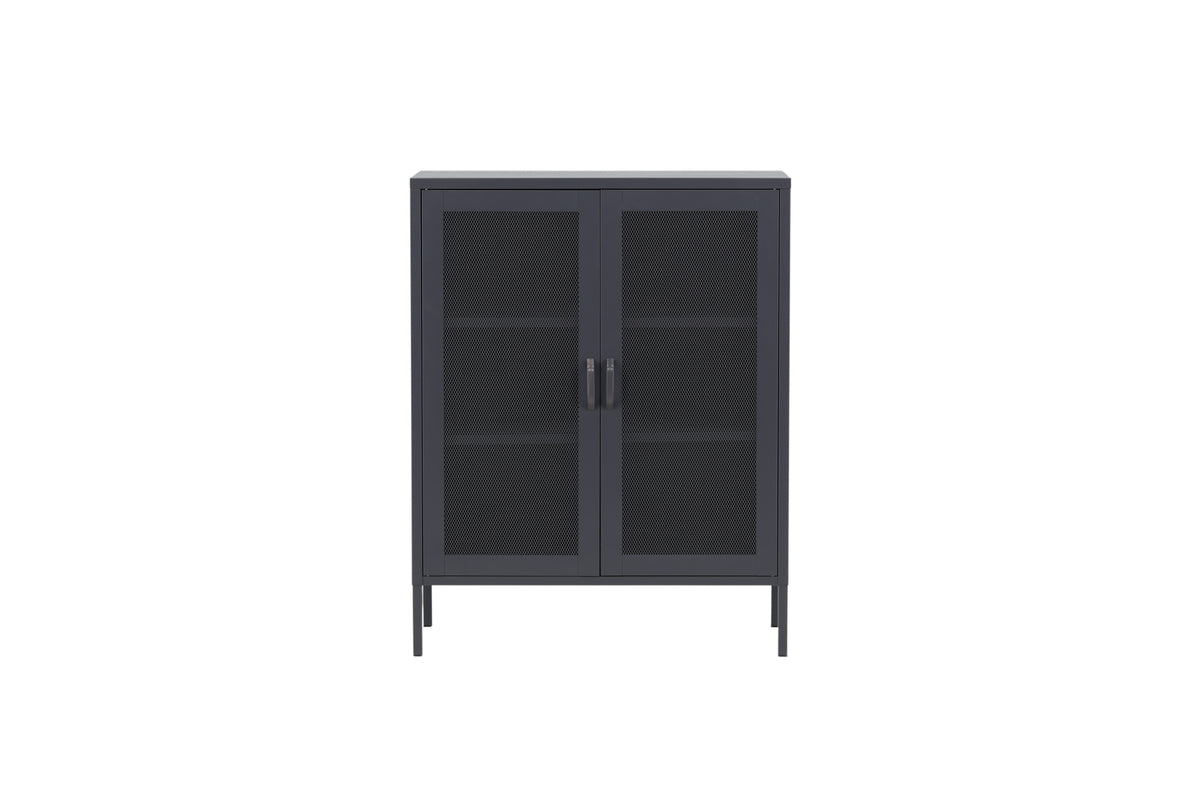 Misha, i et robust industrielt design med lækre netdøre og ben fremstillet i grå pulverlakeret stål med 3 smarte aflastningsflader. Skabet løftes op af smalle, høje ben, som skaber en luftig følelse og letter også for støvsugeren. Det perfekte opbevaringsmøbel til alt, hvad du ønsker - fyld med porcelæn, bøger eller smukke dekorationer. Skabets smidige størrelse gør det let at placere og passer godt ind i de fleste rum i hjemmet, så møbler efter egne behov og ønsker!
