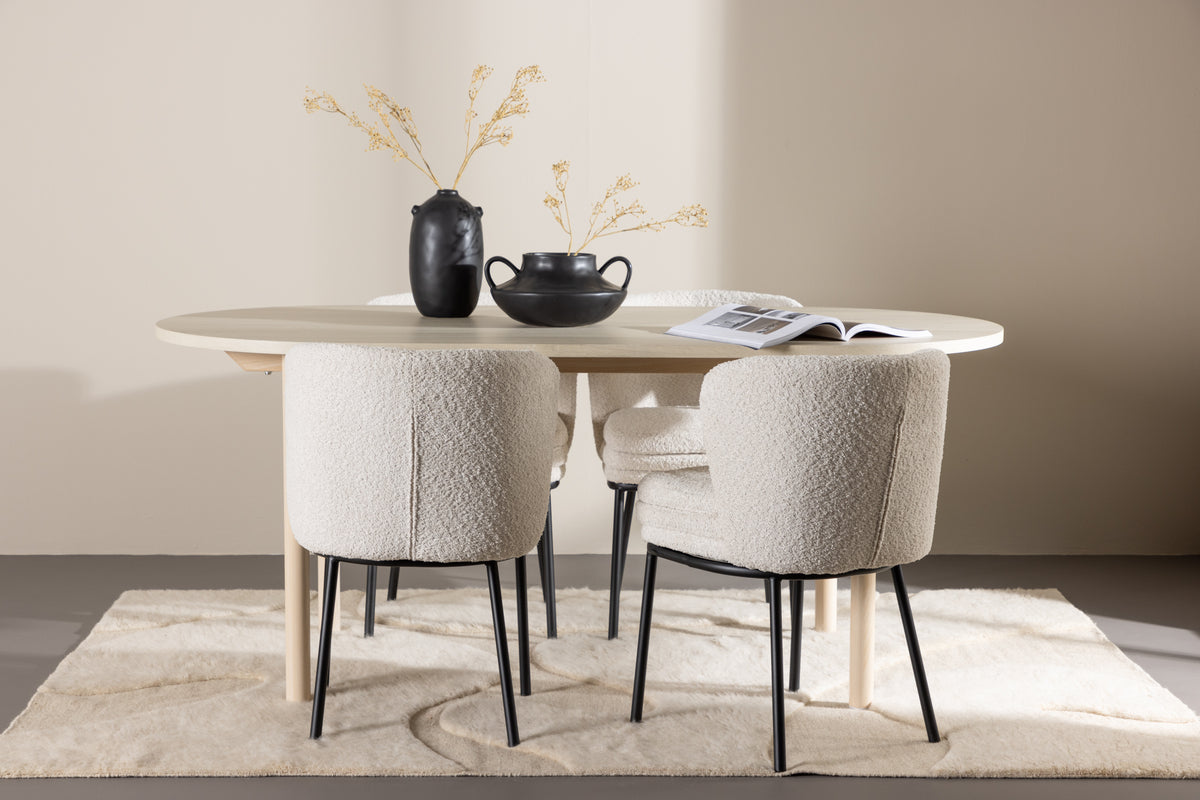 Fuldend dit spisebord med Agnes spisebordsstole, som tilbyder enkel skønhed og stilrent design. Med et sæde i hvid bouclé og elegante sorte stålben, giver Agnes en moderne og sofistikeret æstetik, som komplementerer alle indretningsstile. Det bløde og teksturerede sæde i bouclé giver en varm og indbydende følelse, samtidig med at de sorte stålben tilfører et moderne touch. Agnes spisebordsstole skaber en harmonisk atmosfære og giver dit spiserum eller køkken en imponerende visuel effekt. Med sit stilrene design og komfortable sæde er Agnes spisebordsstole det perfekte valg til at samles omkring middagsbordet med familie og venner.